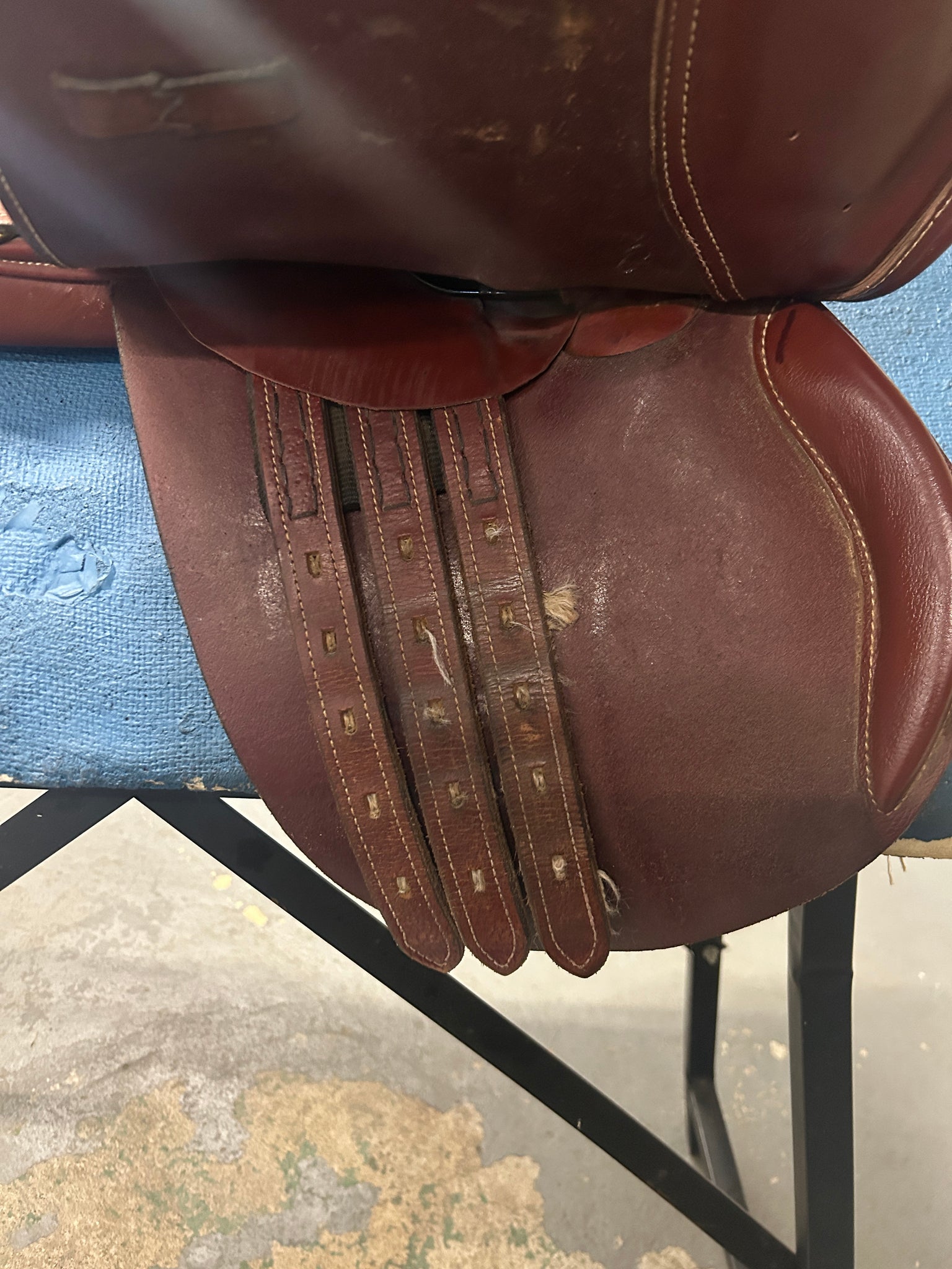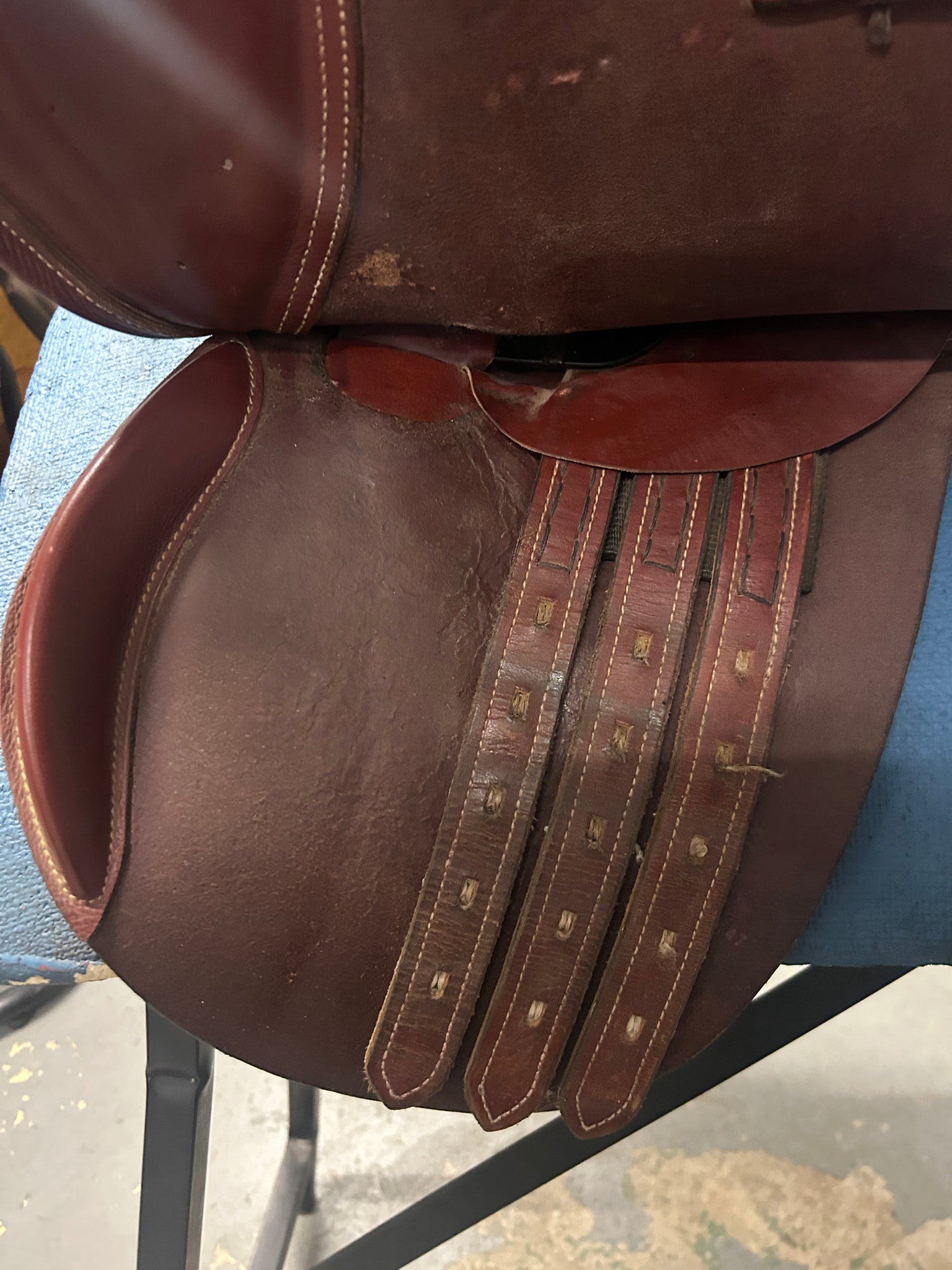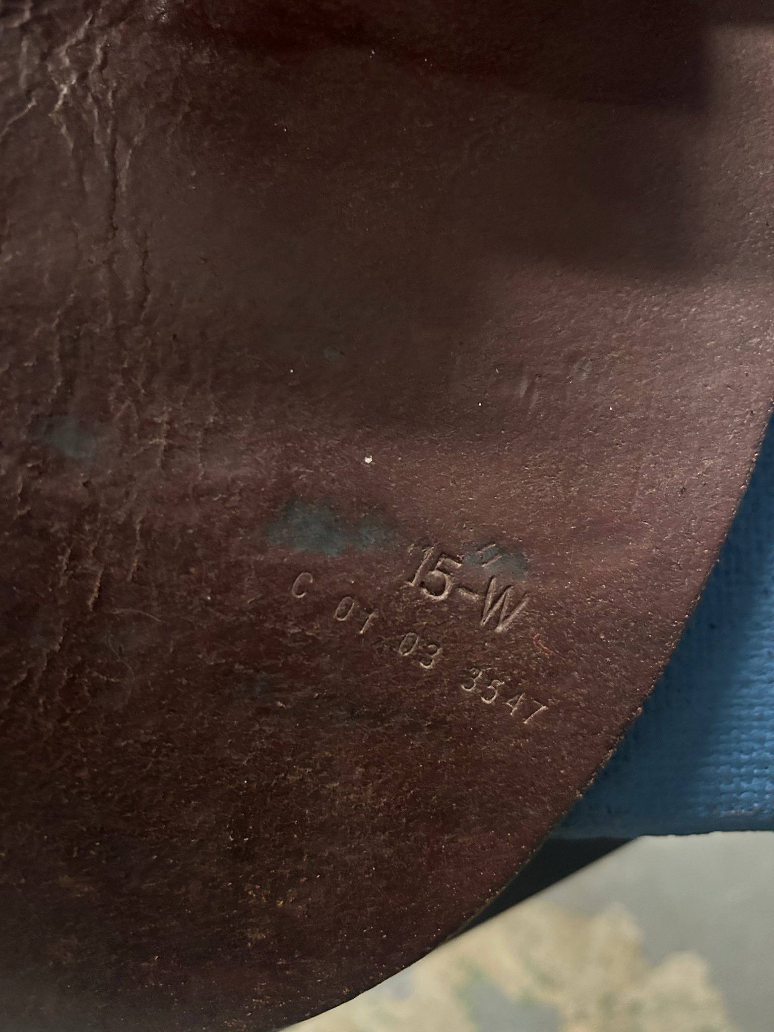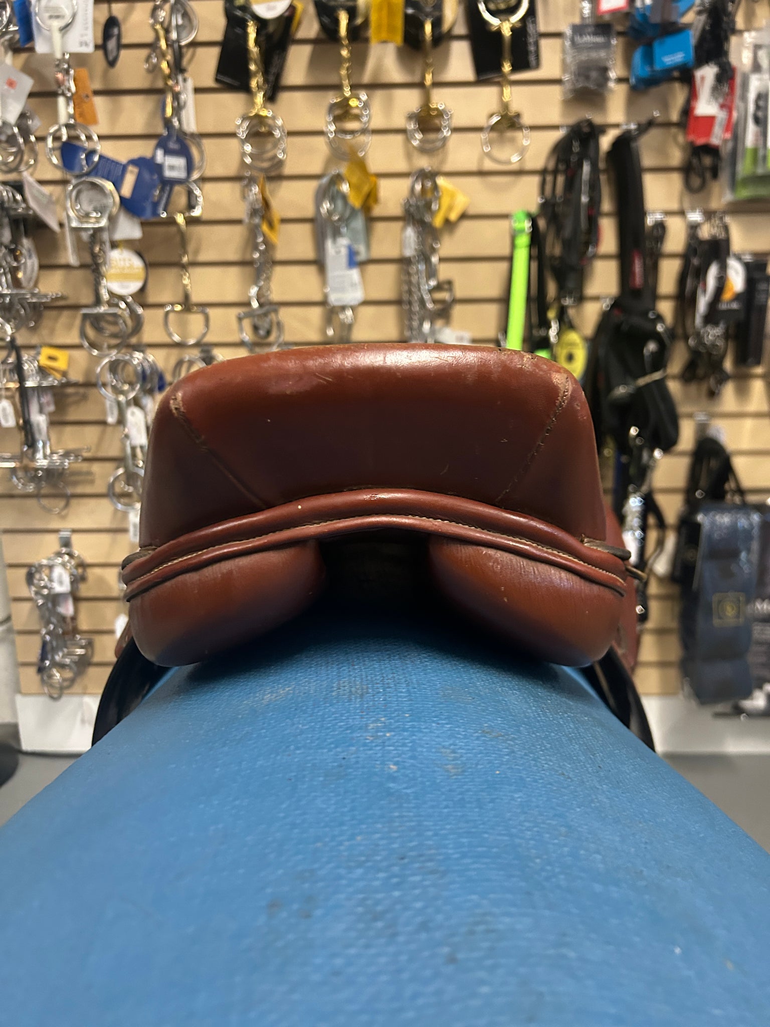 Perfect first saddle or for a lesson barn! This is a decent little saddle with a 15" seat. Stamped with a wide tree, it measures closer to 4.5" at the top of the panels, but has a decent spread to the bars. This saddle has some scratches from being a kid's saddle, but overall, it is in decent shape.