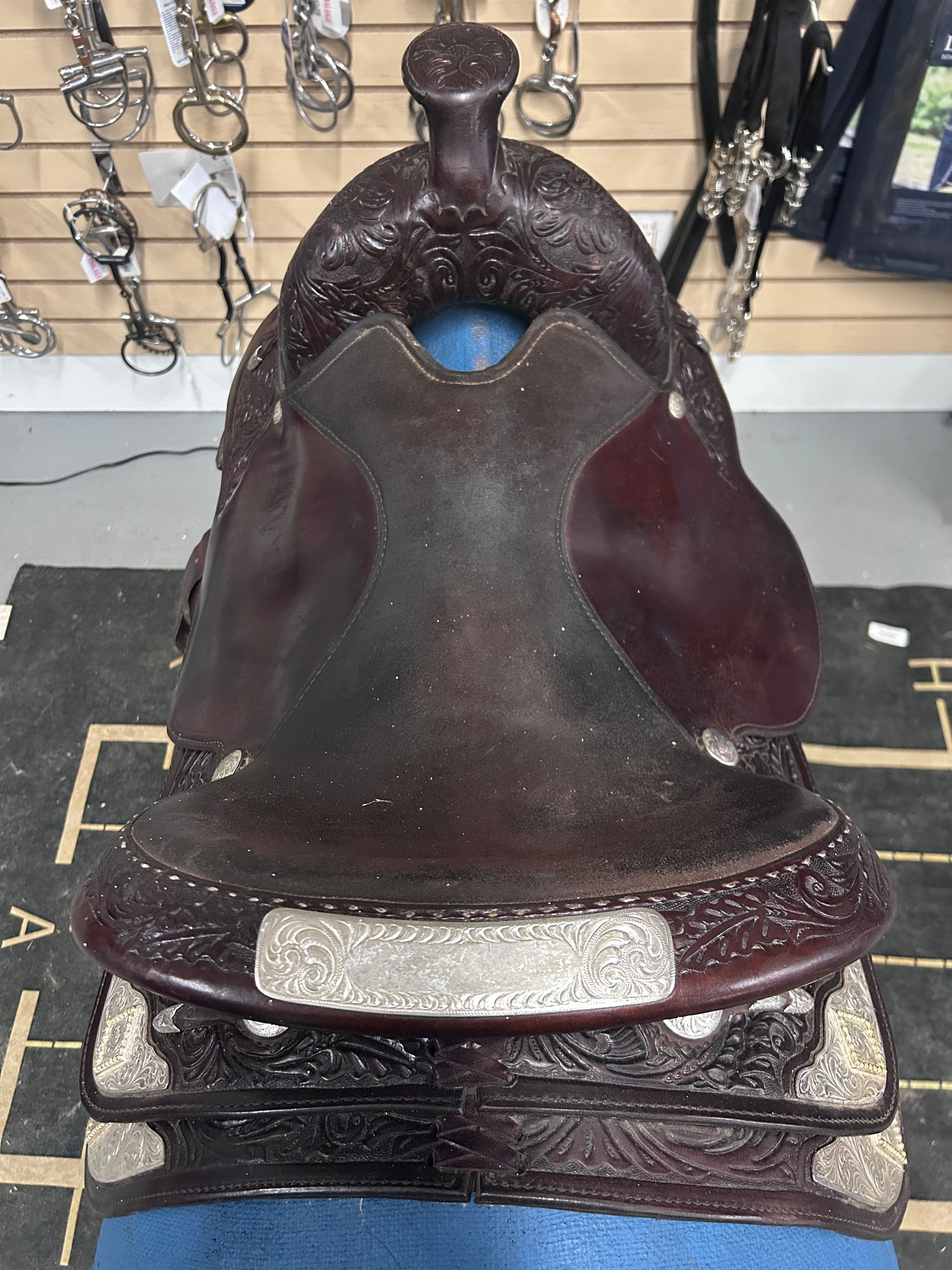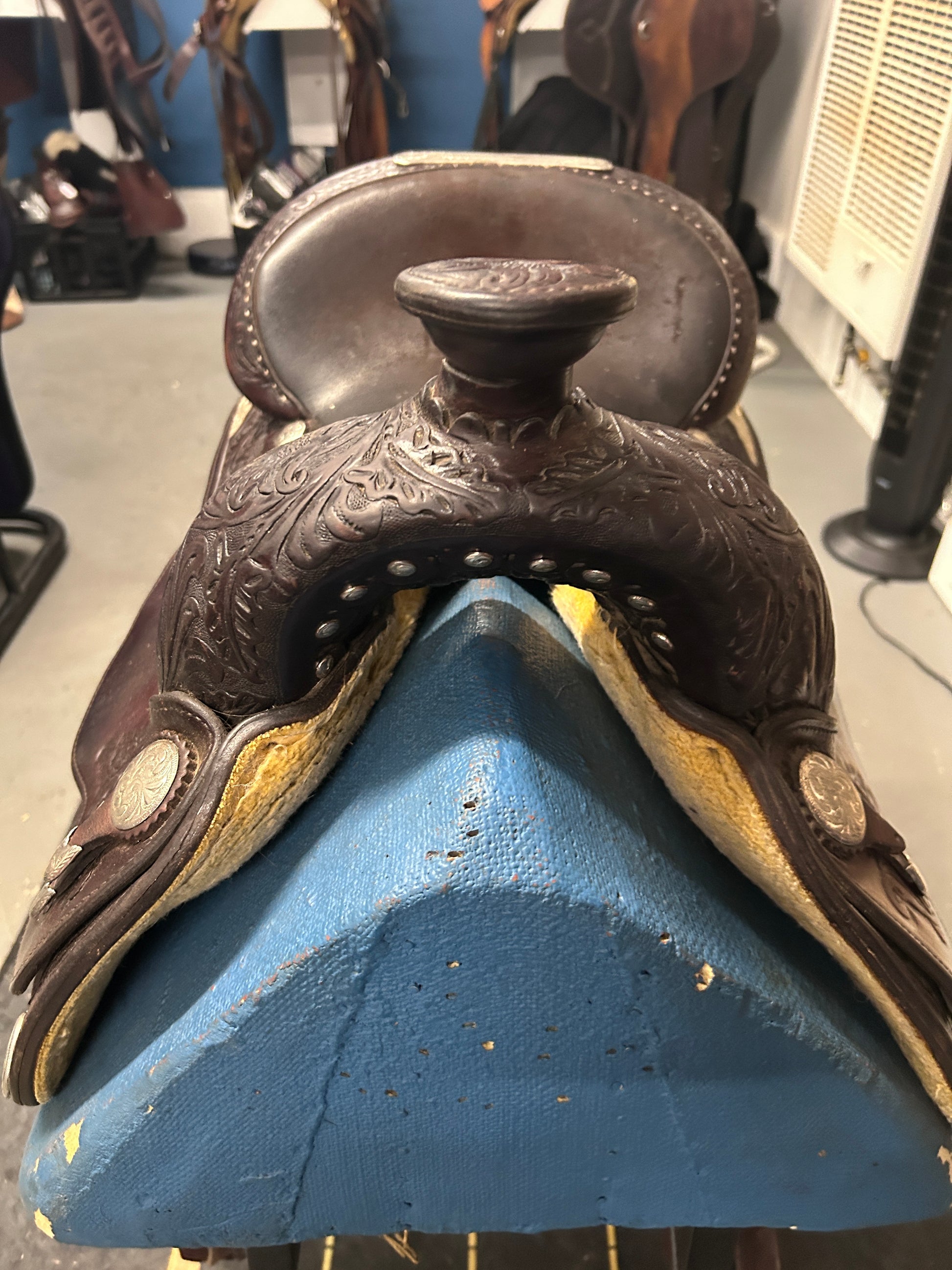 A beautiful and eye-catching 16" Circle Y Western Saddle in rich dark oil leather. This saddle features stunning silver diamond detailing and a well-balanced equitation-style seat, making it both functional and elegant in the saddle.