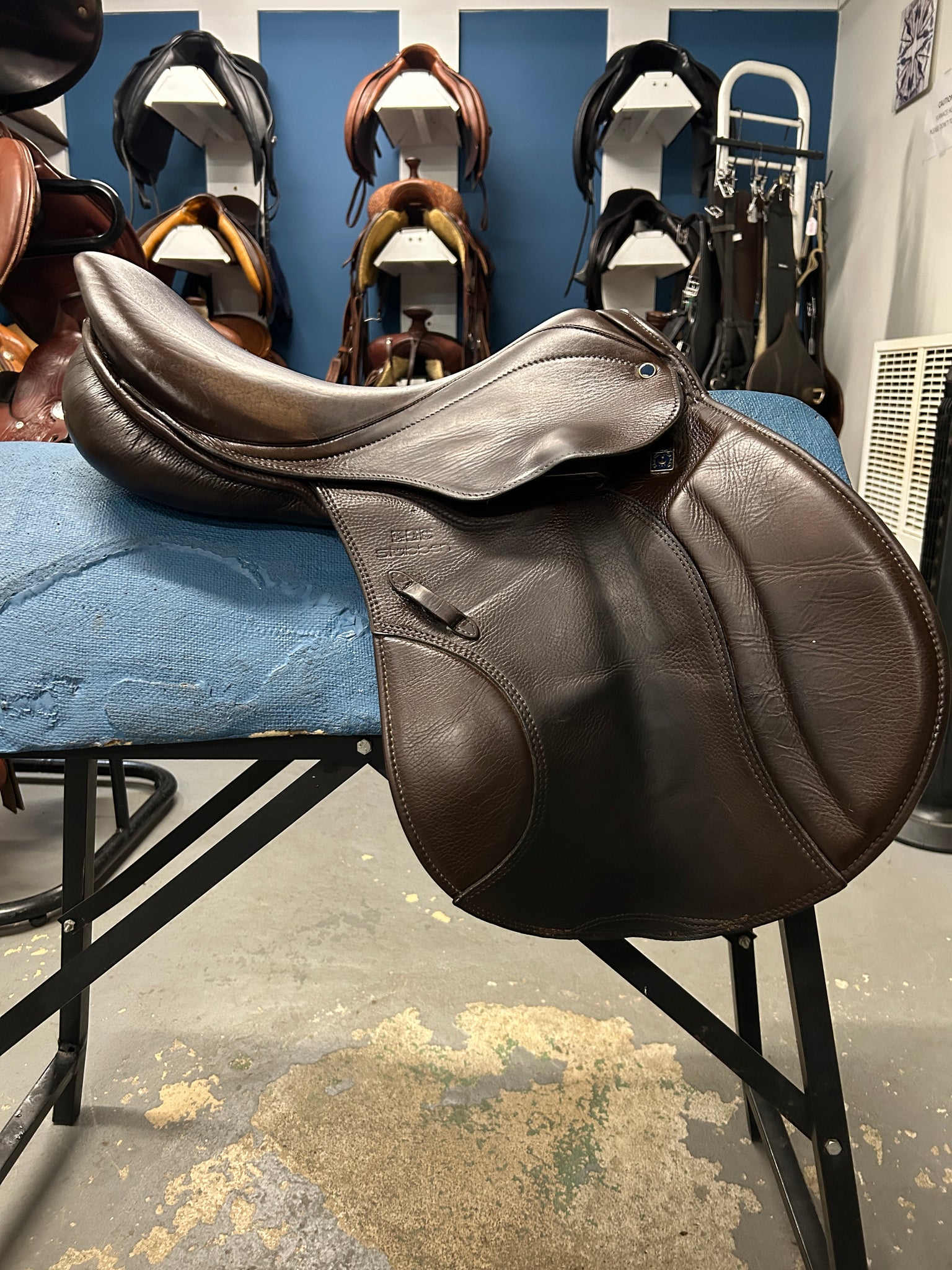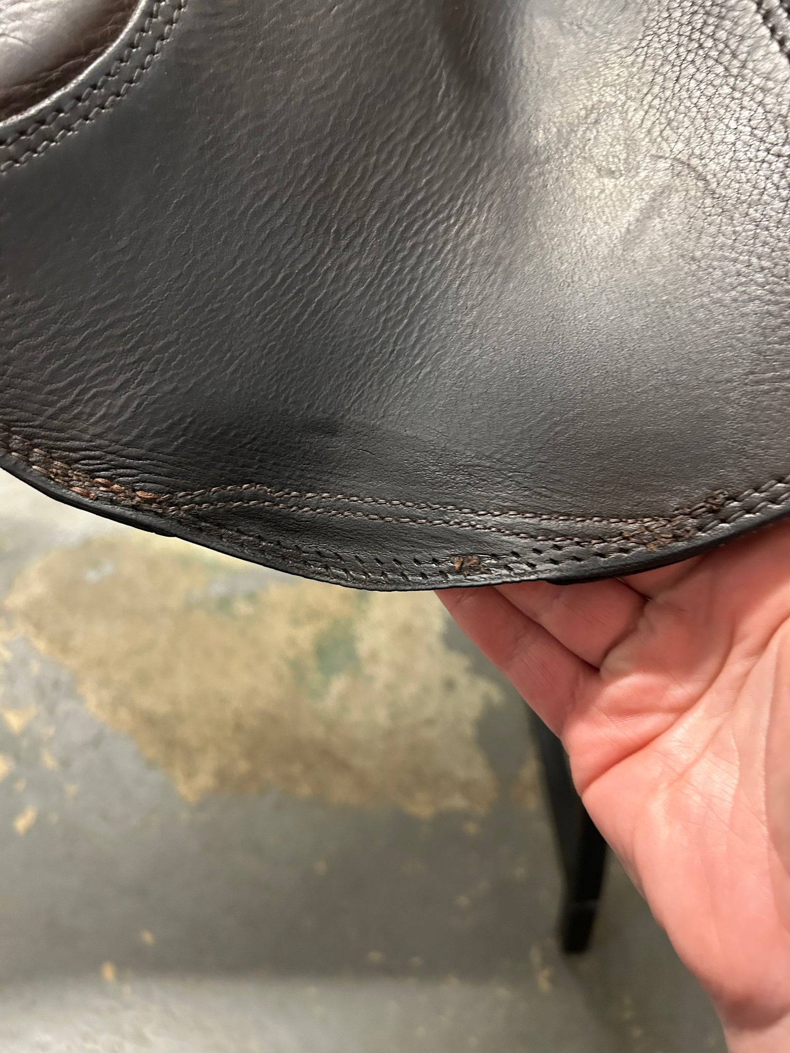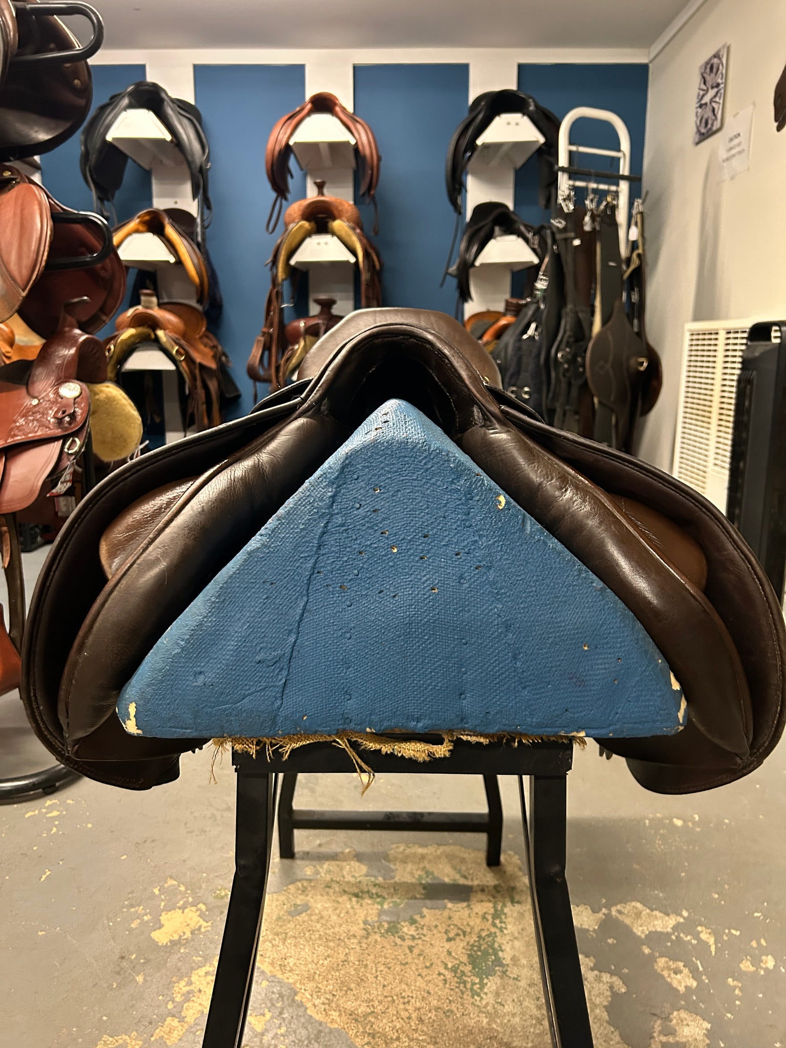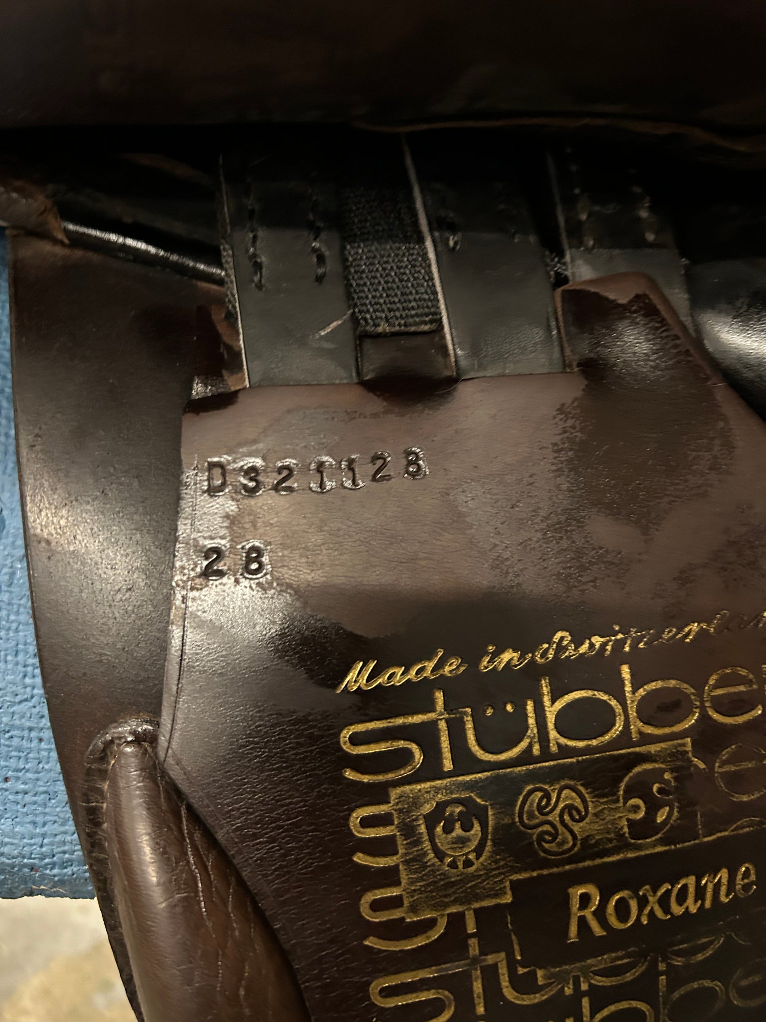 Excellent quality saddle! Ideal for a long-legged rider. This 17.5" Stubben Roxanne saddle is in excellent condition. Well designed with wool flocking, and an open headplate to allow for lots of clearance around the wither. Flaps measure 14" x 14". Estimated medium/wide gullet, but is stamped for a 28 cm tree, unsure if it has been adjusted though. Stamped D321128. This saddle has a small amount of wear on the right flap but has been repaired. Comes with leathers and irons.
