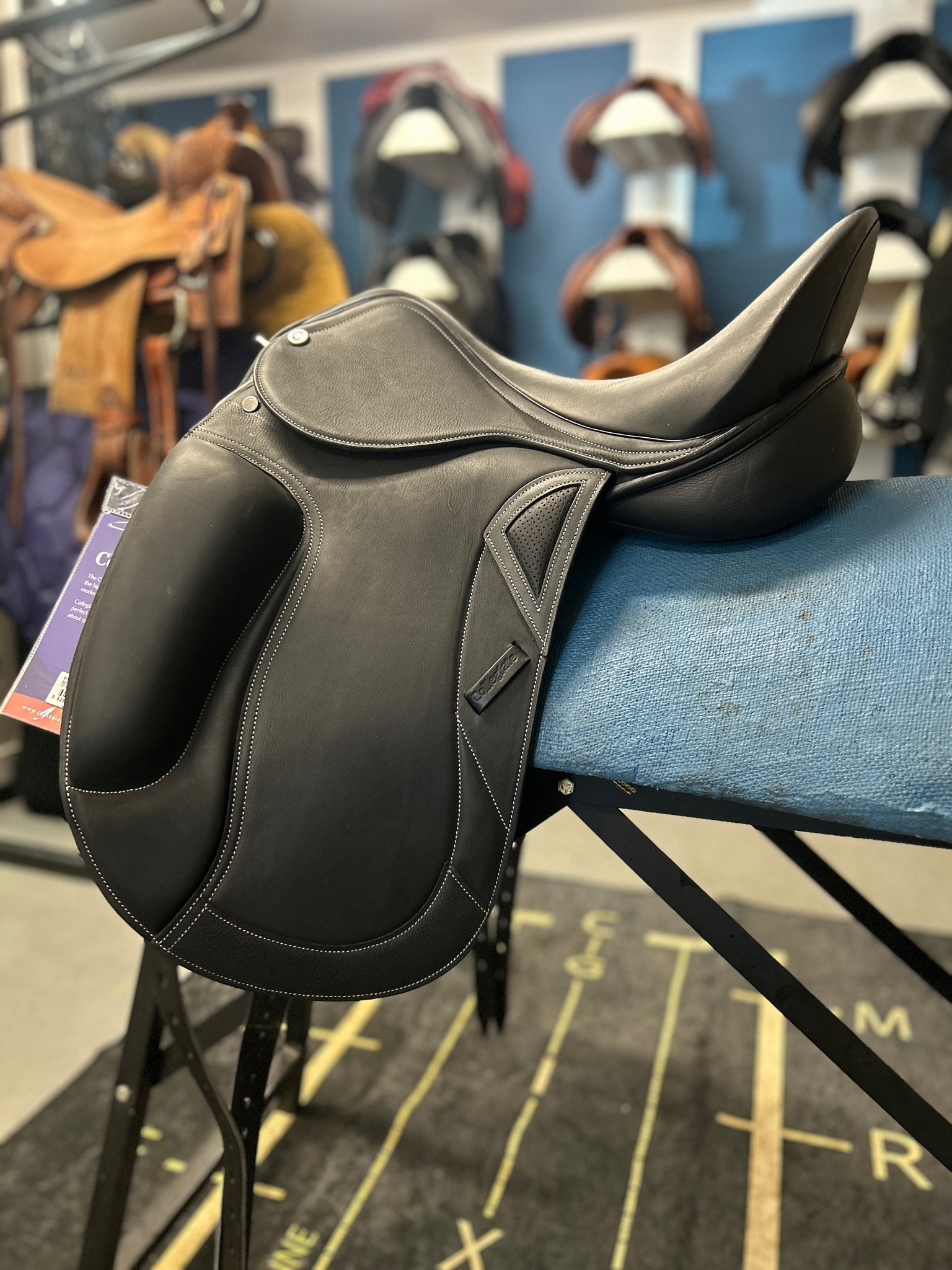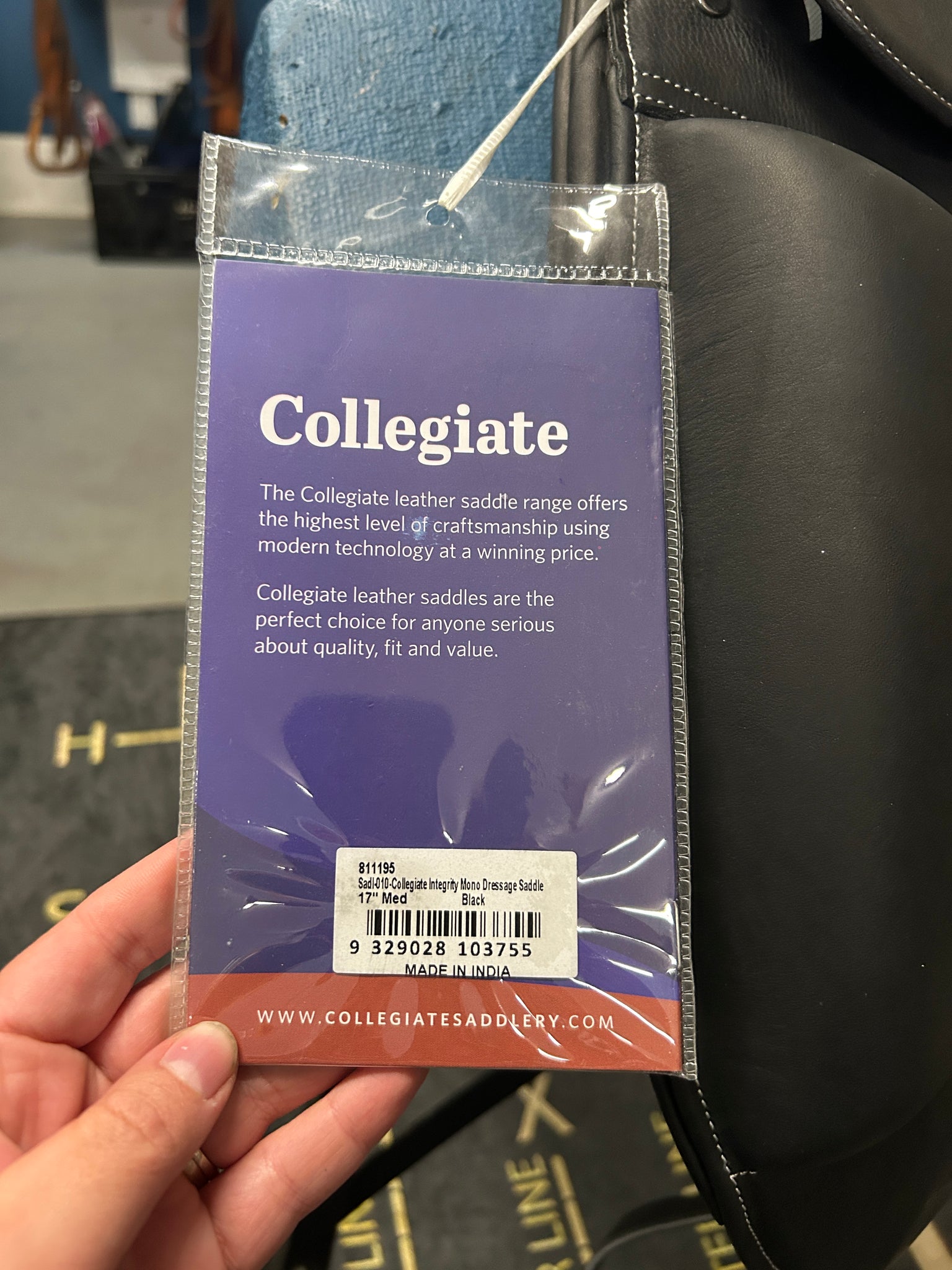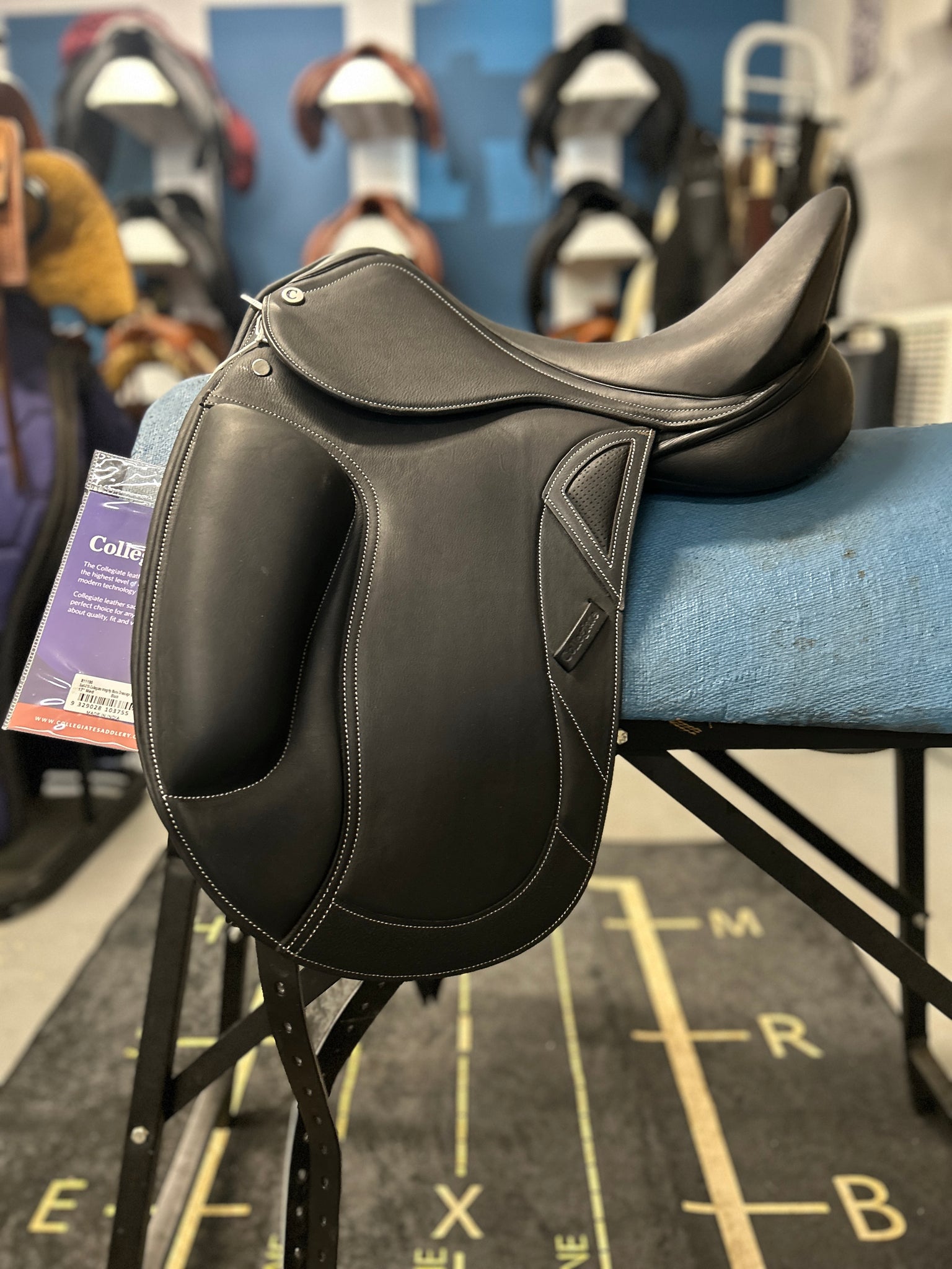 This 17" Collegiate Integrity Mono Dressage Saddle is BRAND NEW with tags! Enjoy a close contact feel between horse and rider thanks to its monoflap design. Generous surface blocks and a deep seat ensure additional rider security. This saddle also features attractive contrast stitching and a leather wear patch. This Collegiate model is compatible with the Opti-Fit Series III gullets, and comes with the Medium.