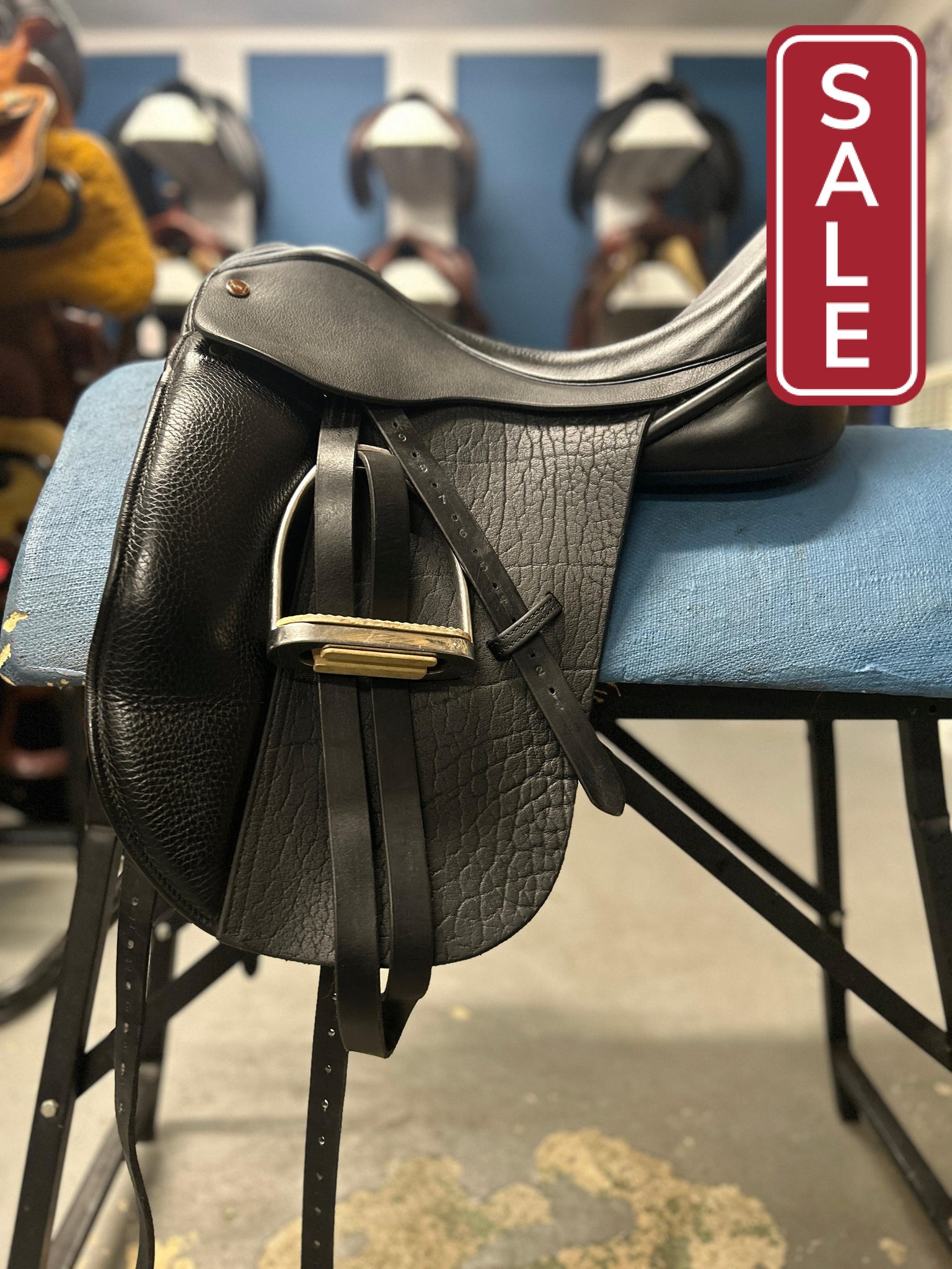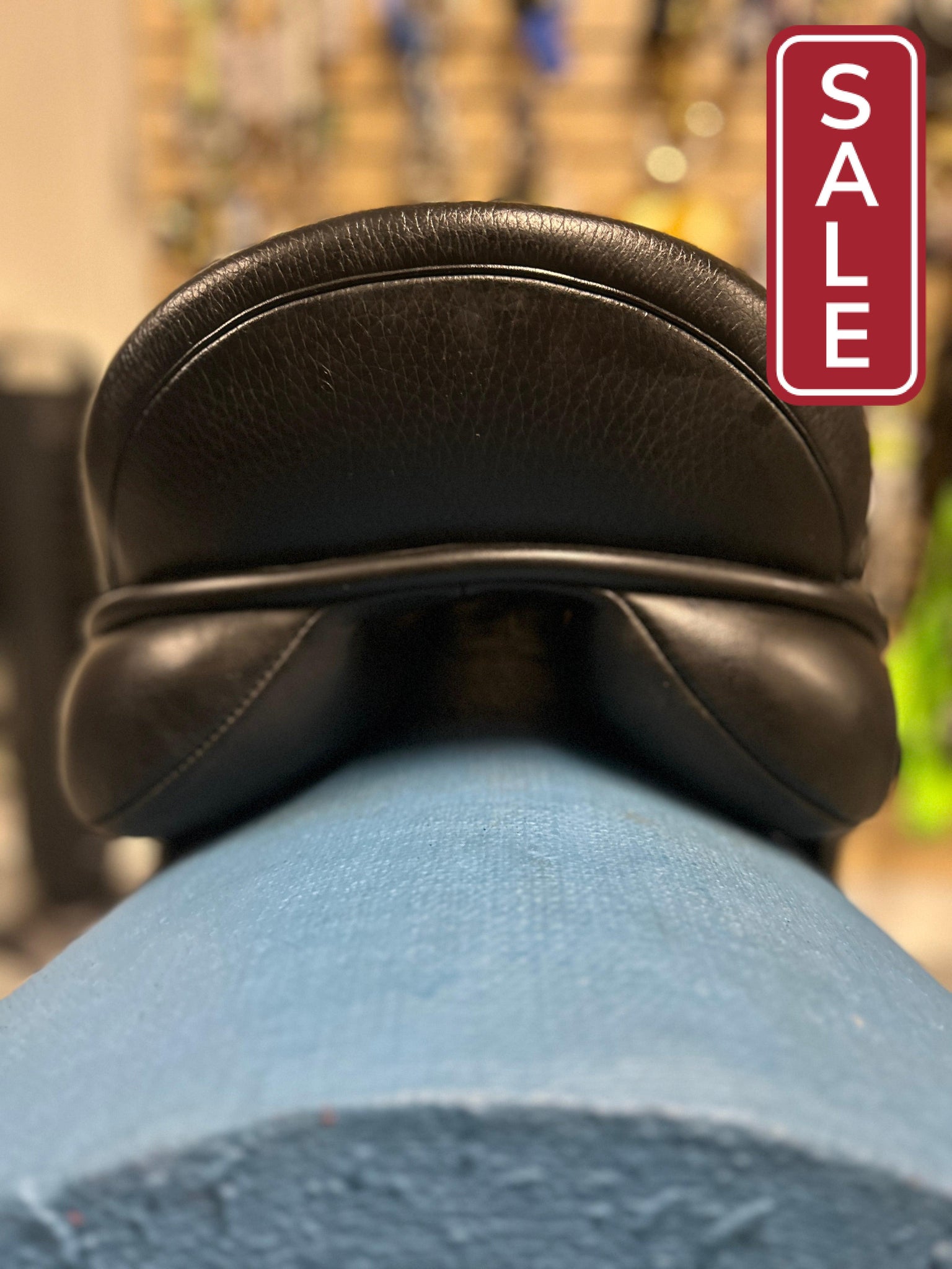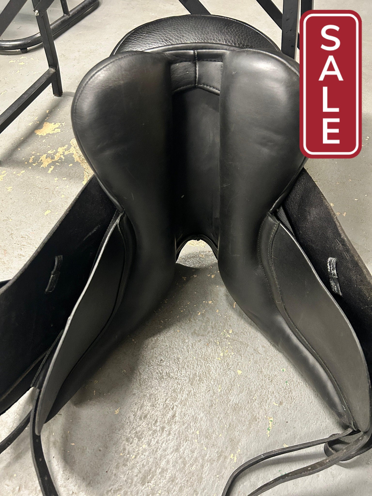 Pristine 18" NSC Dressage Saddle. It was bought in 2022 and has had very little use since. This saddle is stamped with a Medium/Wide adjustable tree, with an estimated 5-1/4" gullet. It is designed with buffalo leather, wool flocking, and a generous gullet for spinal clearance. Flaps measure 16.5" down and 13" across. Serial number 48432. Comes with leathers, irons, and an NSC Saddle Cover.