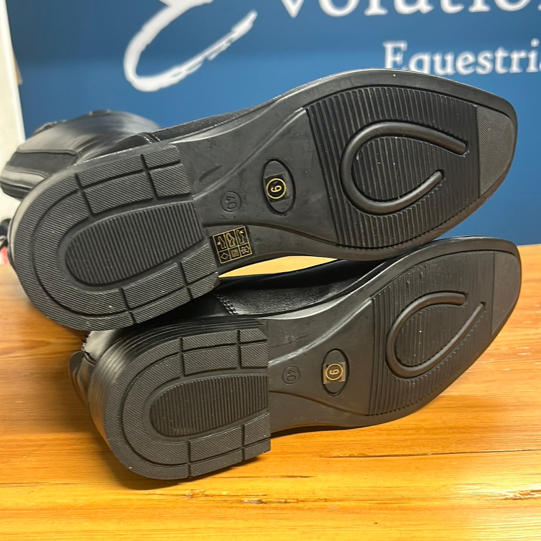 Auken Verona Synthetic Field Boots 9 Wide. Zipper up the back. All-weather construction, with a synthetic and waterproof design. Features an elegant Spanish topline with a snap cover for the zipper. Complete with a breathable polyurethane and waterproof sock bottom to help keep feet dry and comfortable.