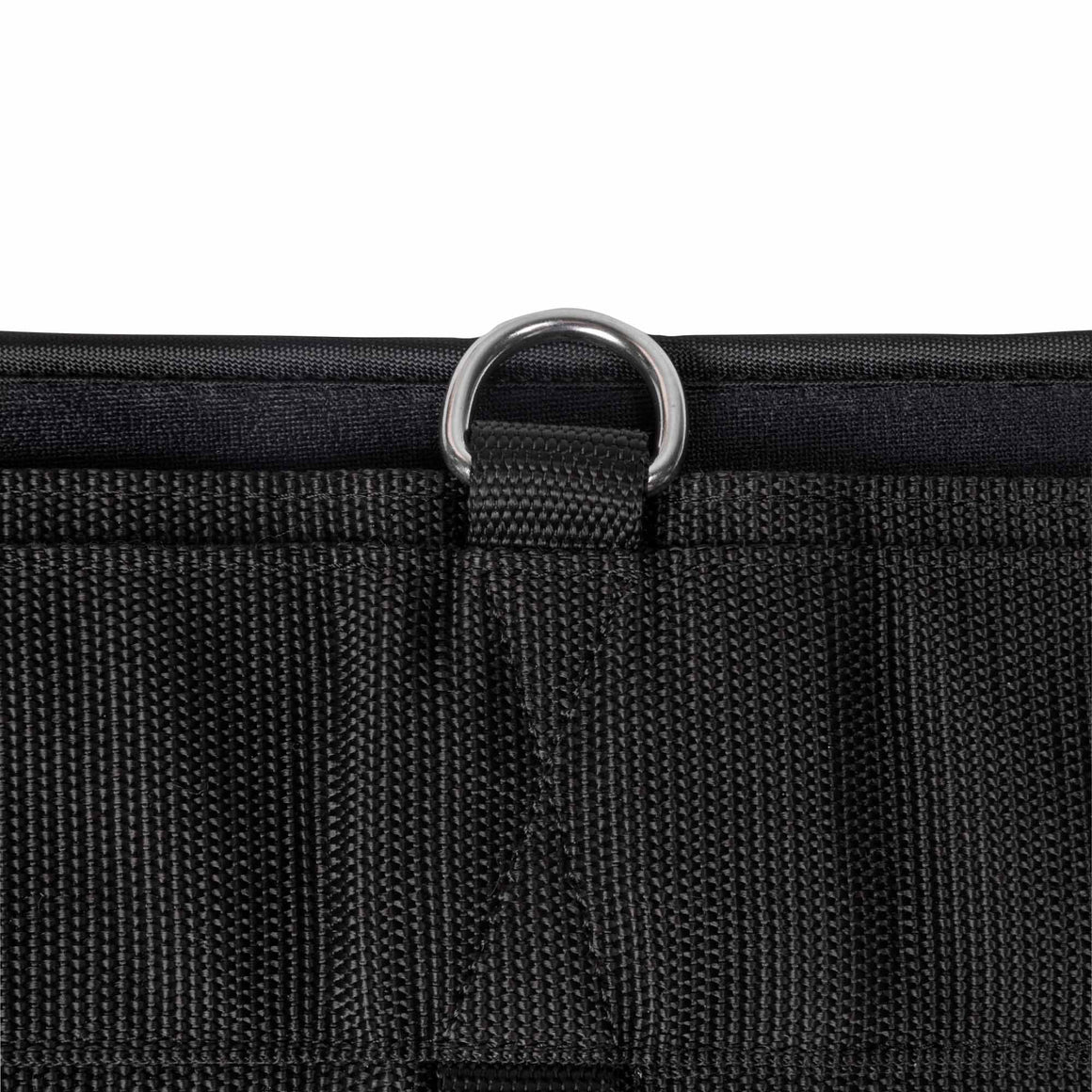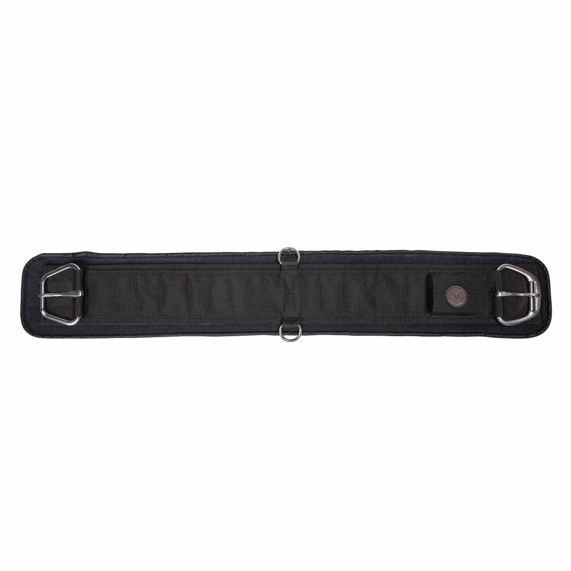 The cinch has a stainless steel roller buckle, keepers to collect the straps from the saddle. Two smaller D rings for attaching other equipment to.