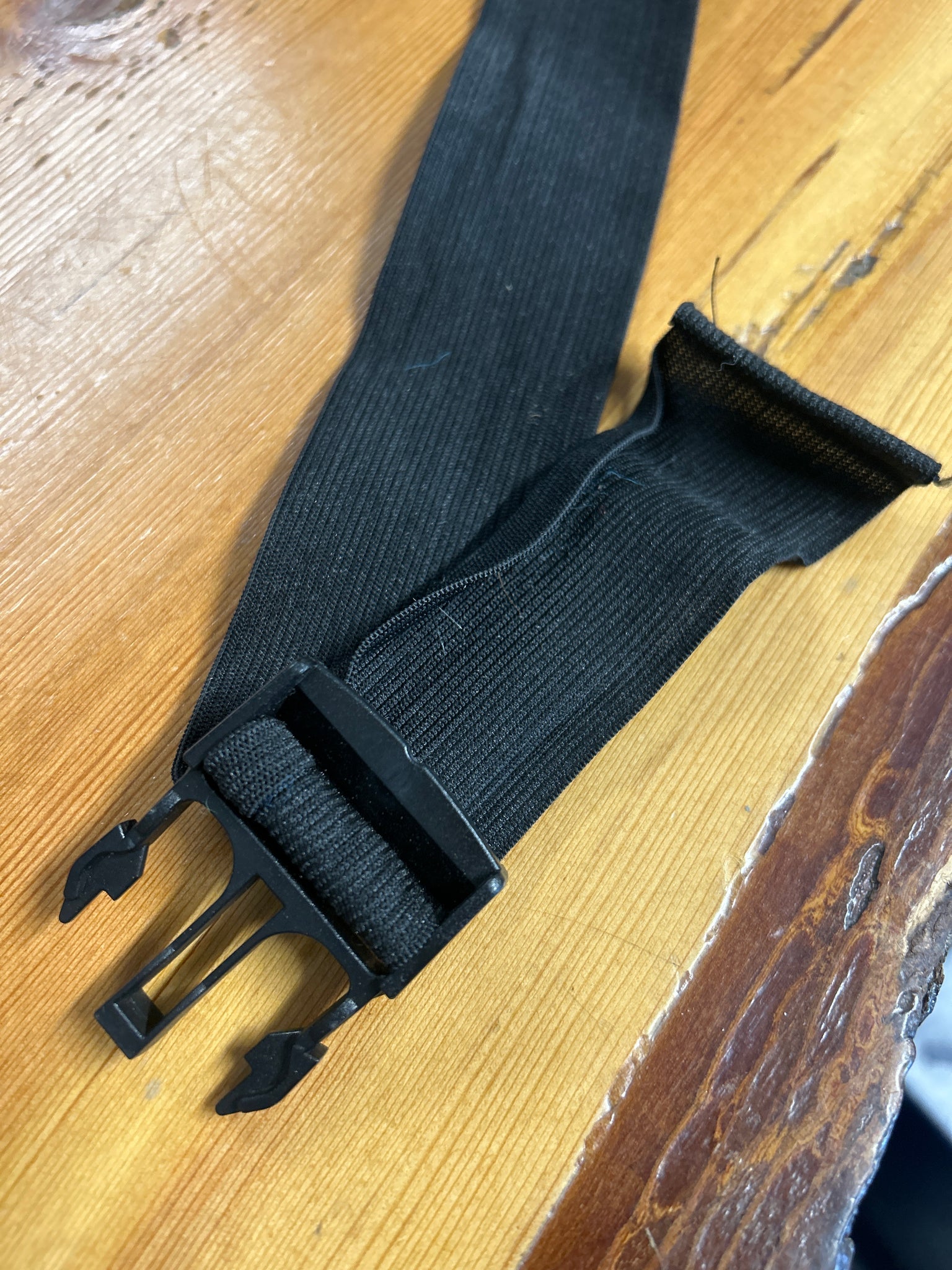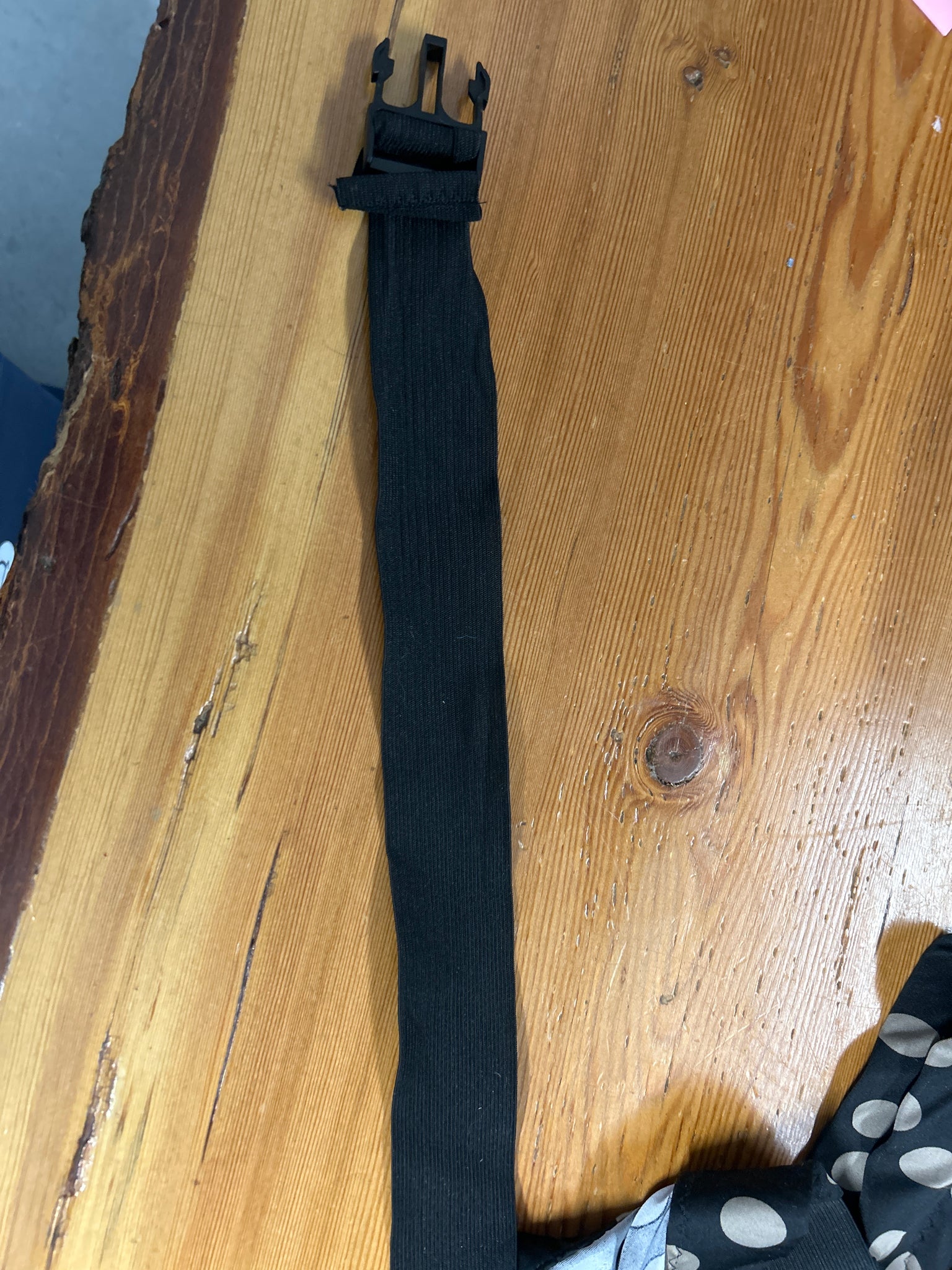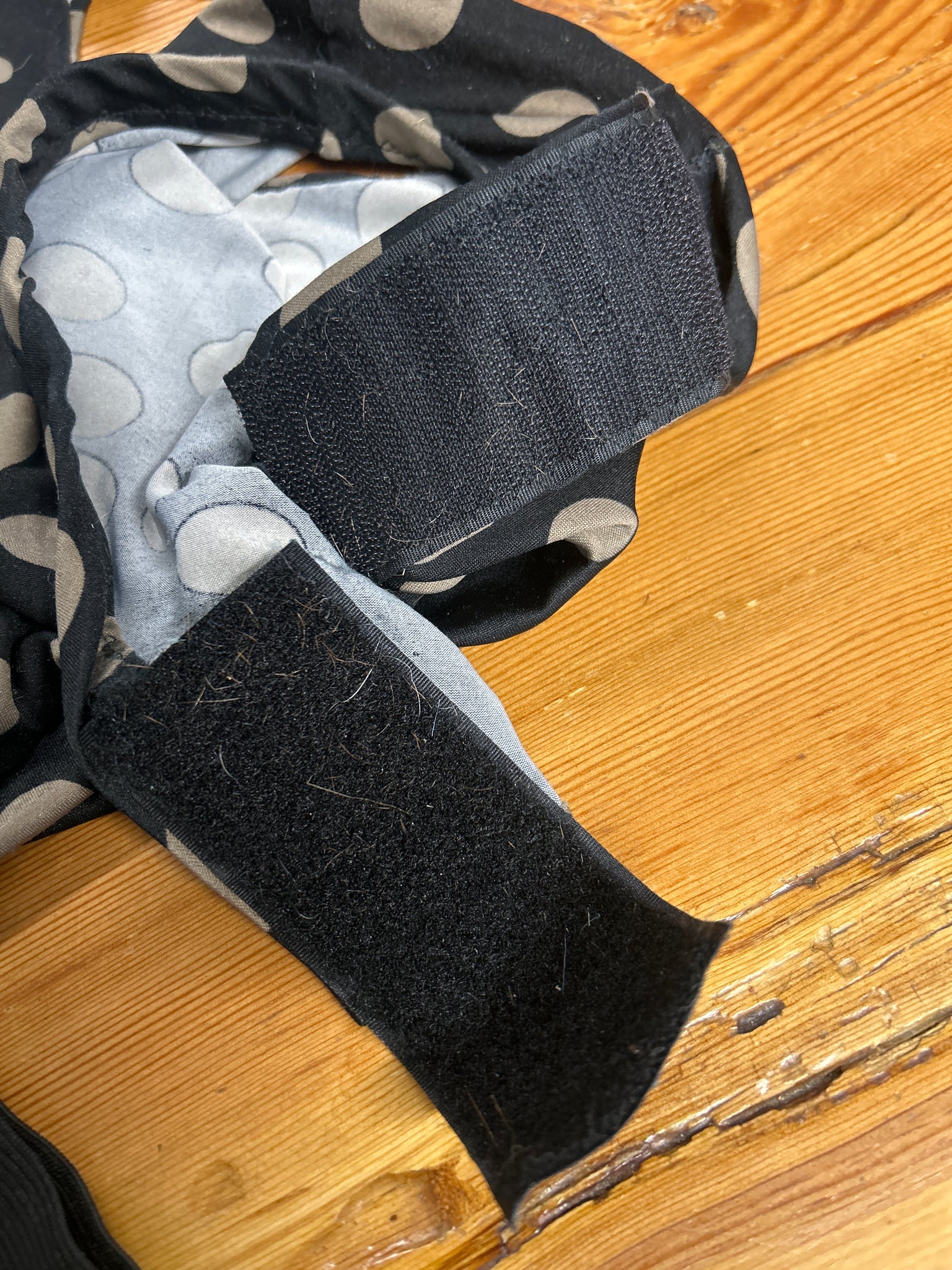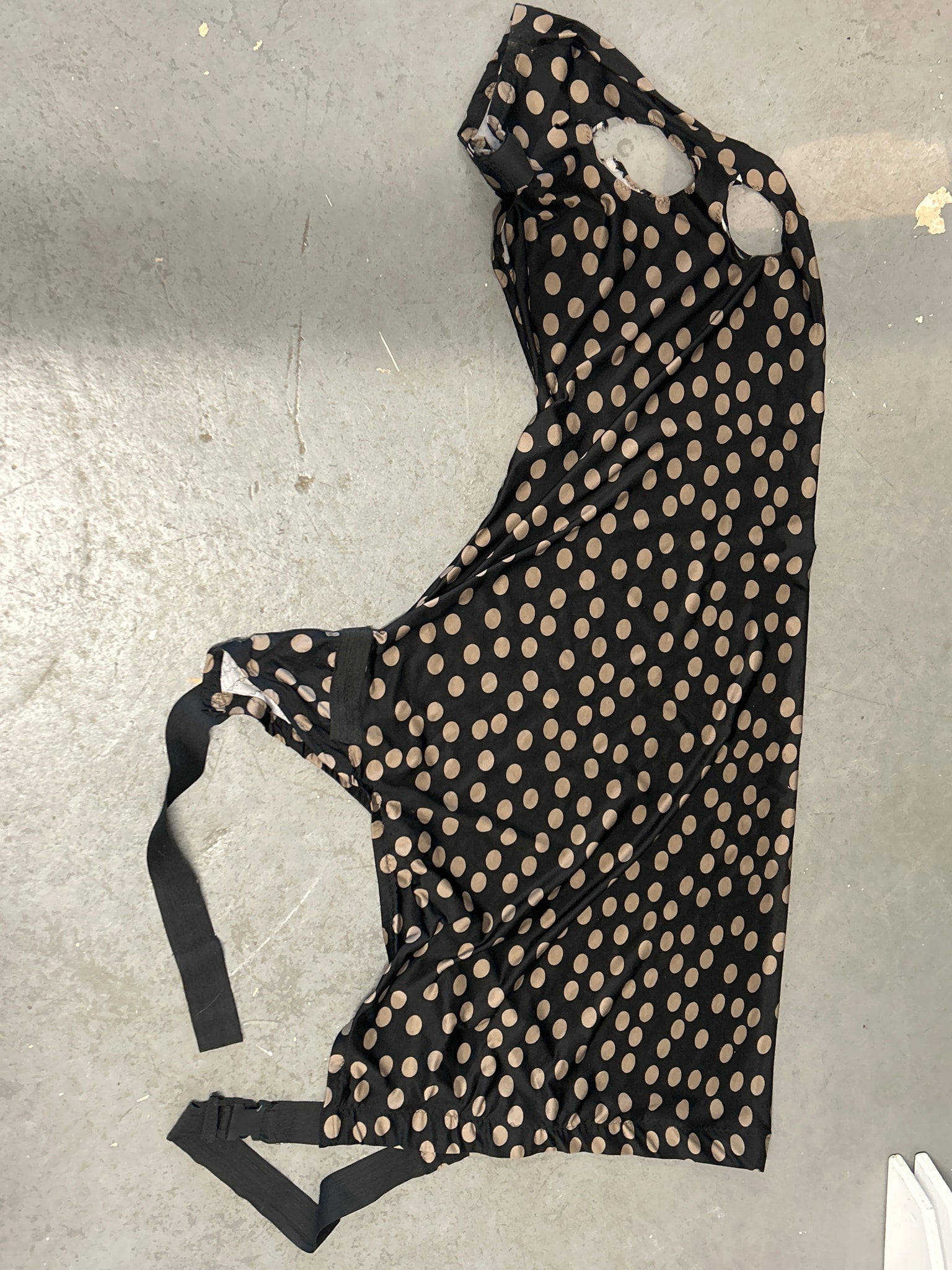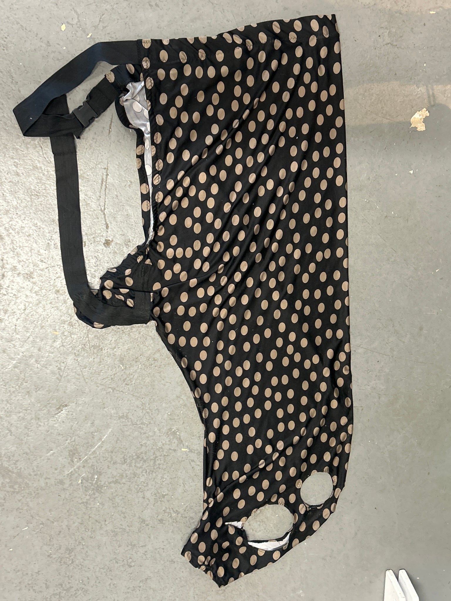 Black and Tan Poka Dot Slinky. Estimated Horse size. Pull-over style, no zipper. It has a rip on the right eye, but it is in decent condition.