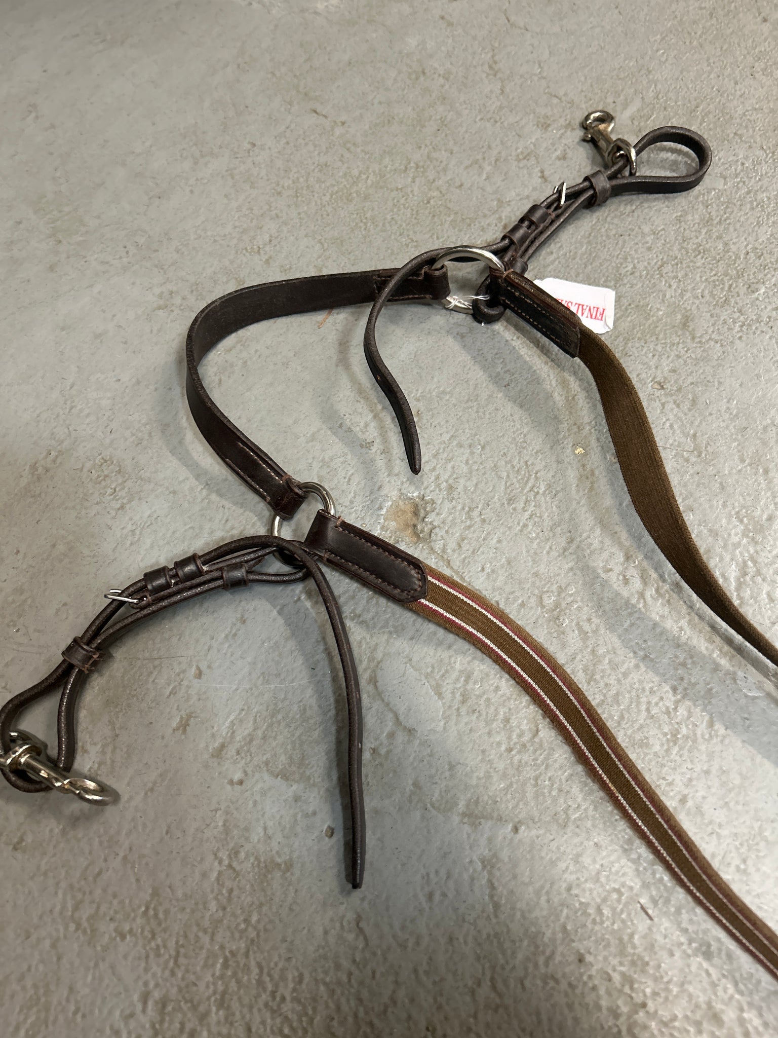 Brown leather elastic breastplate. Brown, Red and White Stripes down the elastics. Snaps onto the saddle's dee's.