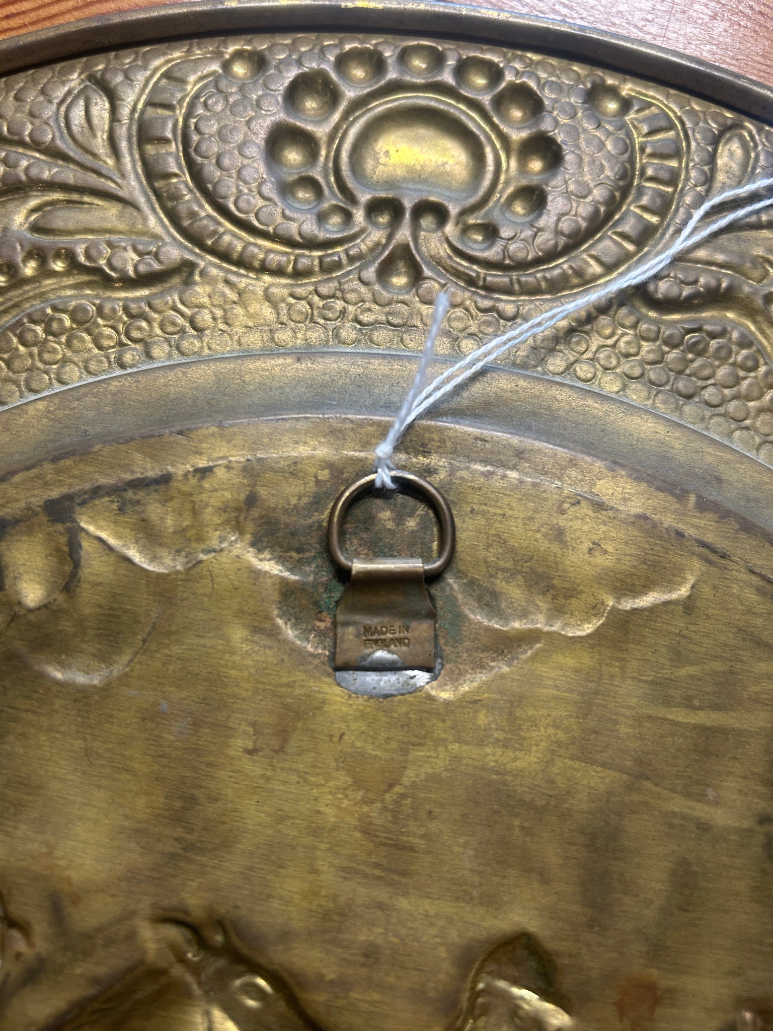 Crafted from lightweight metal with a polished brass finish, the plate is framed by an ornate border with scrolling detail, florals, and cornucopia-style accents. Whether you're styling a rustic tack room, vintage-inspired home, or simply looking for a conversation piece, this wall-hanging plate offers timeless appeal without the high-end price tag.