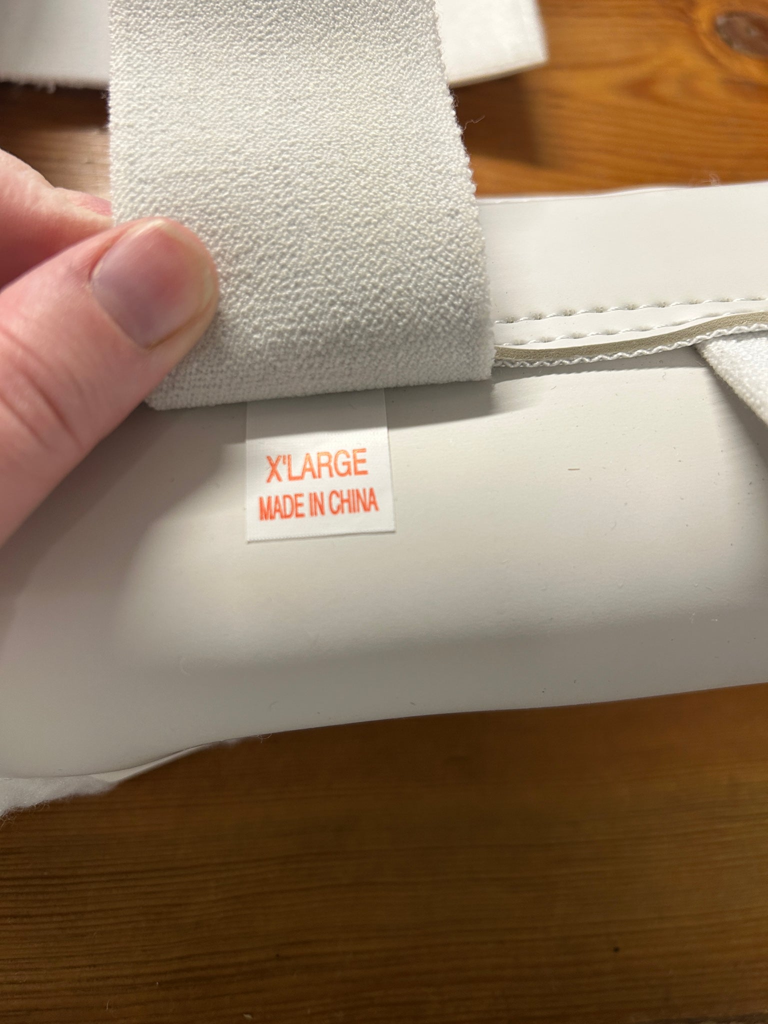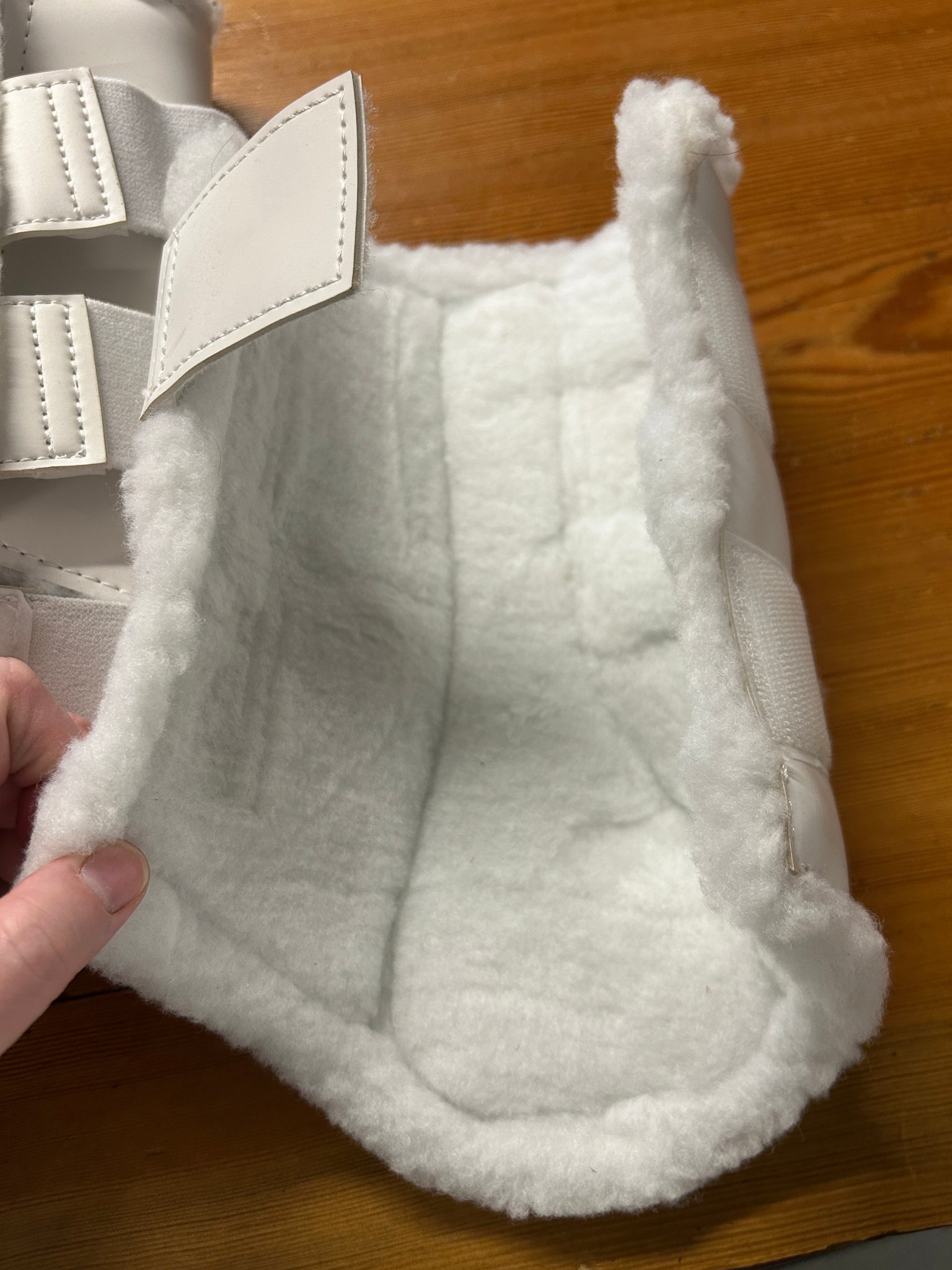 Sparkling white Dressage Sport Boots. 2 Velcros. Labled XLarge. Measures 11" tall and 11" around.