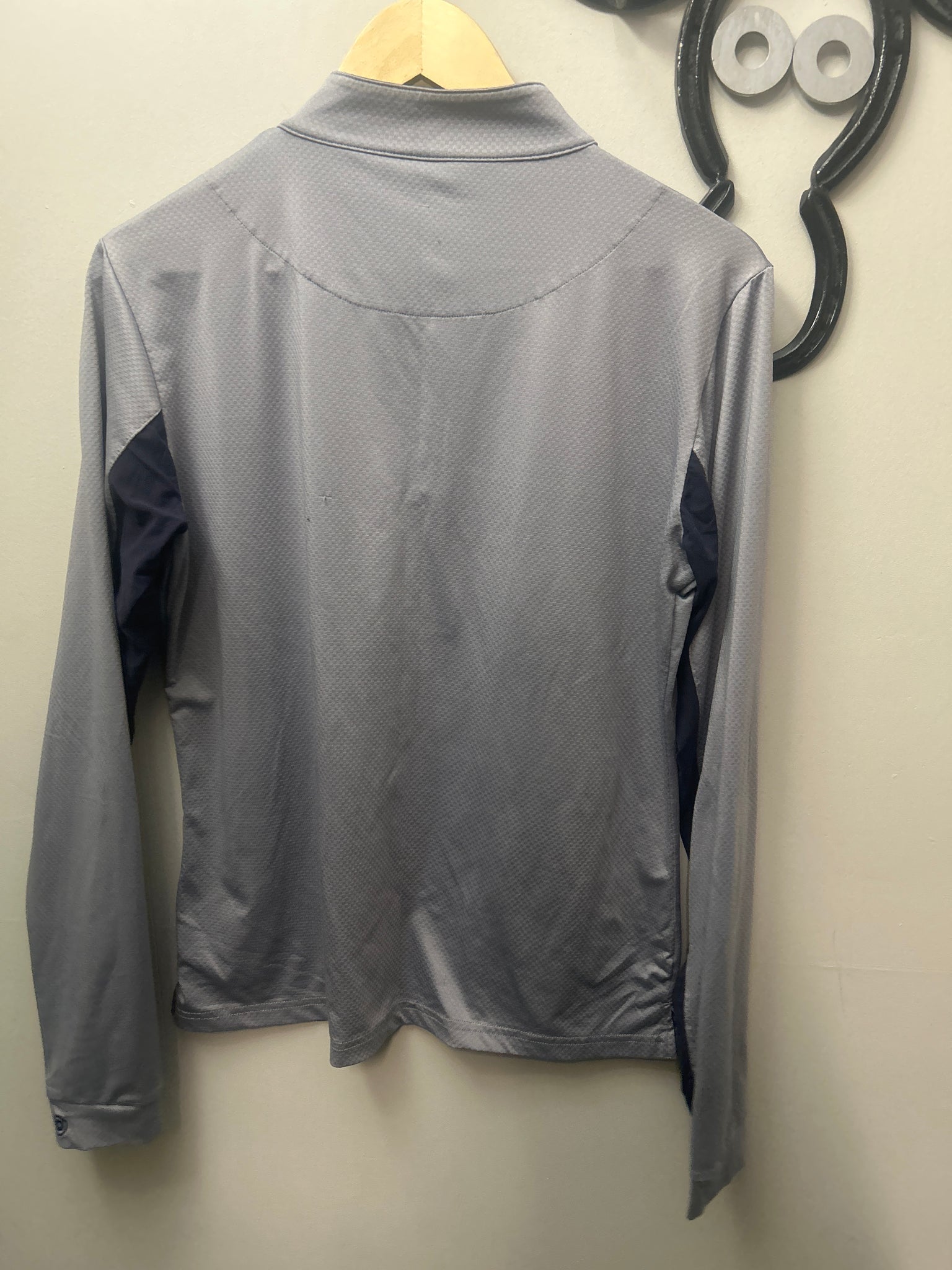 Dublin Grey Quarter Zip Shirt with Navy accents and navy venting under the arms. Good used condition.