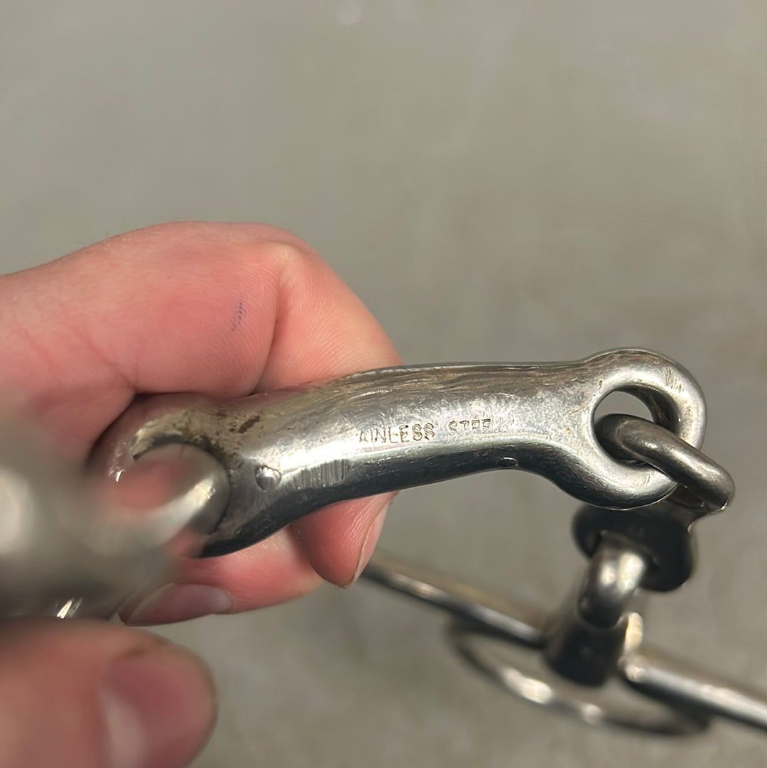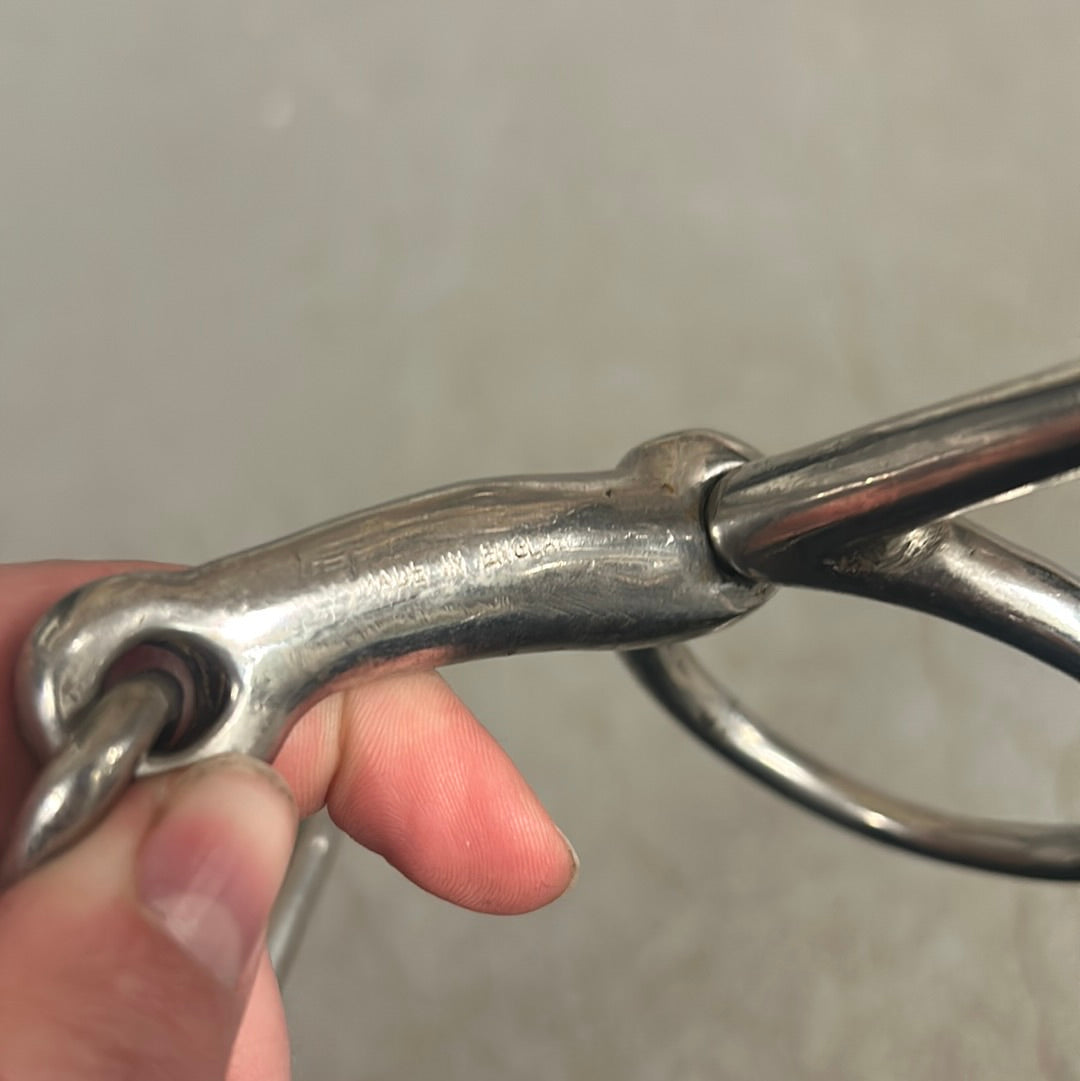 Eldonian French Link Full Snaffle. Estimated 14mm thickness. Cheeks measure 6.5" / 170mm. This bit has a decent weight and feel to it. Handmade in England. Quality Stainless Steel. This is an older bit from before Jefferies bought the company.