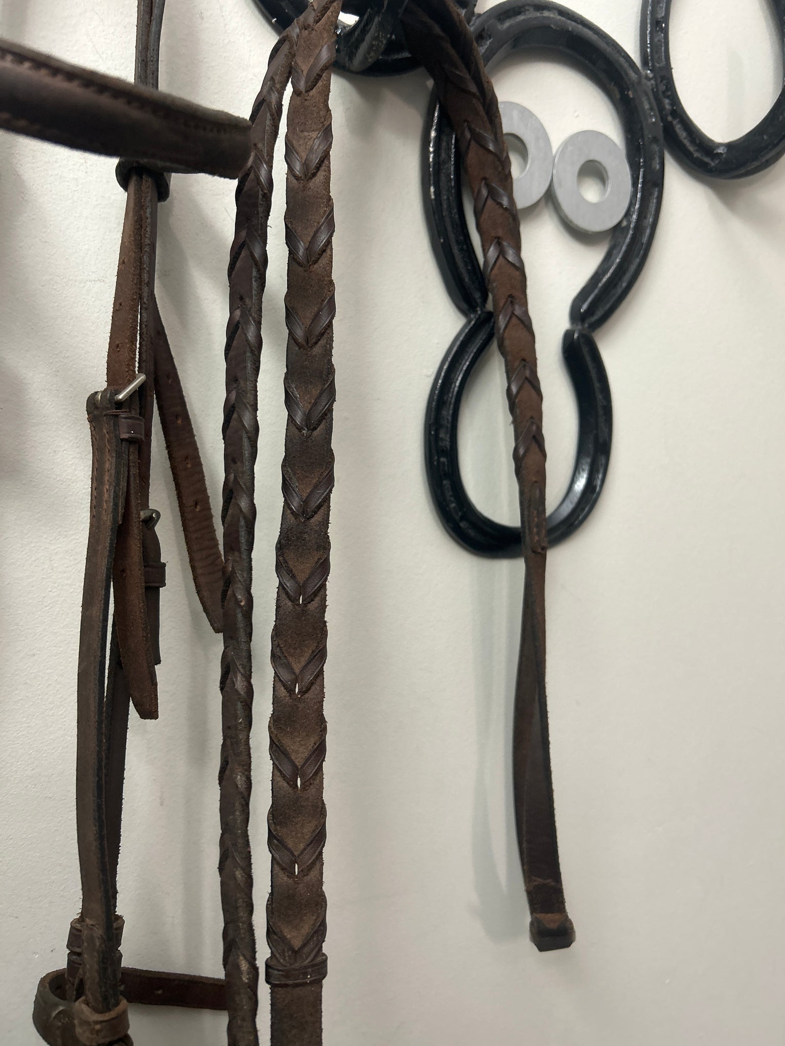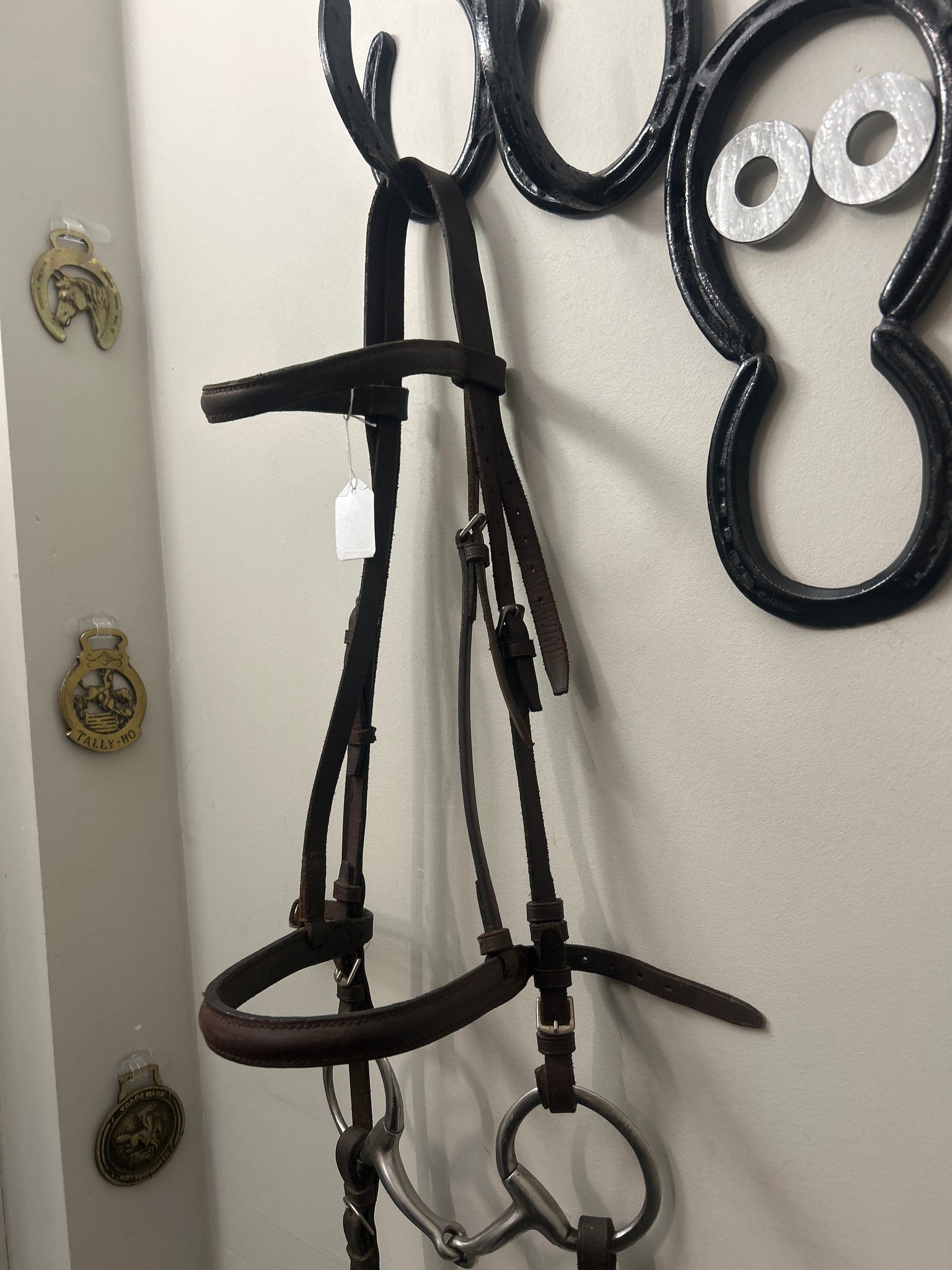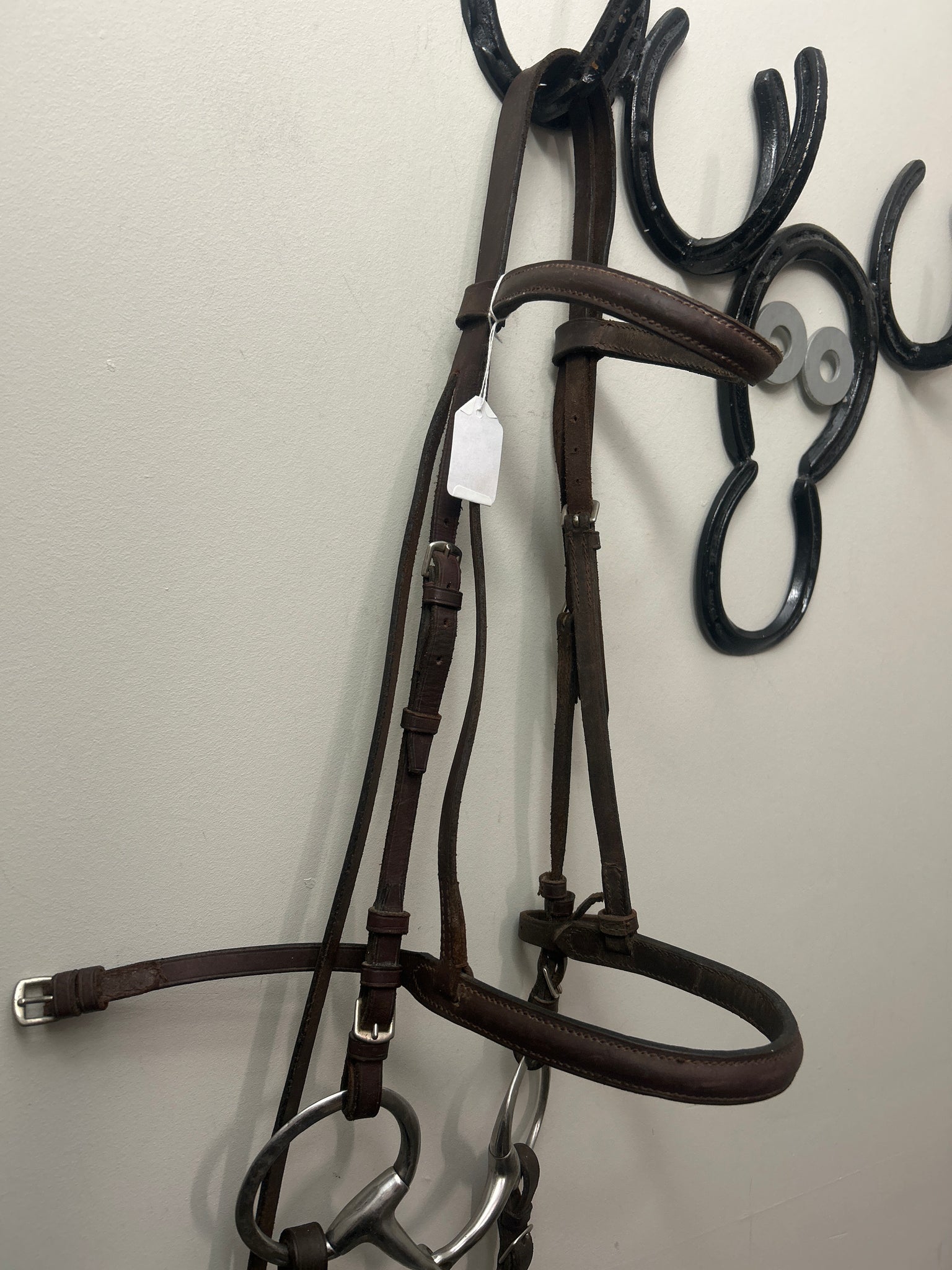 Good used condition English brown schooling bridle. Cob size. Comes with leather reins. Could use a bit more oil to really come back to life.