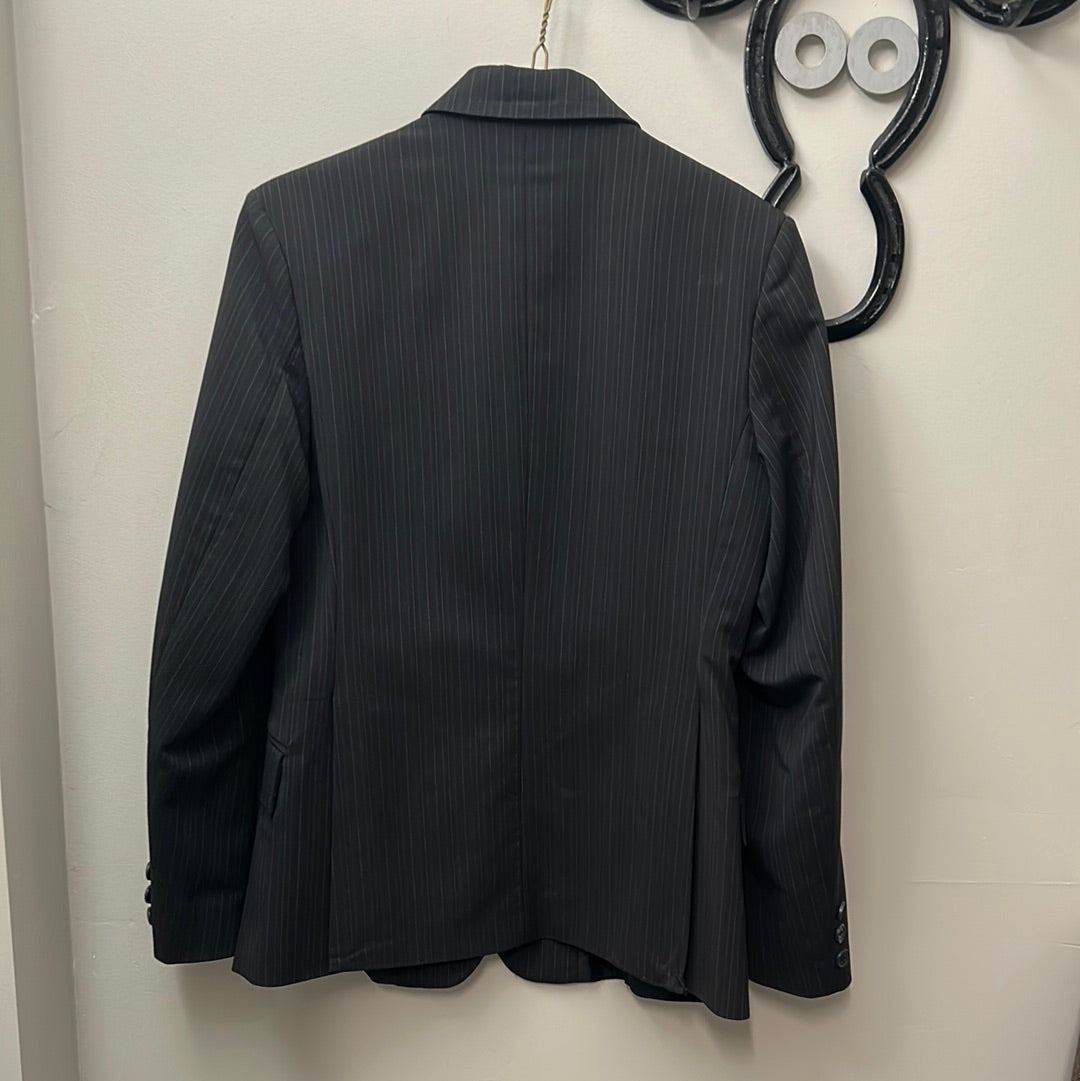 No name found. Polyester lining. Black with tan and light blue pinstripes.