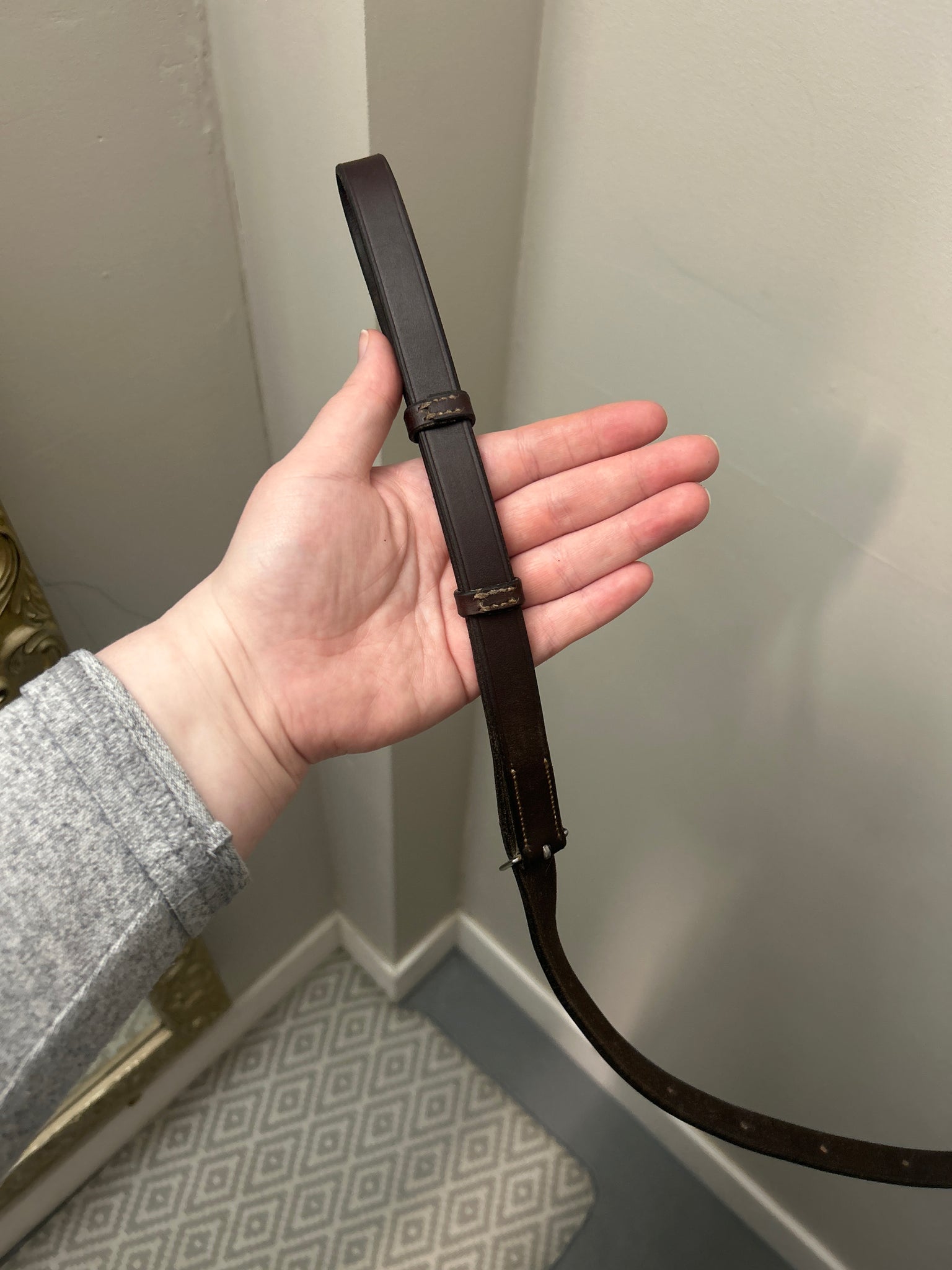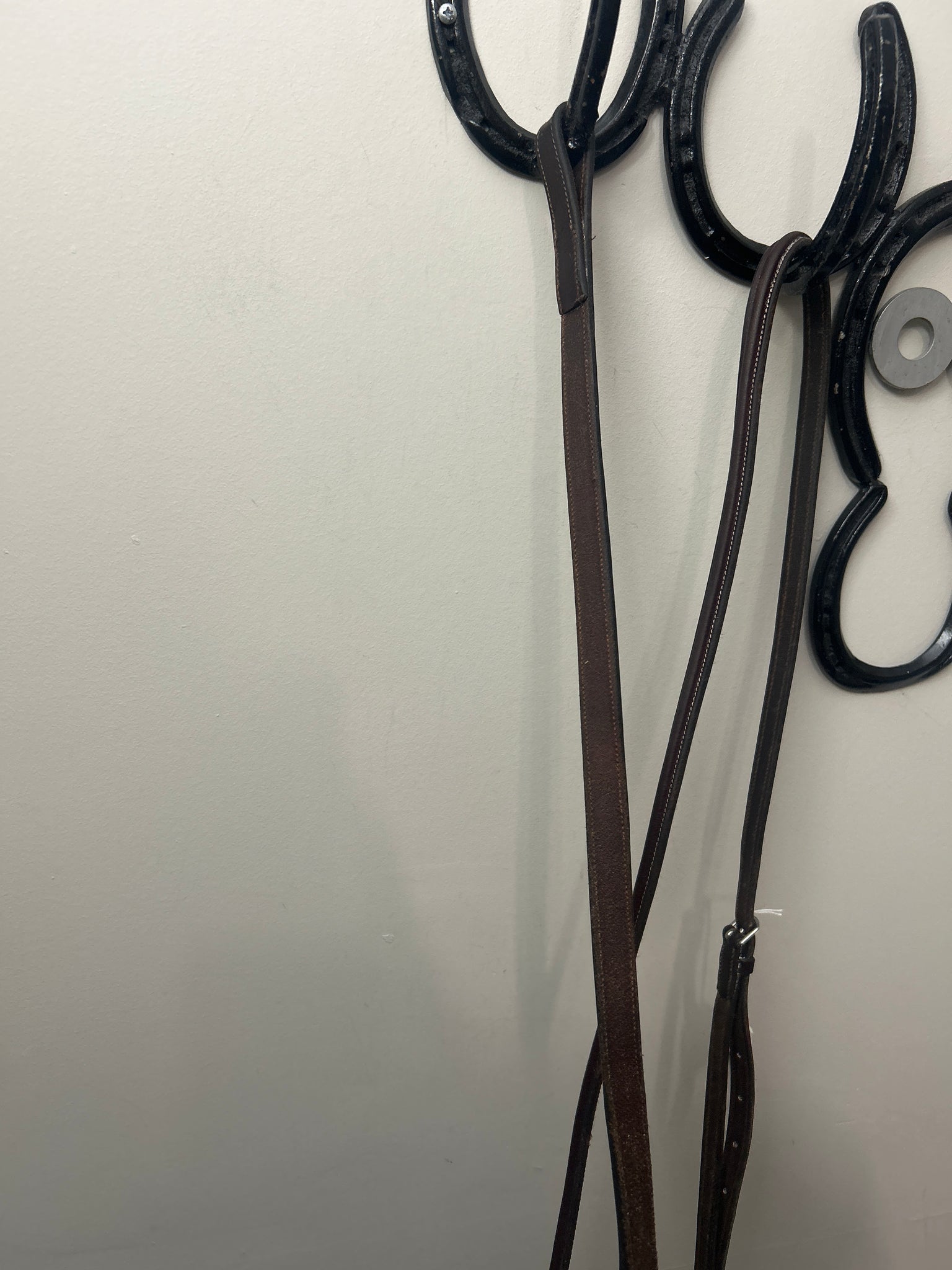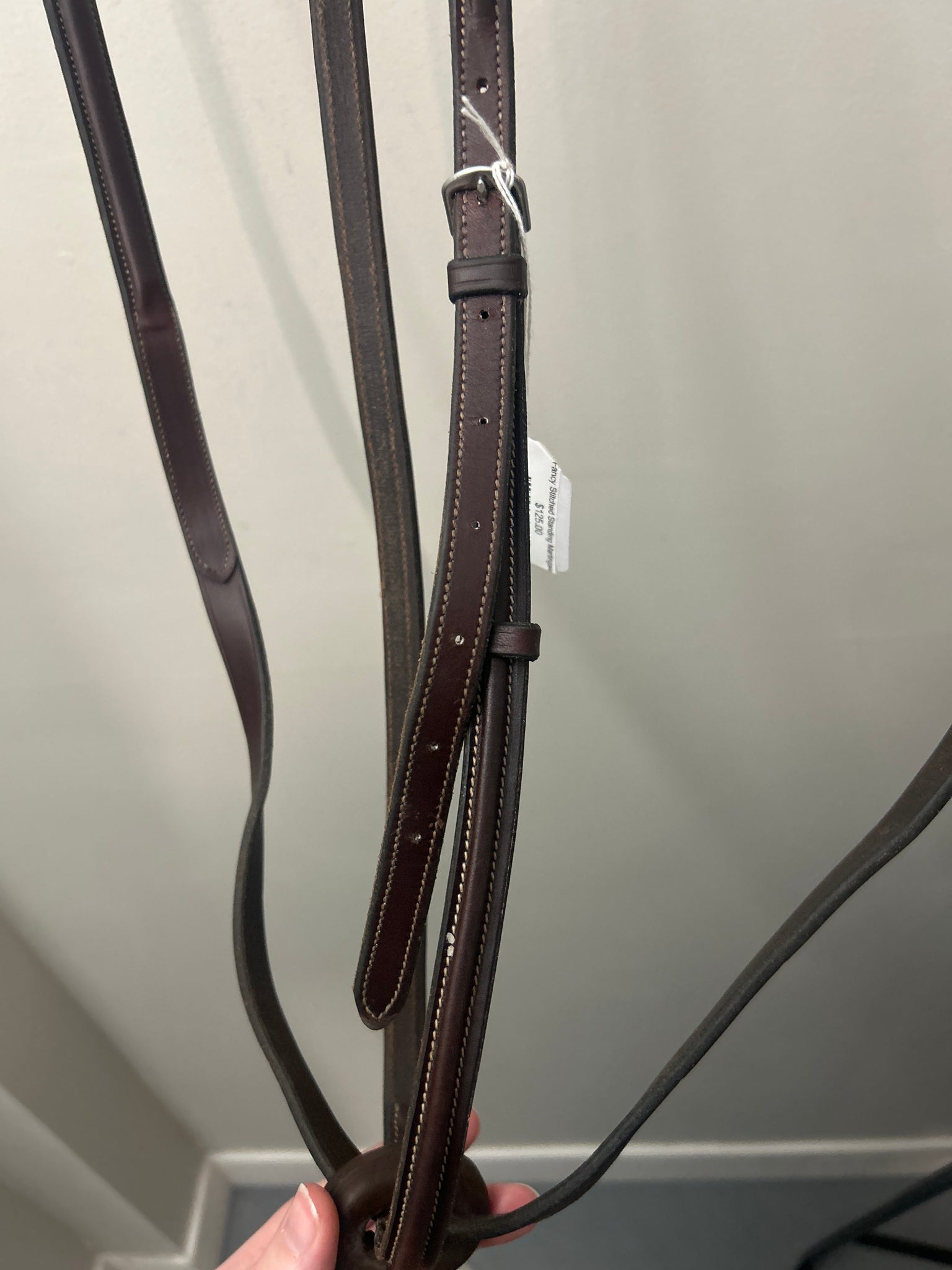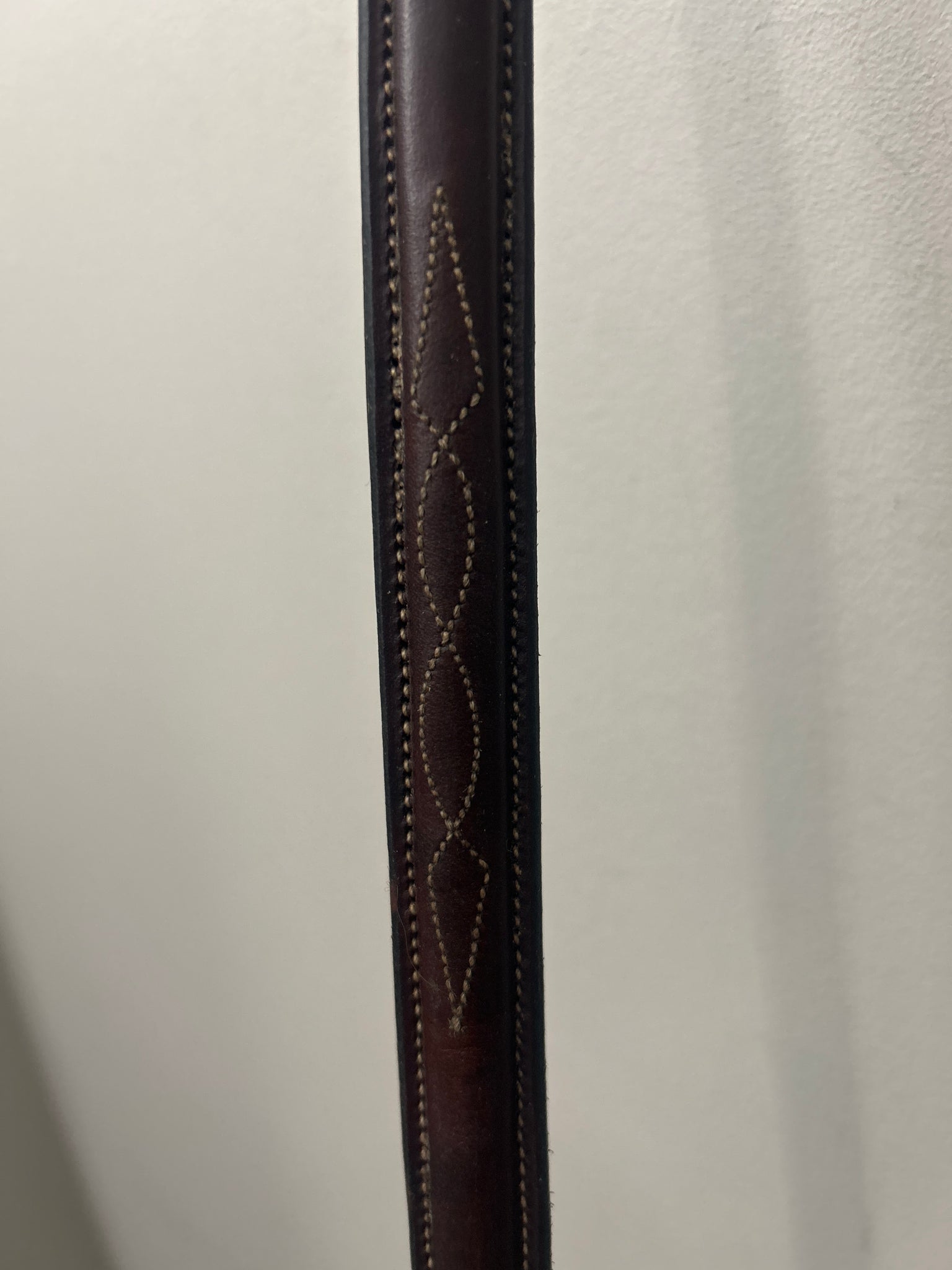 Beautiful, high-quality leather fancy stitched standing martingale. No makers mark or size stamps. Assumed Horse Size. Came in on consignment with an Arc De Triomphe bridle, similar quality leather.