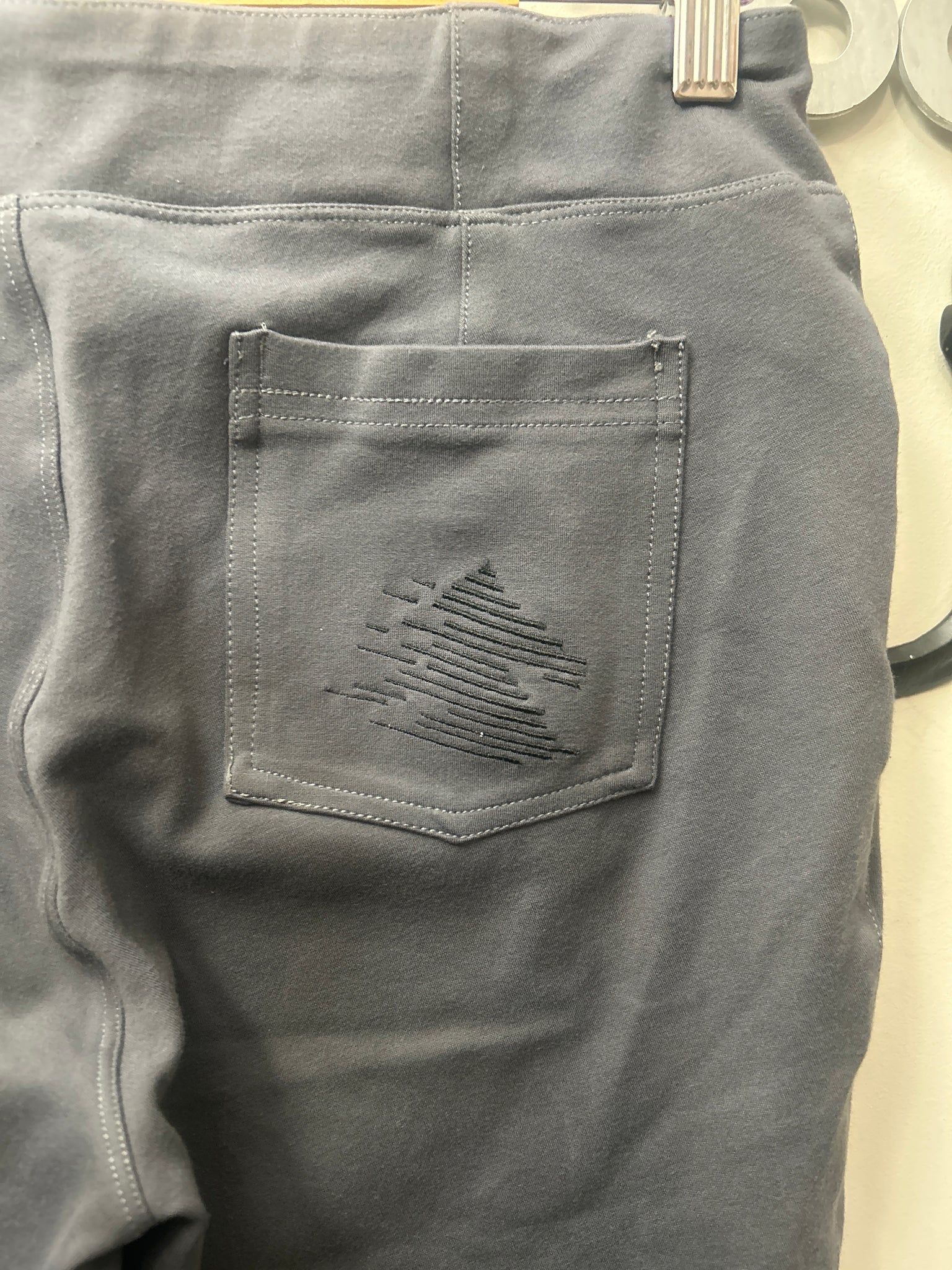 Dark Grey Breeches with Black Suede Knee Patches. Super stretchy and comfortable material, Pull on style.
