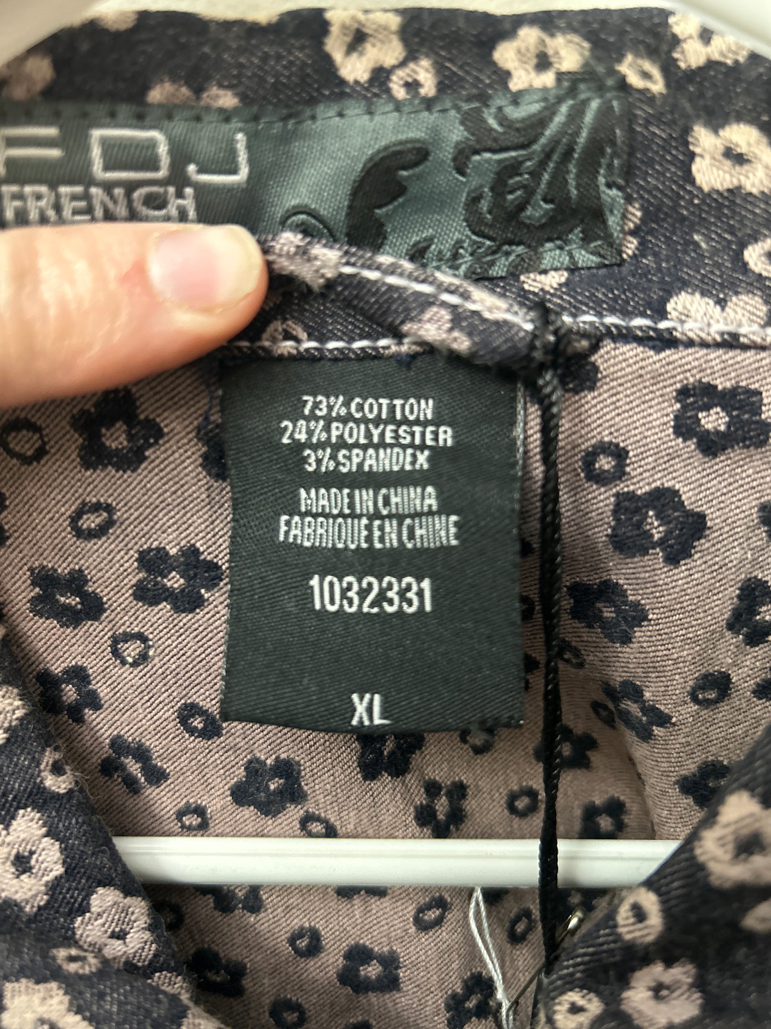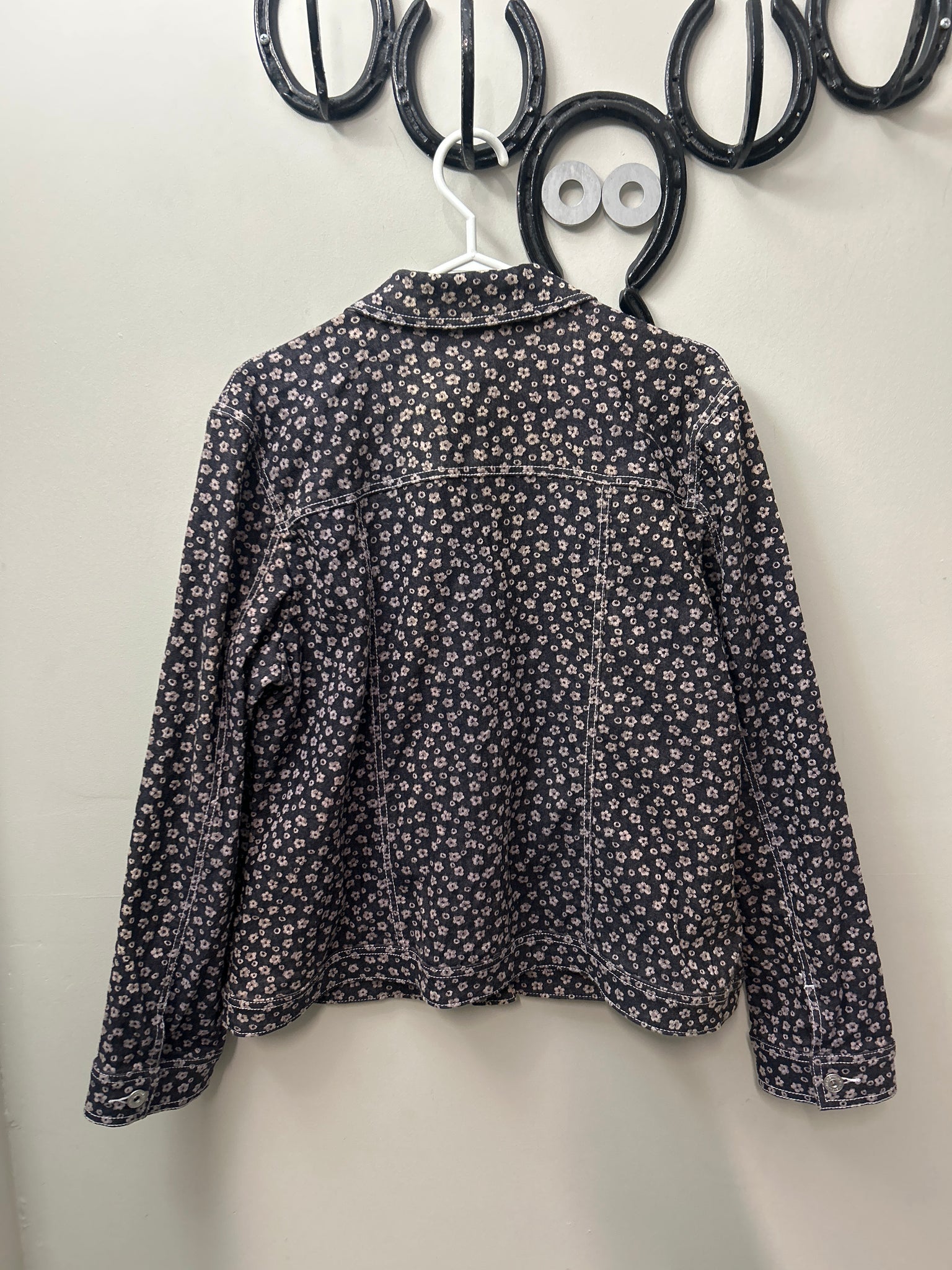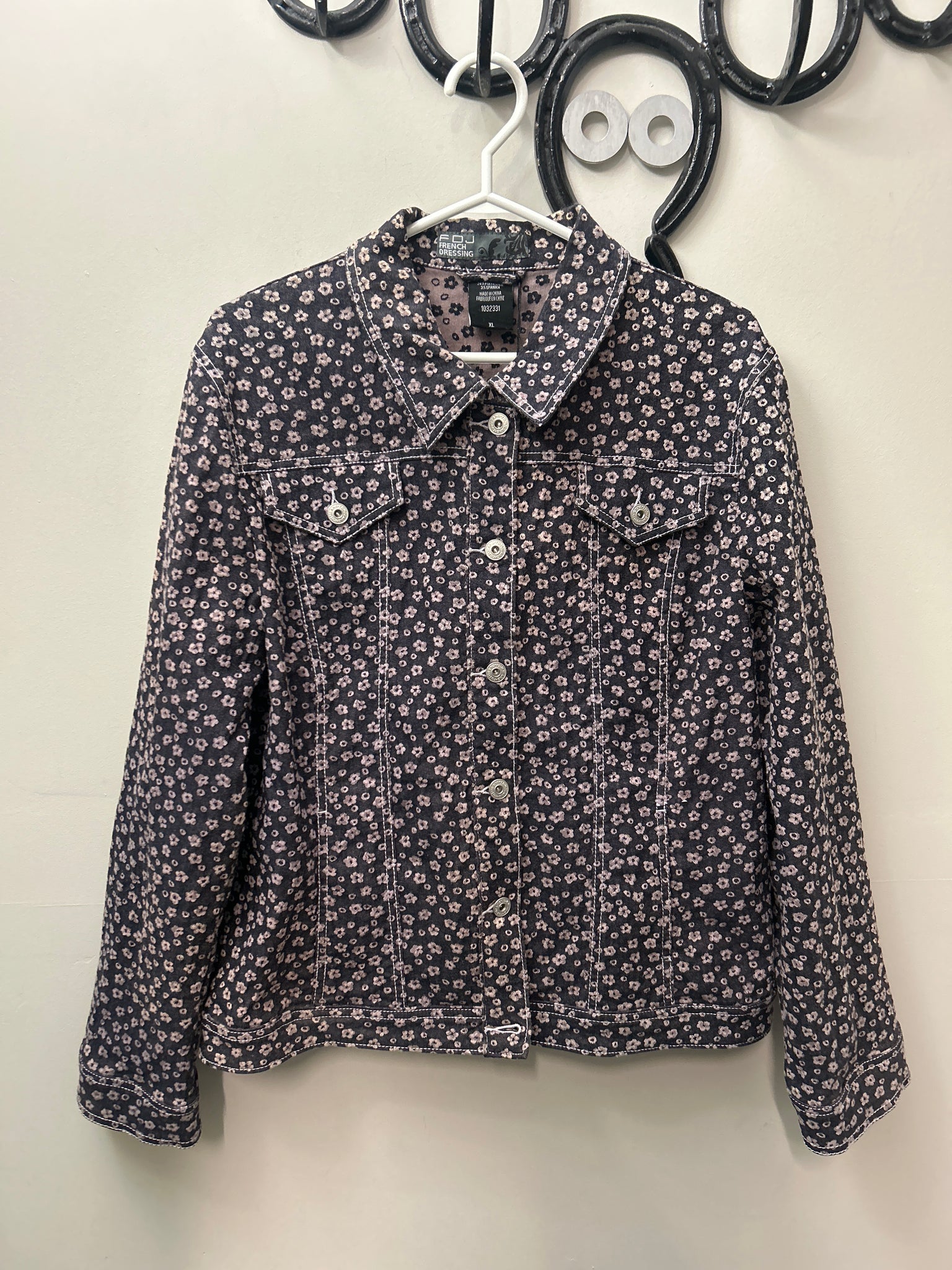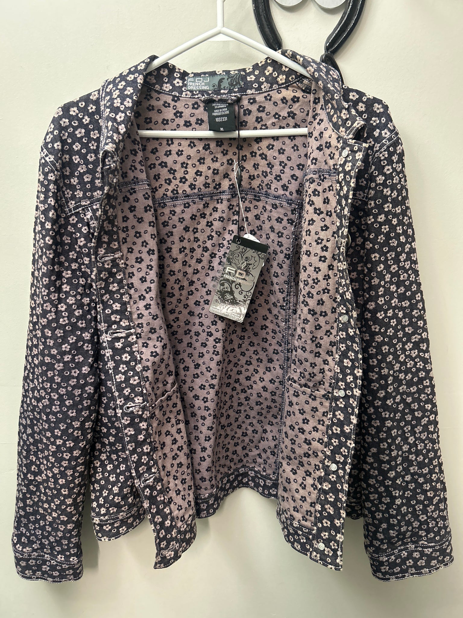 French Dressing Jeans Floral Demin-like style jacket. Pink flowers with snaps down the front. Size XL. Sold new for $102