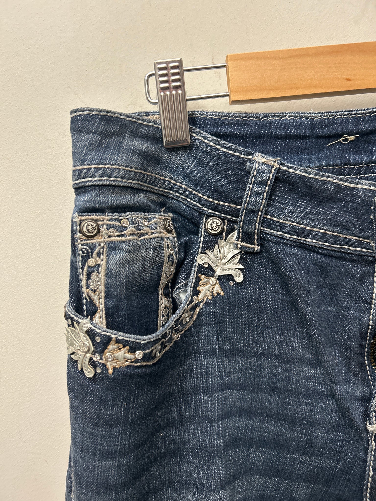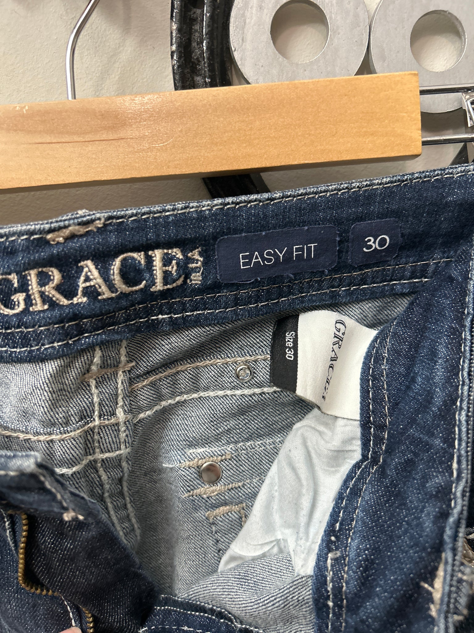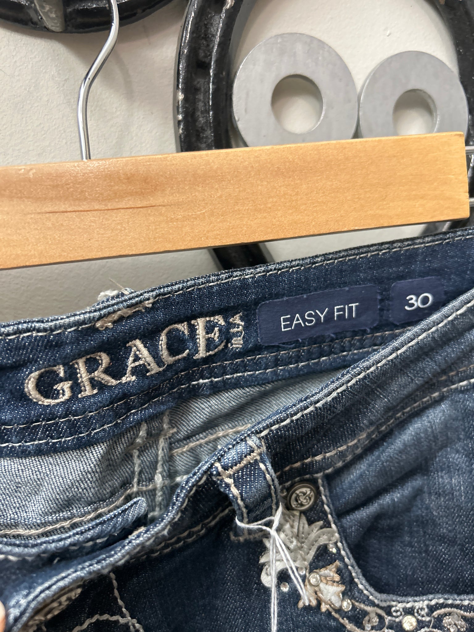 Super stunning Grace in LA embellished and rhinestoned jeans. Mid-rise, easy fit Boot cut style. Size 30