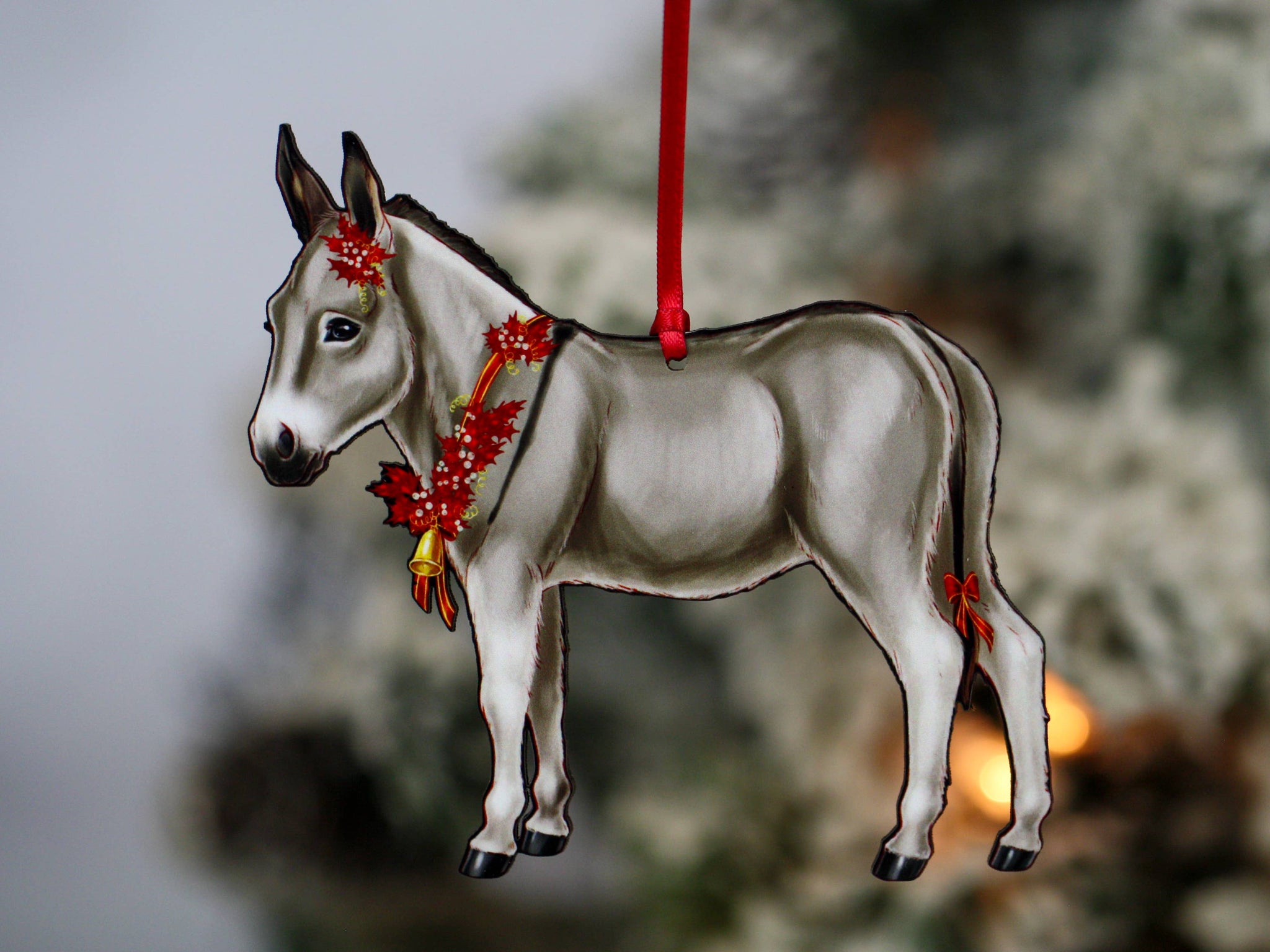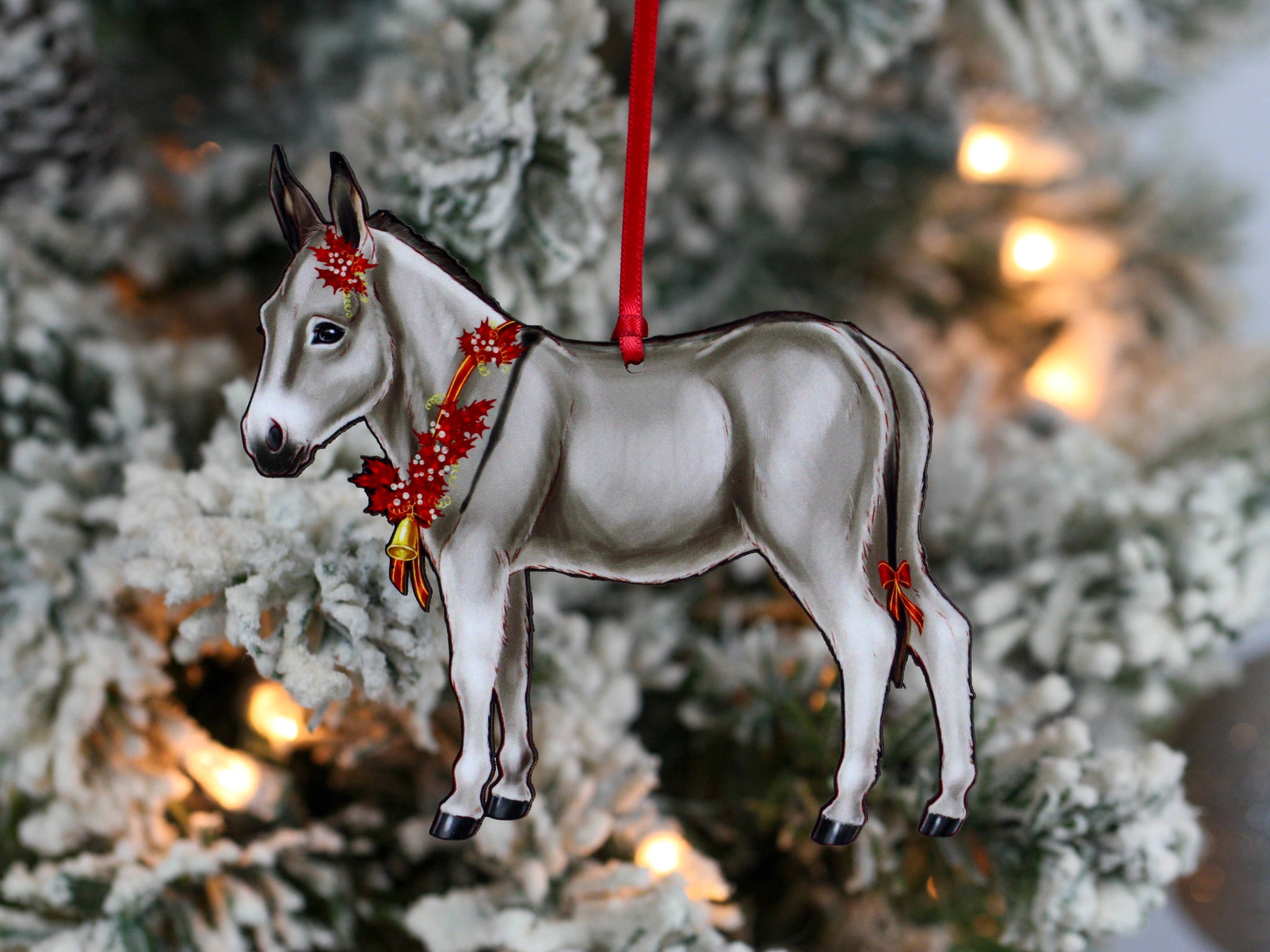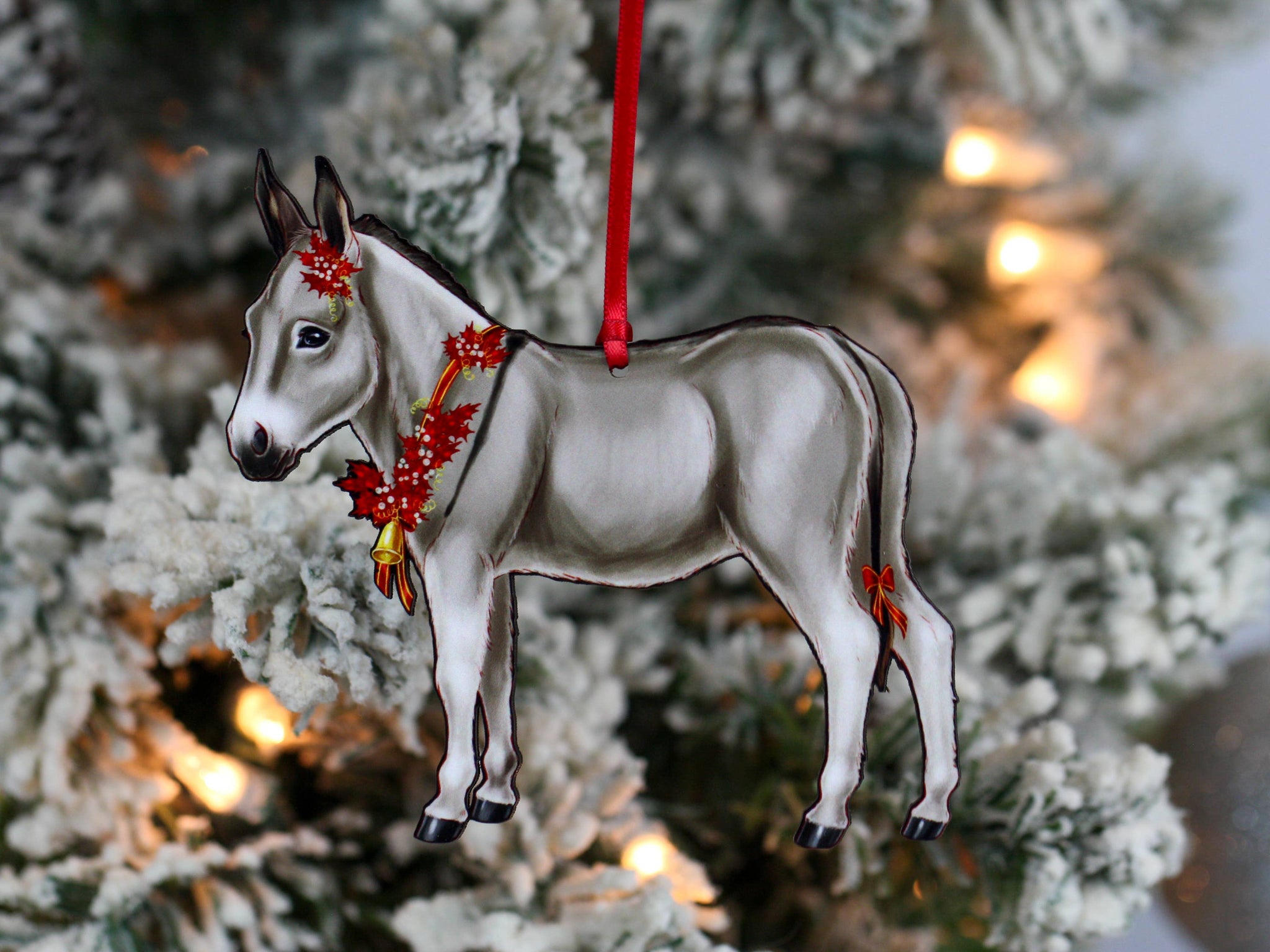 Here's an adorable gray Miniature Donkey looking festive adorned with Christmas decorations. This hand made 1/8" thick composite wood laser cut Miniature Donkey would look great on an equestrian's Christmas tree during the holidays, on the mantel, hanging on the wall or wherever is most fitting. The ornament will come with a gift box -- perfect for easy gifting and for storage once the holidays are over.