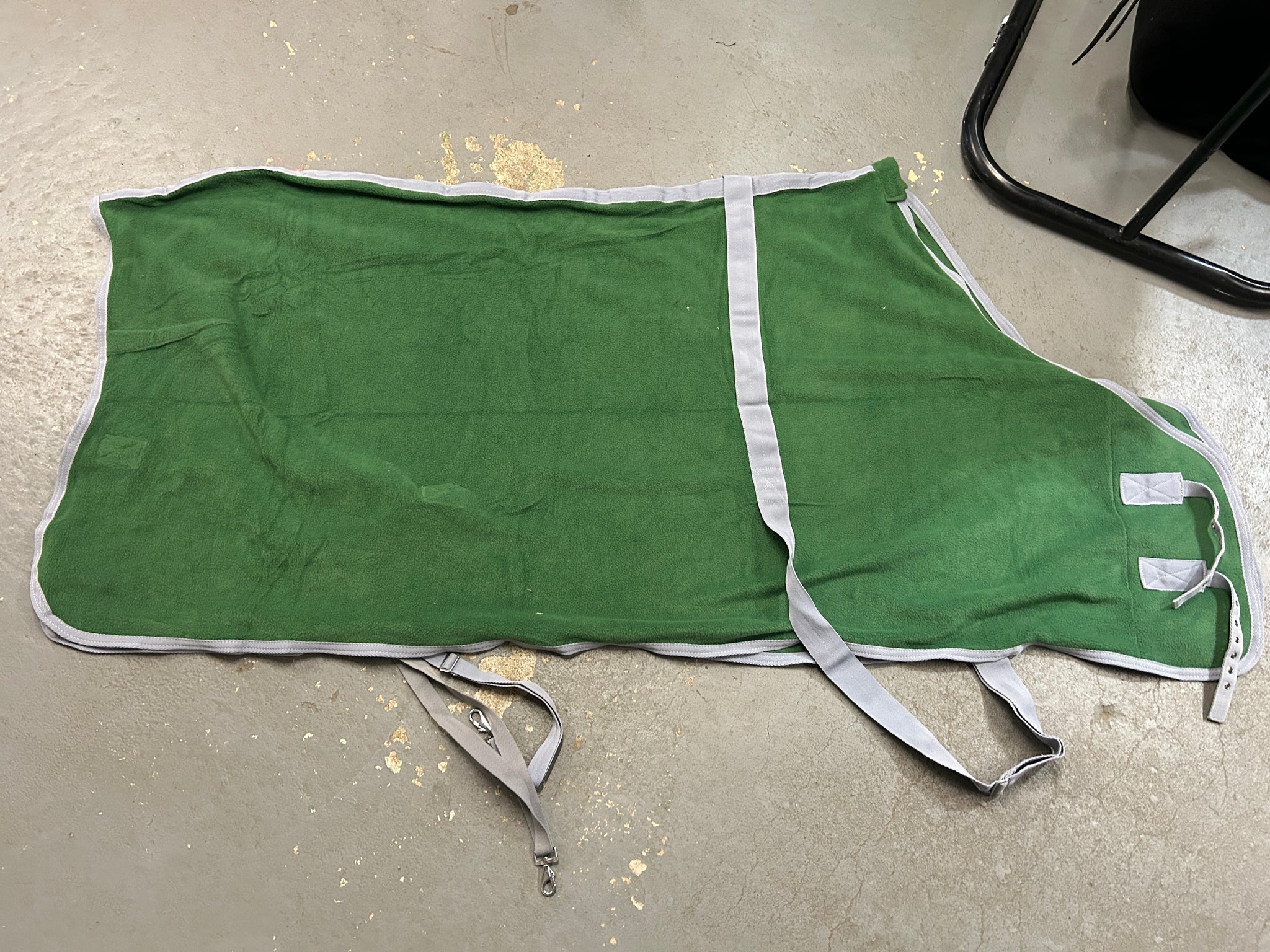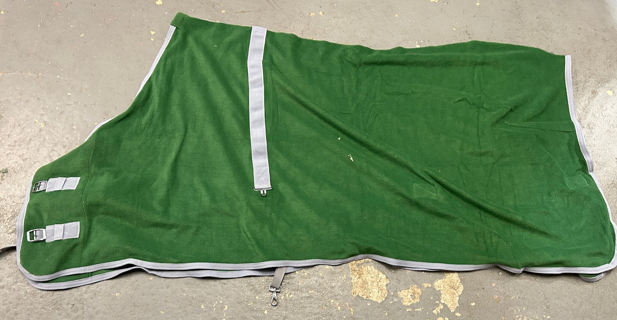 No branding or sizing. Excellent Condition. Green and Grey Fleece Cooler.