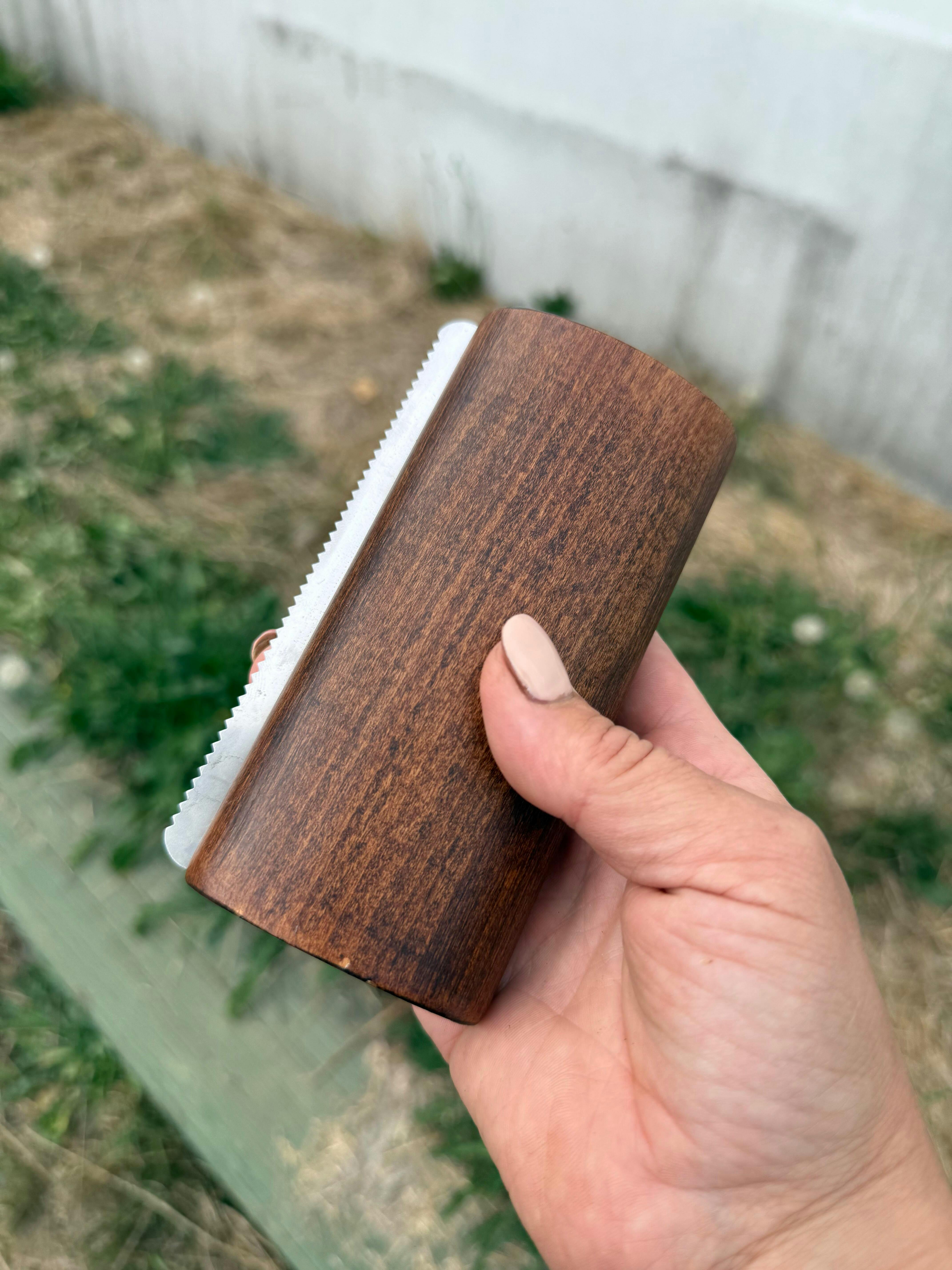 Crafted with a smooth wooden handle and precision blade edge, the GroomGlide fits comfortably in your hand, offering controlled, effortless strokes every time.