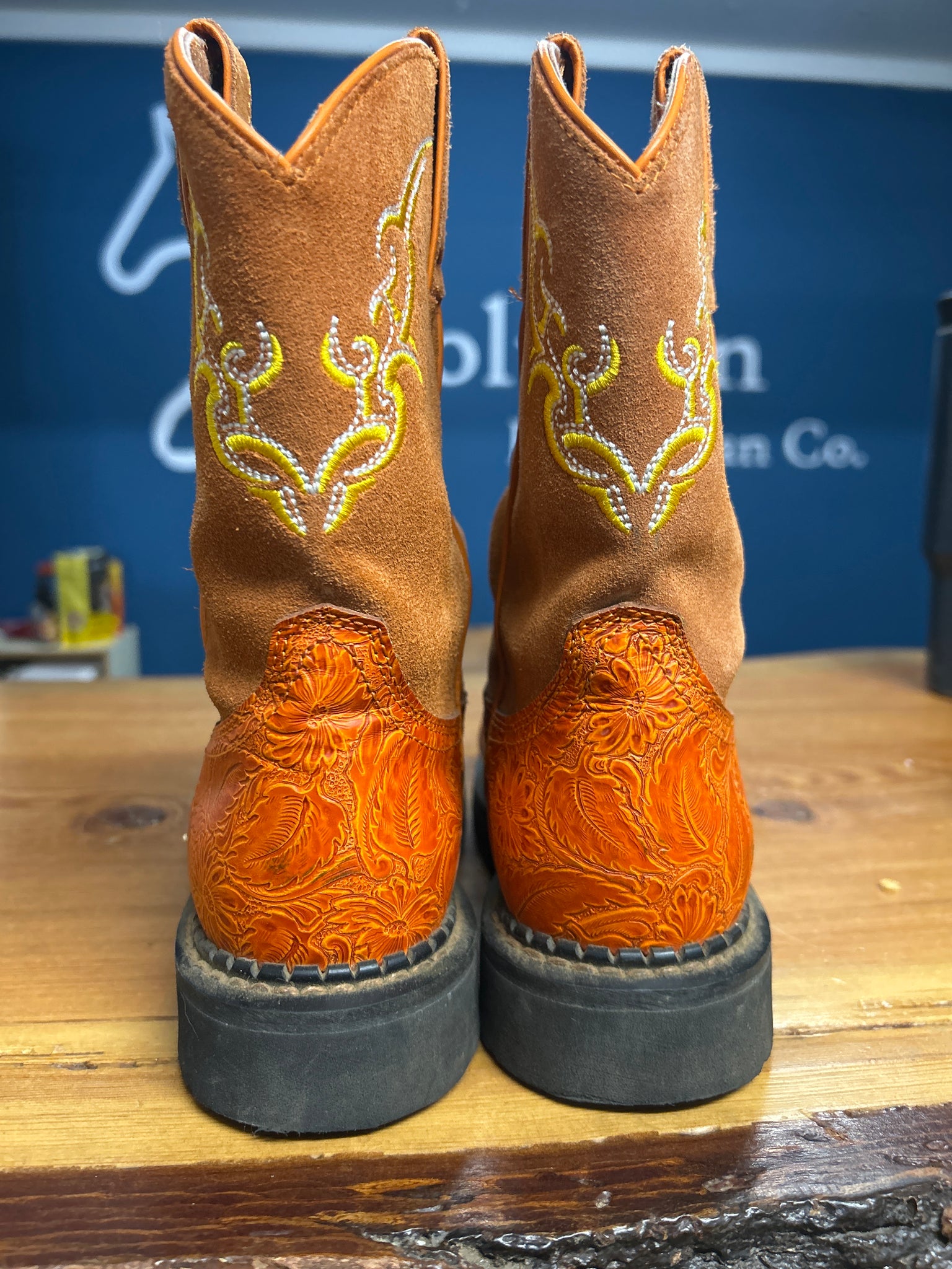 Super fun and bright! Justin Boots Ladies Cowboy Boots. Style L8016. Barely broken in. Floral detailing and a square toe.