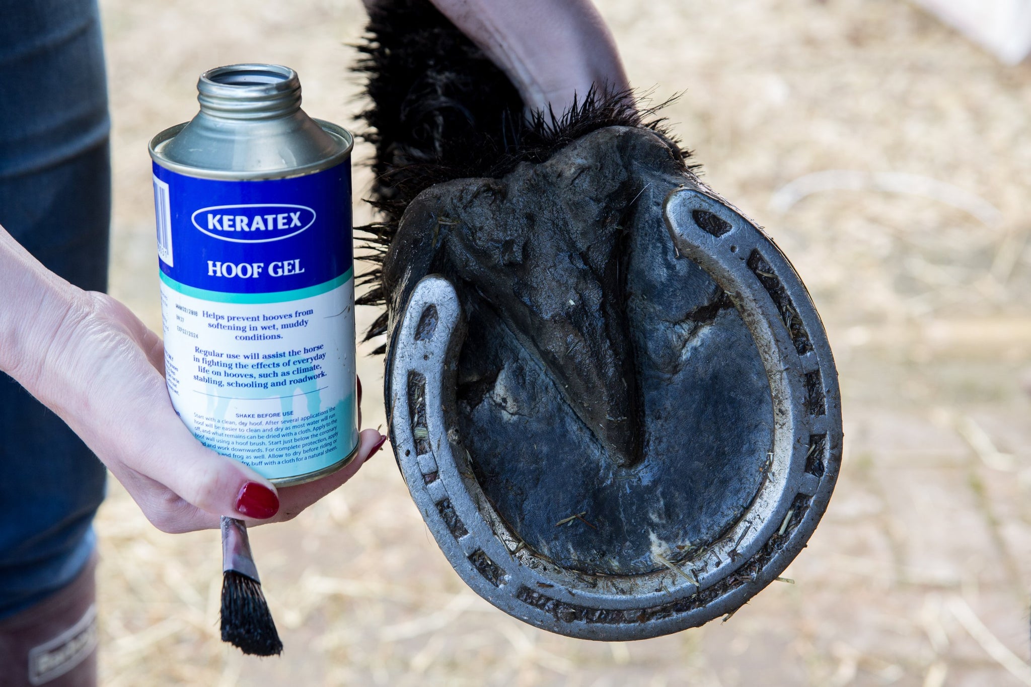 Designed for wet weather use, Keratex Hoof Gel forms a protective, waterproof and breathable layer over the hoof, keeping hooves water-tight and preventing them from softening, splitting or breaking up in wet, muddy conditions. By stopping water from saturating the internal structures of the hooves, the hooves have the time, space and correct conditions for the horse to be able to restore hoof quality. So if you find that your horse’s hooves deteriorate, soften, throw shoes or become saturated in wet or humid conditions, apply Keratex Hoof Gel all over the hoof, frog, soles and heels every other day to restore the quality and strength in your horse’s hooves. We give you our quality promise that Hoof Gel absorbs into the hooves and therefore will not ‘come off’ in the field whatever the conditions. Once the product has absorbed into the hooves you will see that water forms droplets that simply roll off the hooves like rain off a waxed jacket or water off a duck’s back.