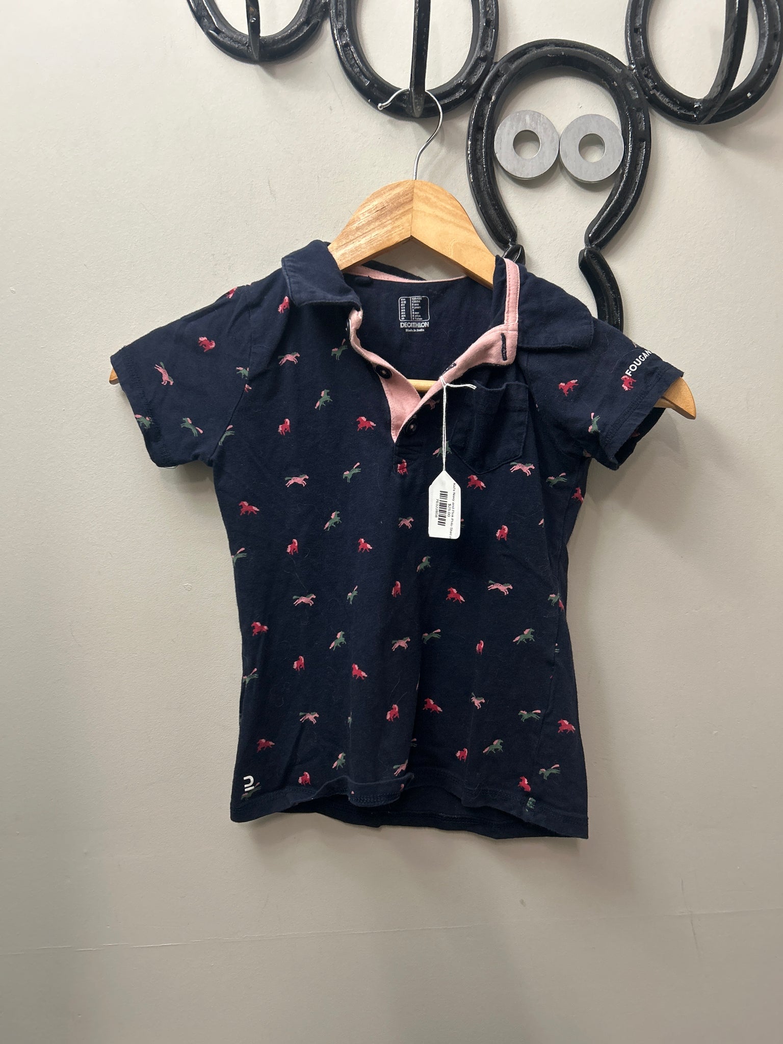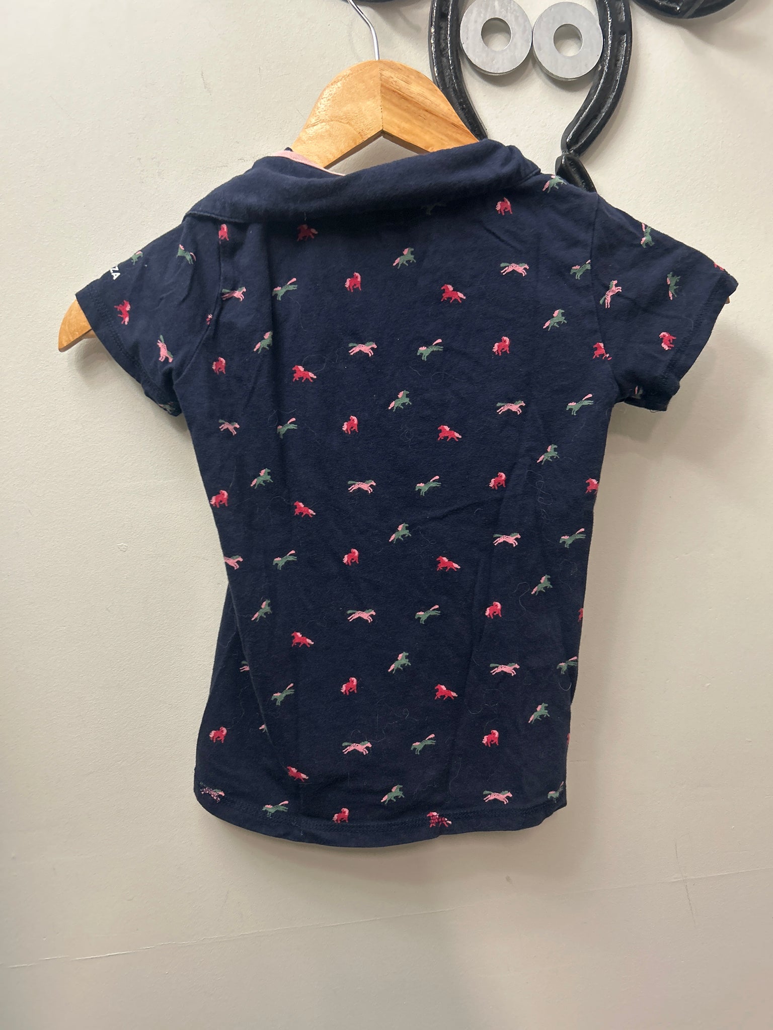 Super Cute! Navy polo with pink and grey horses and pink details on the collar.