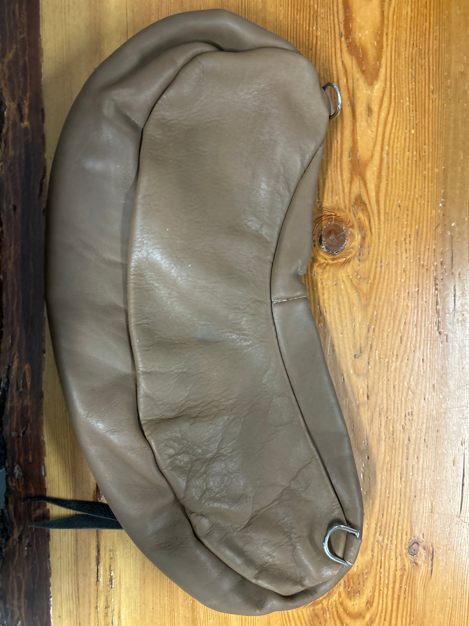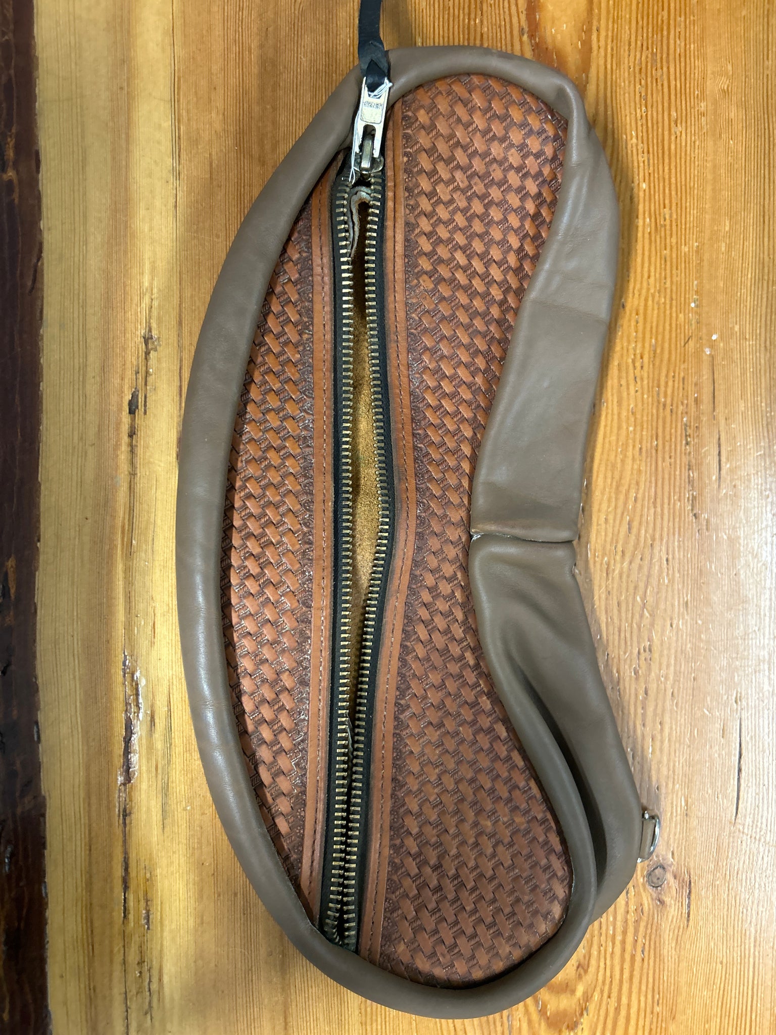 Leather Saddle Bag. Has two dee rings on the underside to tie to saddle strings. Basket weave tooling on the top with a heavy duty zipper. Measures 17.5" long x 6" wide and 3" deep.