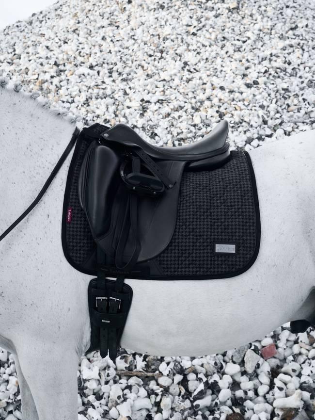 Up your game with this luxe saddle pad from the Aspen Collection. Crafted in a premium luxury houndstooth check fabric, it has a unique houndstooth quilting pattern that's sure to stand out from the crowd. Patent PU piping catches the light, and a gunmetal LeMieux badge matches back to the rest of the Aspen Collection.