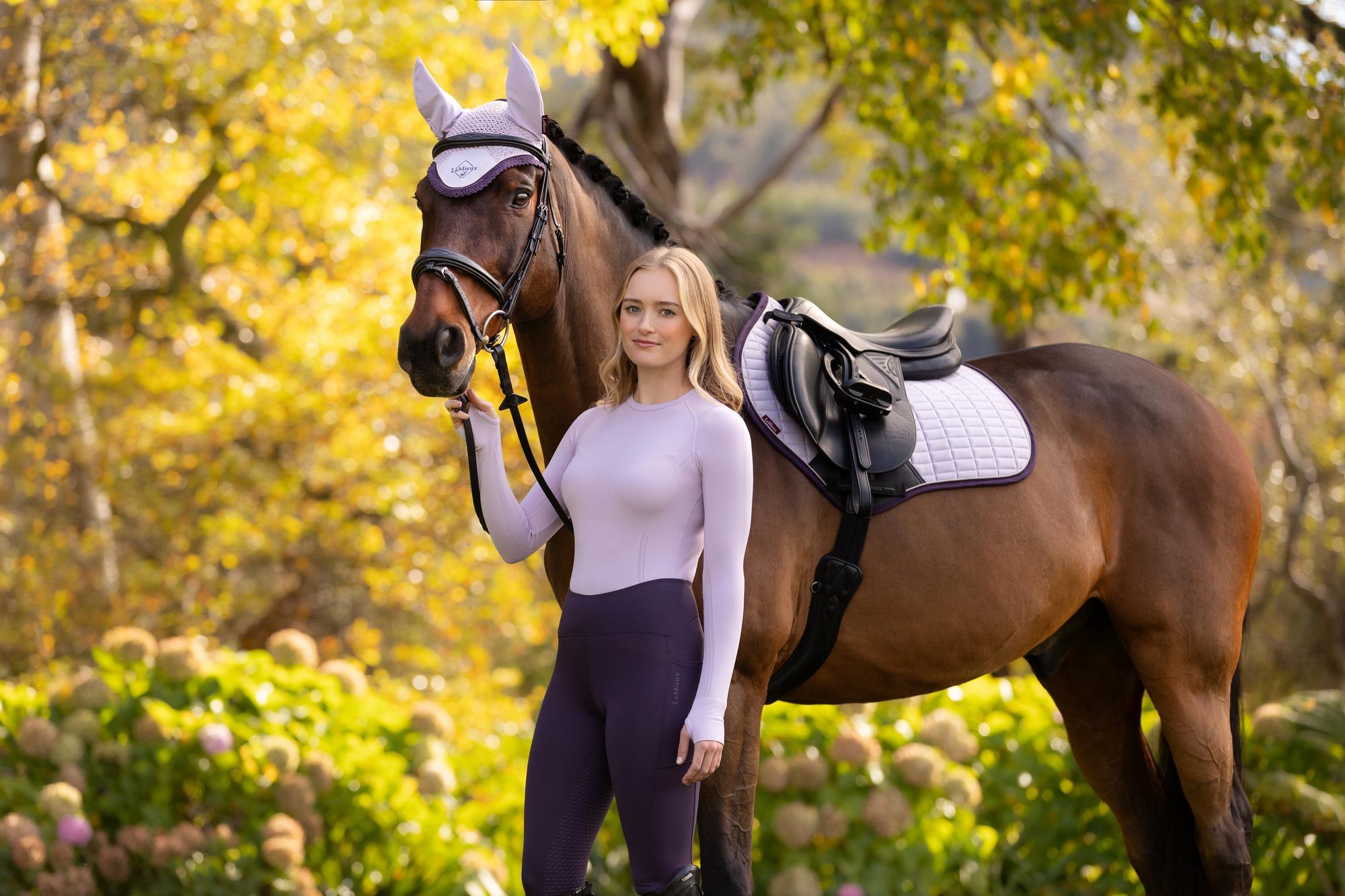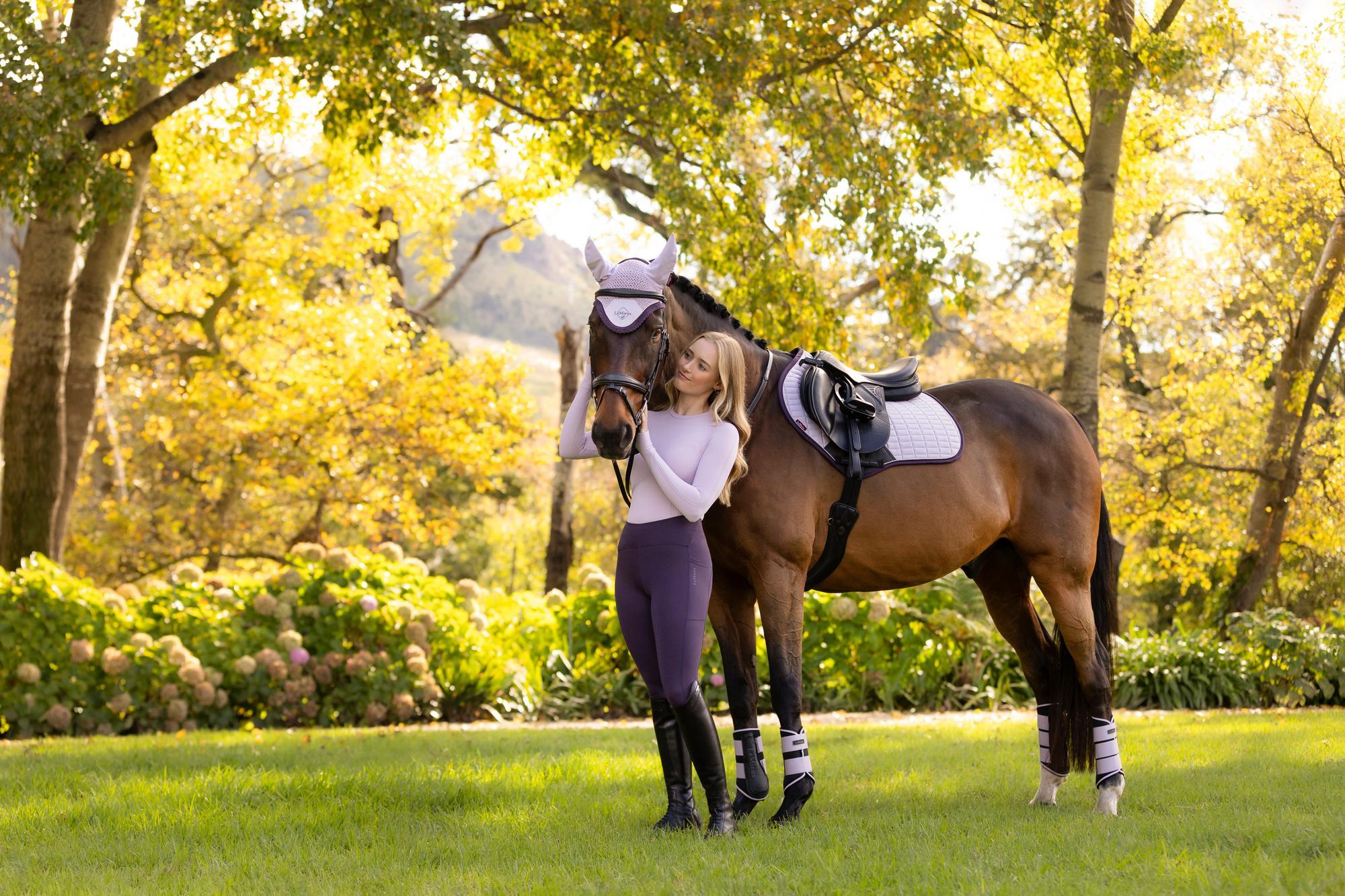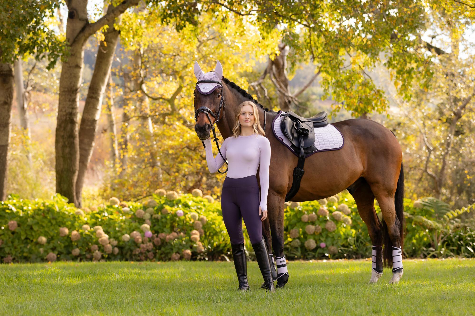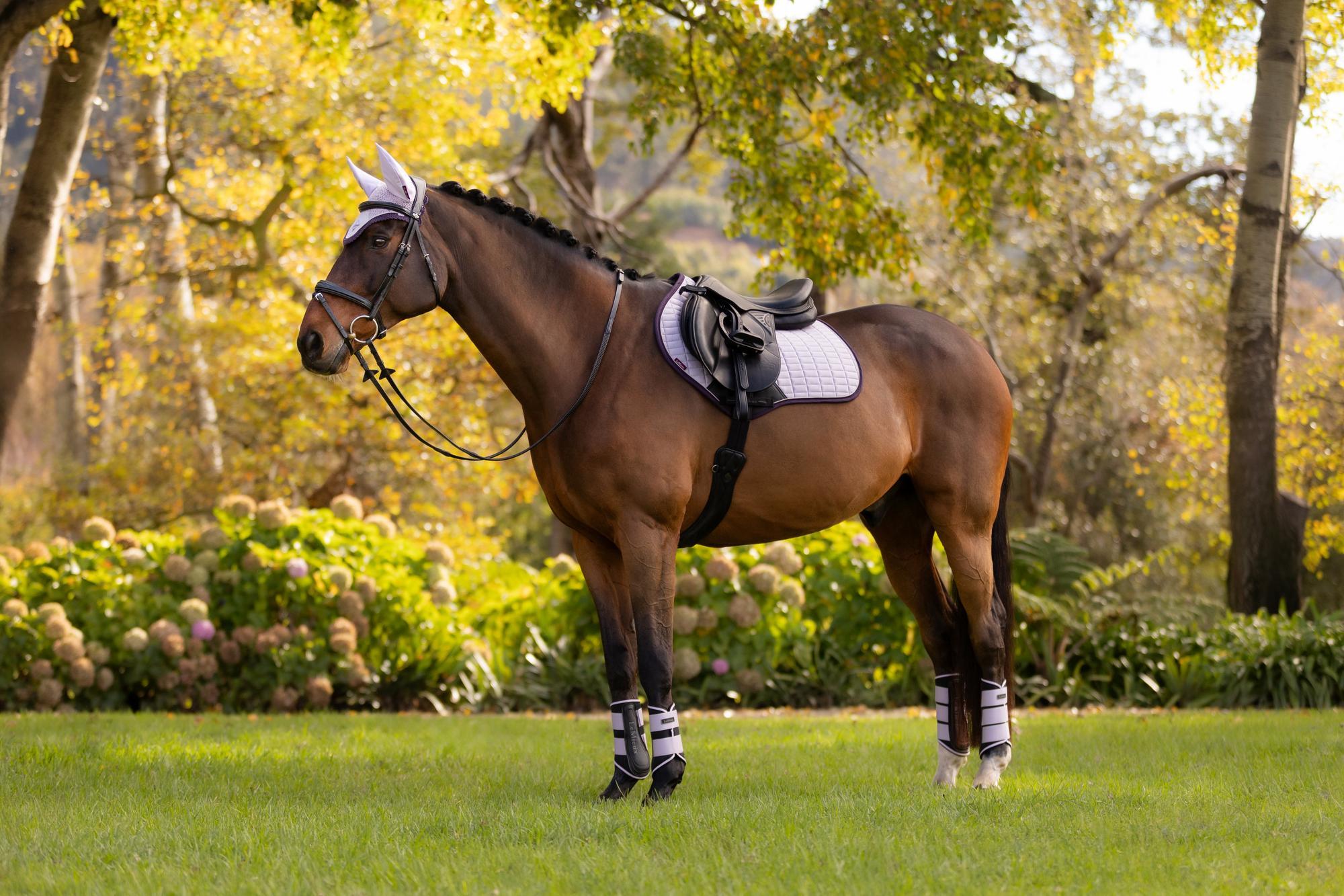 Now featuring an ultra-soft suede binding and a new PU leather girth protection area, the LeMieux Suede Close Contact Saddle Pad is designed for a sleek, professional look while providing superior comfort and performance. With its signature high-wither design, elasticated D-ring tabs, and swept-back profile, this pad offers an elegant fit under a wide range of dressage saddles.