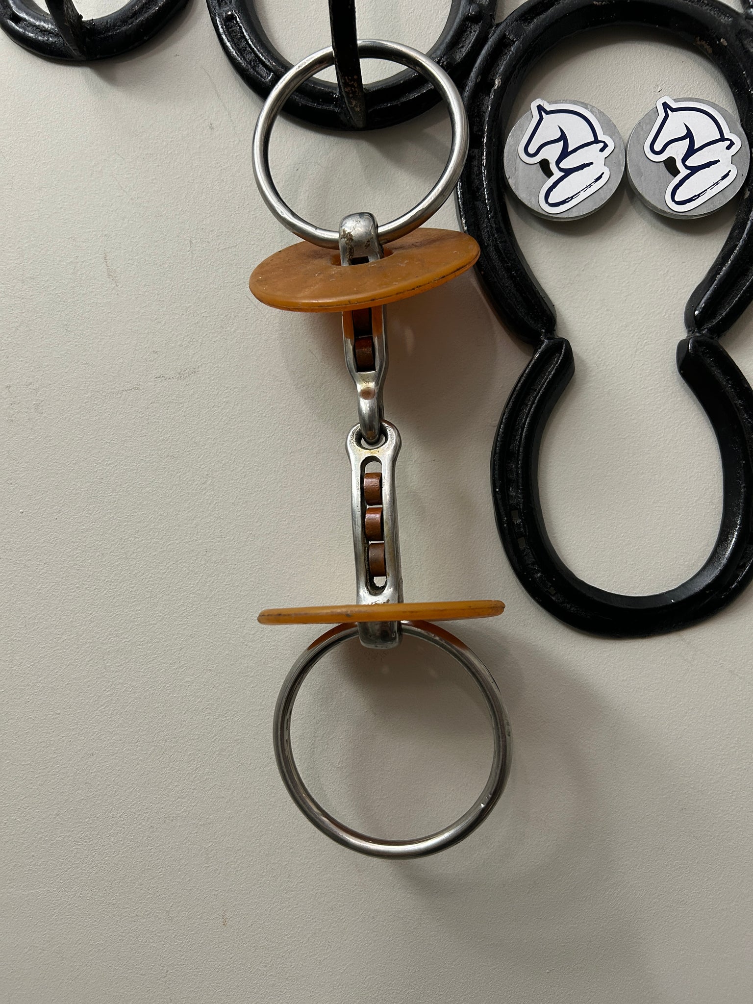 McGinnis Loose Ring Snaffle. Square-edged on the cannons with copper rollers in the bars. This bit comes with natural rubber brown bit guards. 14mm thickness.