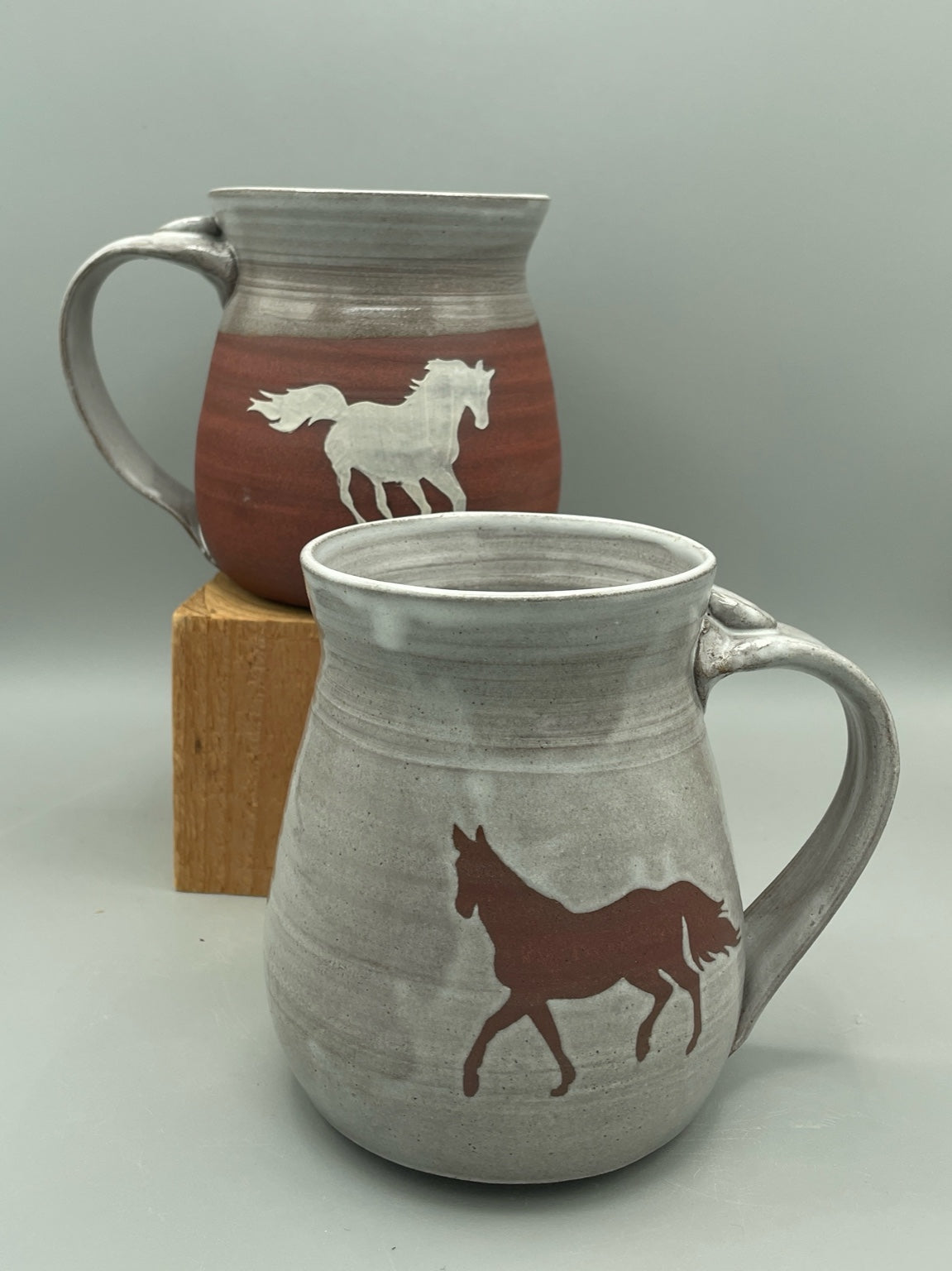 The horse silhouettes are created by allowing the natural red clay to show through the glaze, giving each piece depth, character, and a distinctly handmade feel. The gently flared lip and comfortable handle make these mugs perfect for slow mornings, barn-side coffee, or winding down after a long day at the barn.