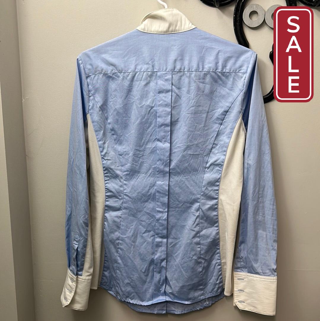 Noel Asmar Equestrian Light Blue Show Shirt. Size Medium. Magnet snap collar. Button up. White vented panels under arms and on the sides.
