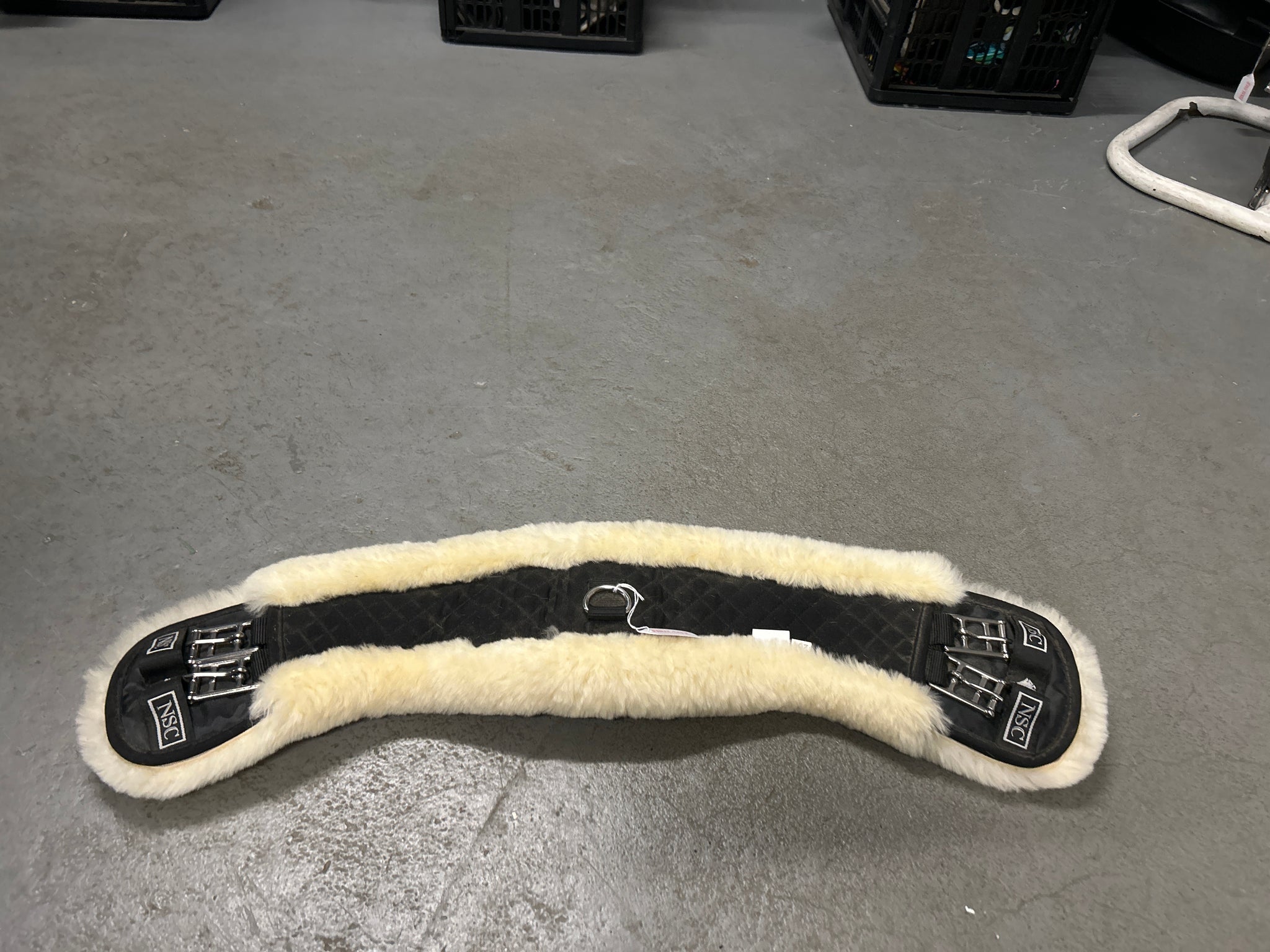 Moon-shaped dressage girth provides shoulder relief. Made with Australian Lambswool with no dyes. Washable on a wool cycle with wool detergent. Sheepskin is super clean then black cotton only has some dust on it.