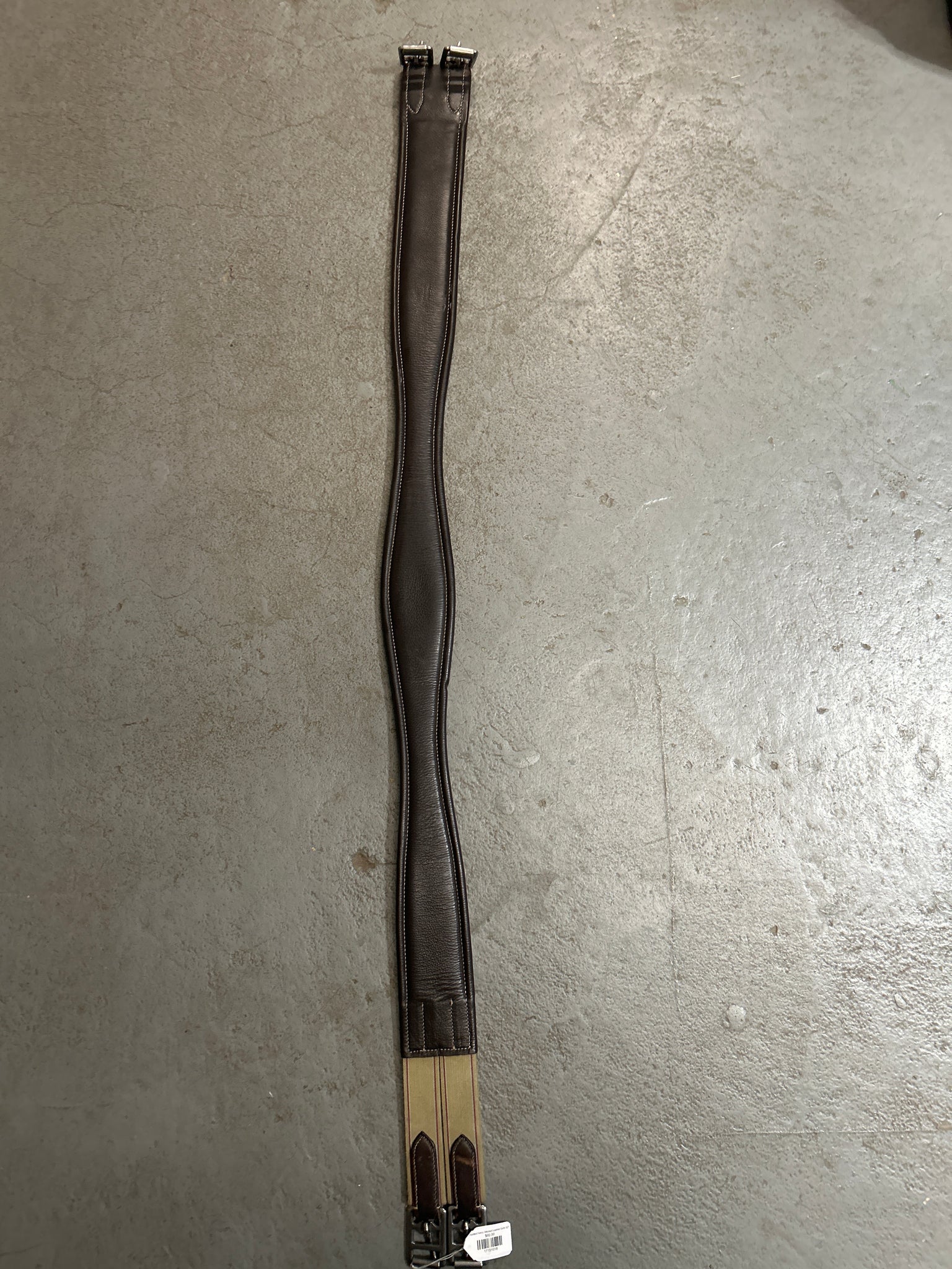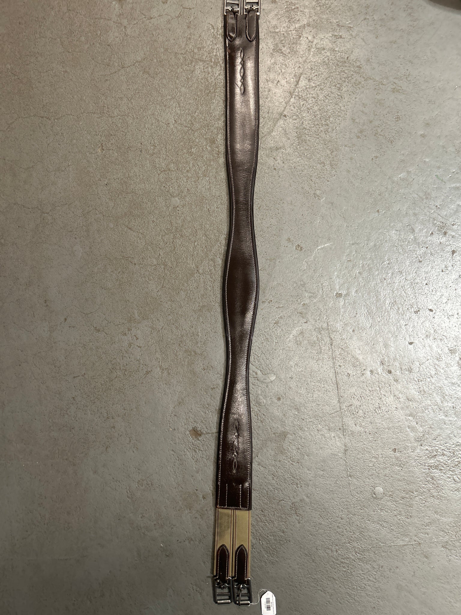 Beautiful, padded, fancy stitched leather girth. Dark Brown. Elastic only on one side. Roller buckles. No stamped size or brand.