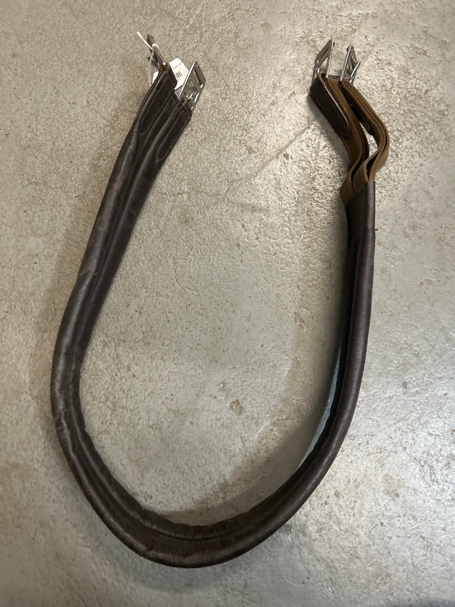 Dark Brown padded leather girth. Elastic on one side. Older condition but still has lots of life to give.