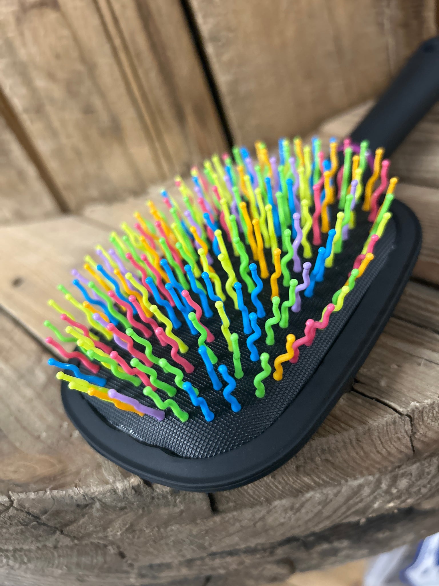 Add a pop of colour to your grooming kit! This paddle brush features vibrant rainbow bristles on a sleek black base—fun, functional, and easy to spot in the tack room. Designed to glide through thick manes and tails with ease, it gently detangles without pulling or breakage.