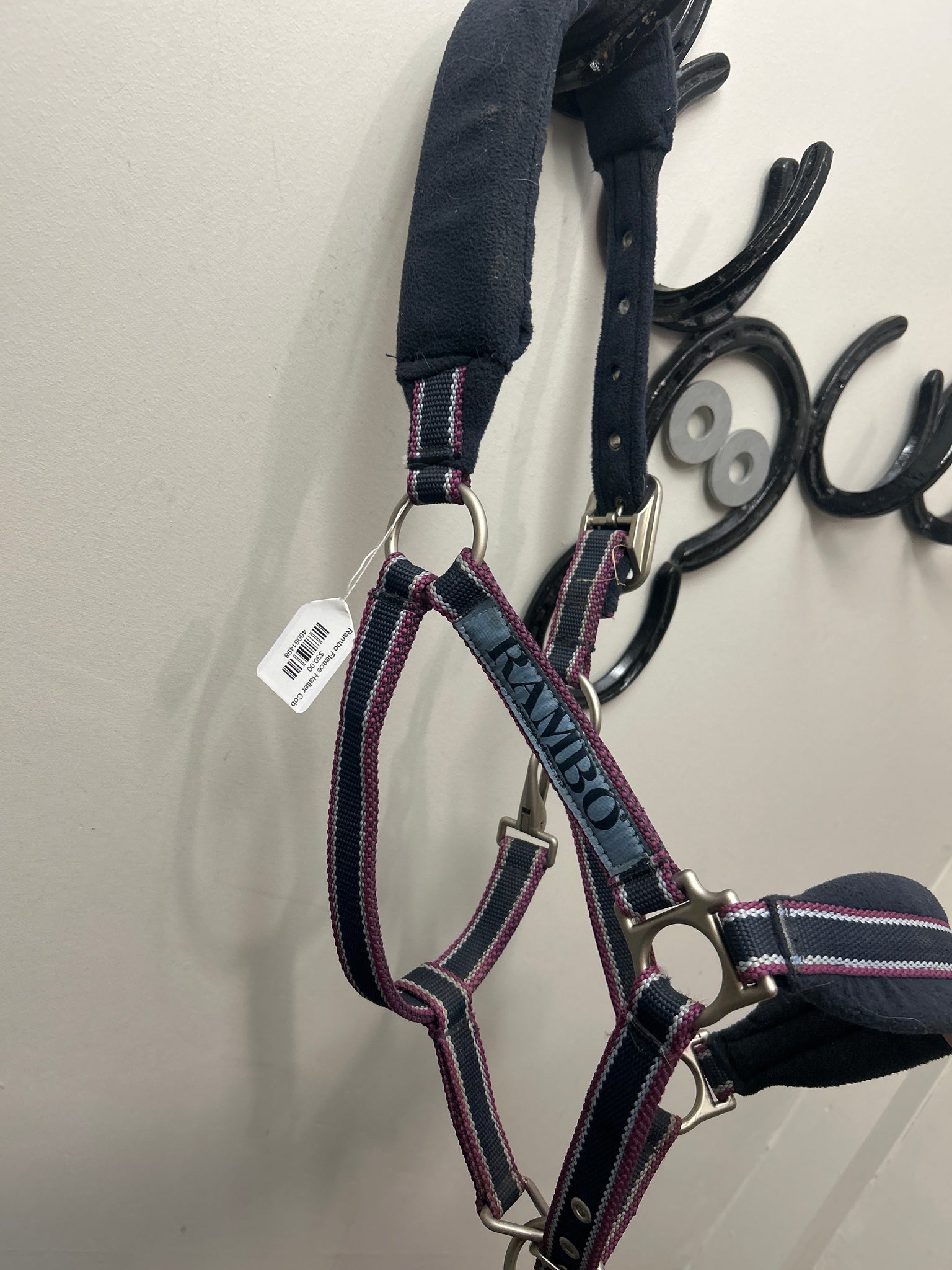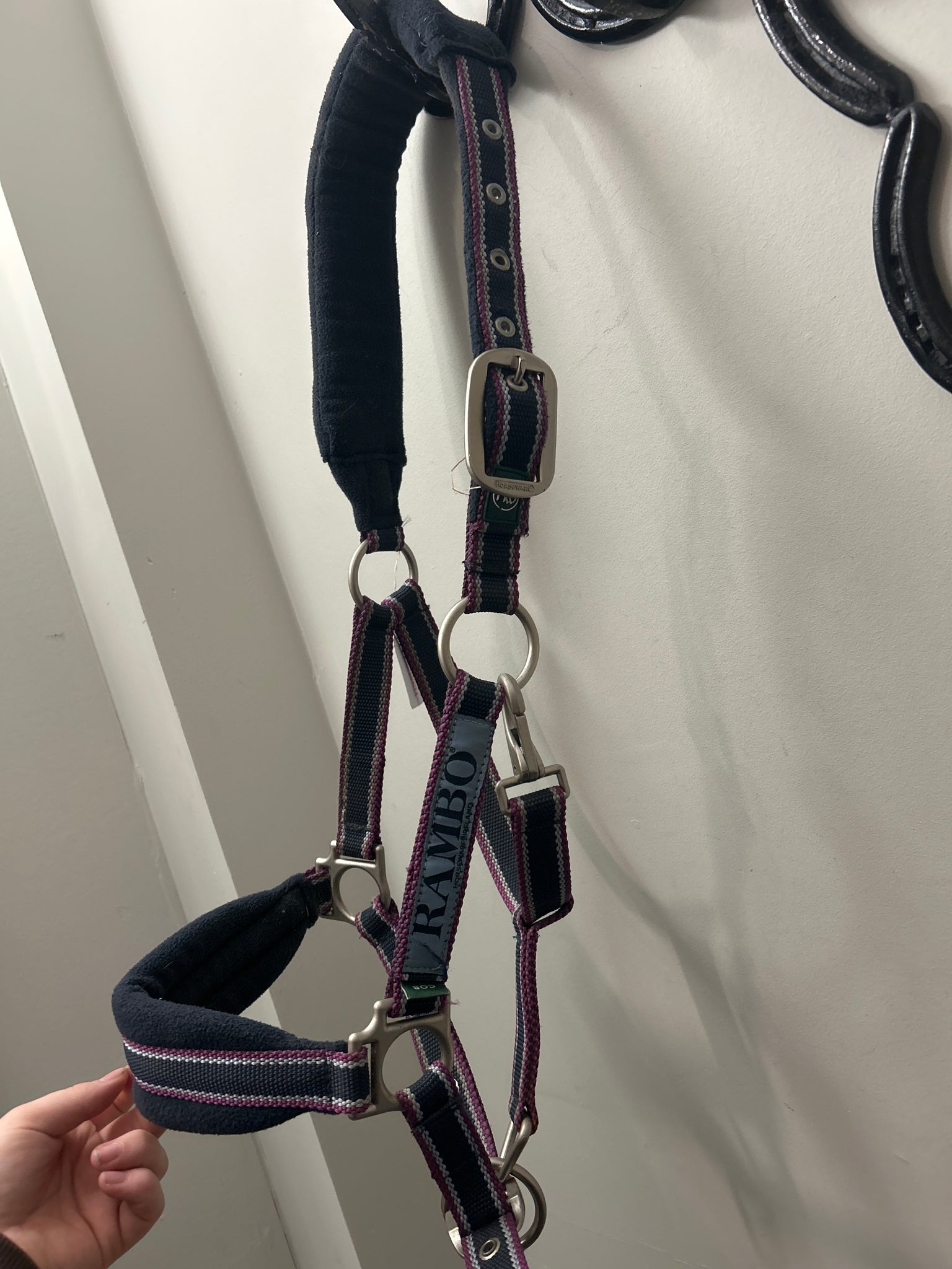 Rambo Nylon Halter with fleece on the crown and noseband. Navy, Berry and light blue. Good used condition.