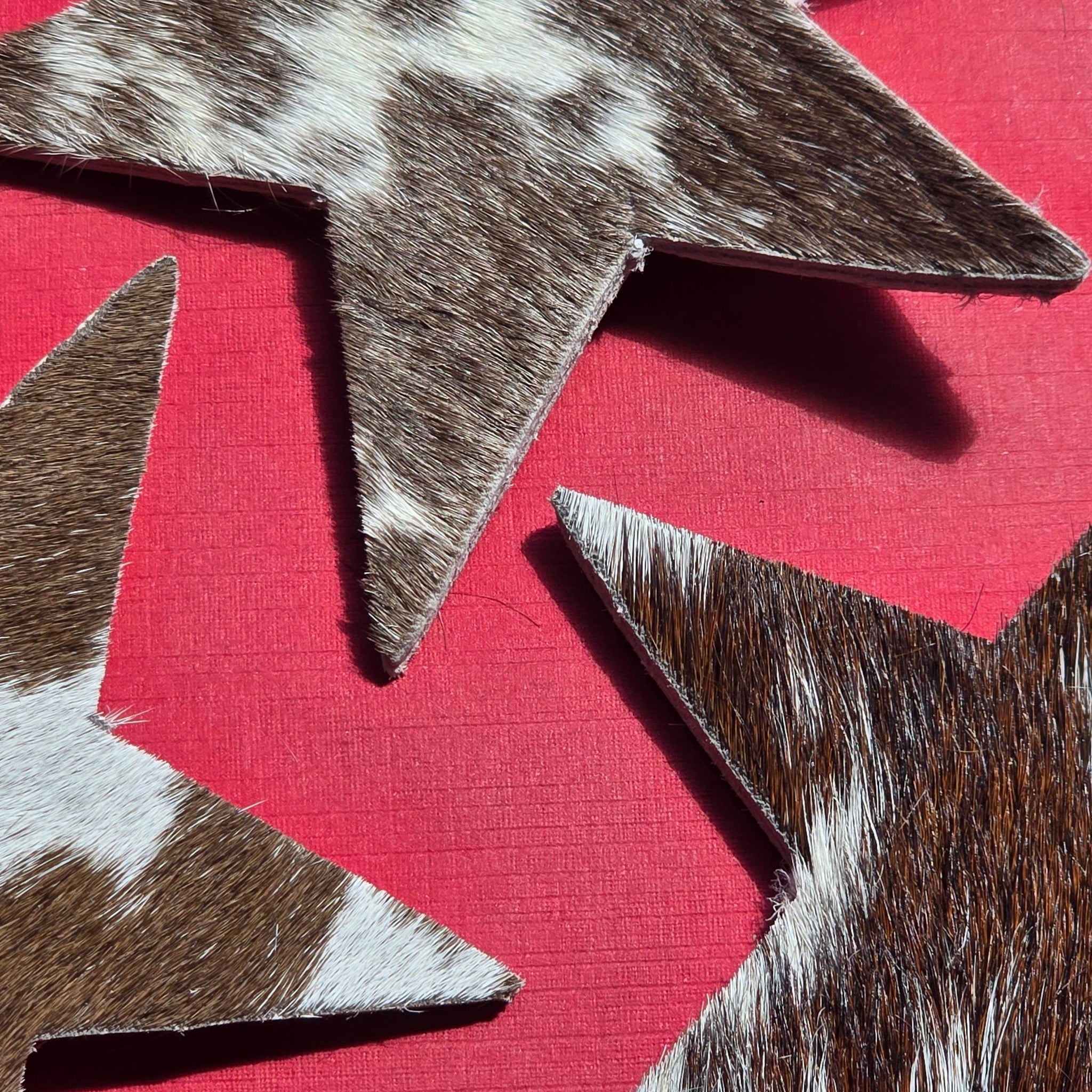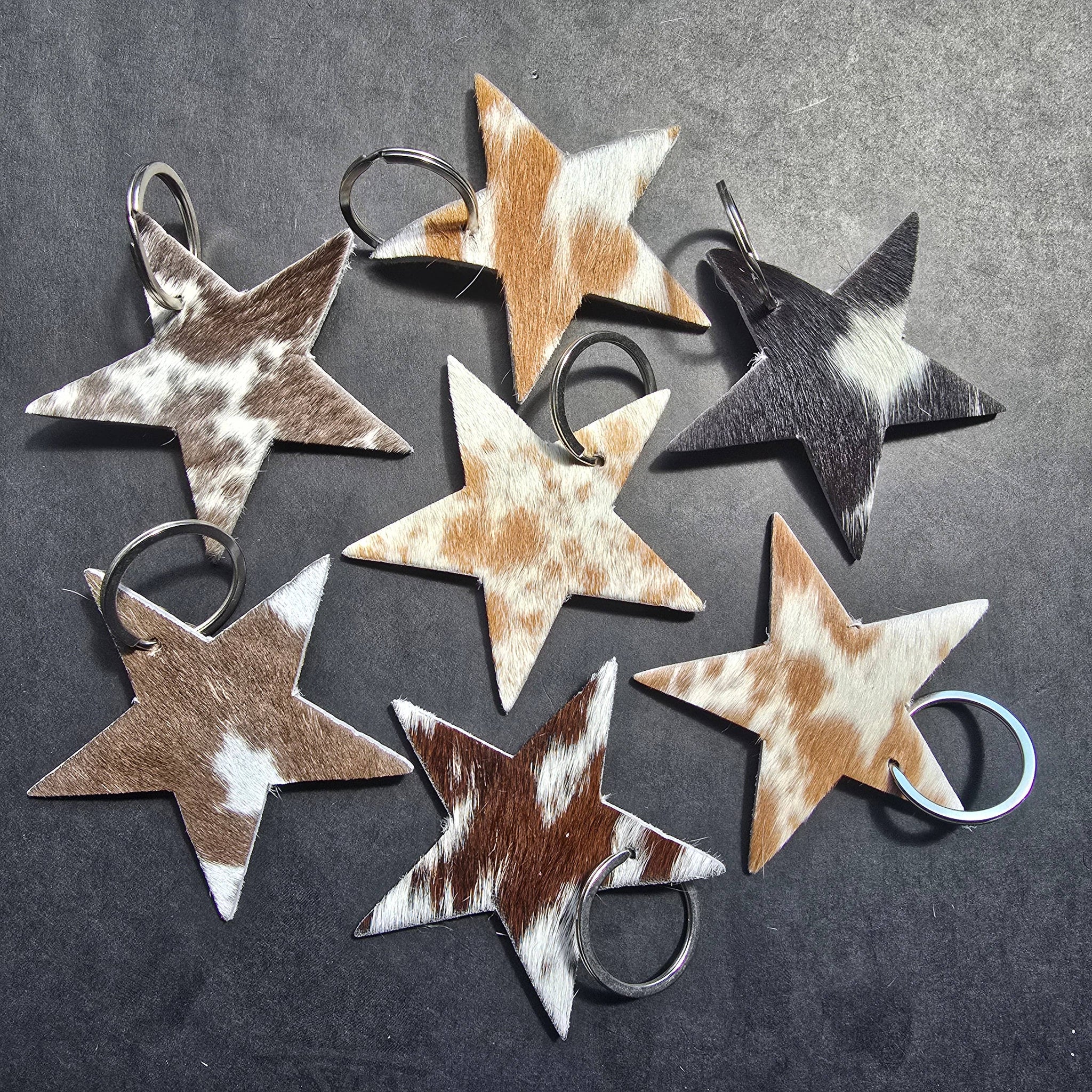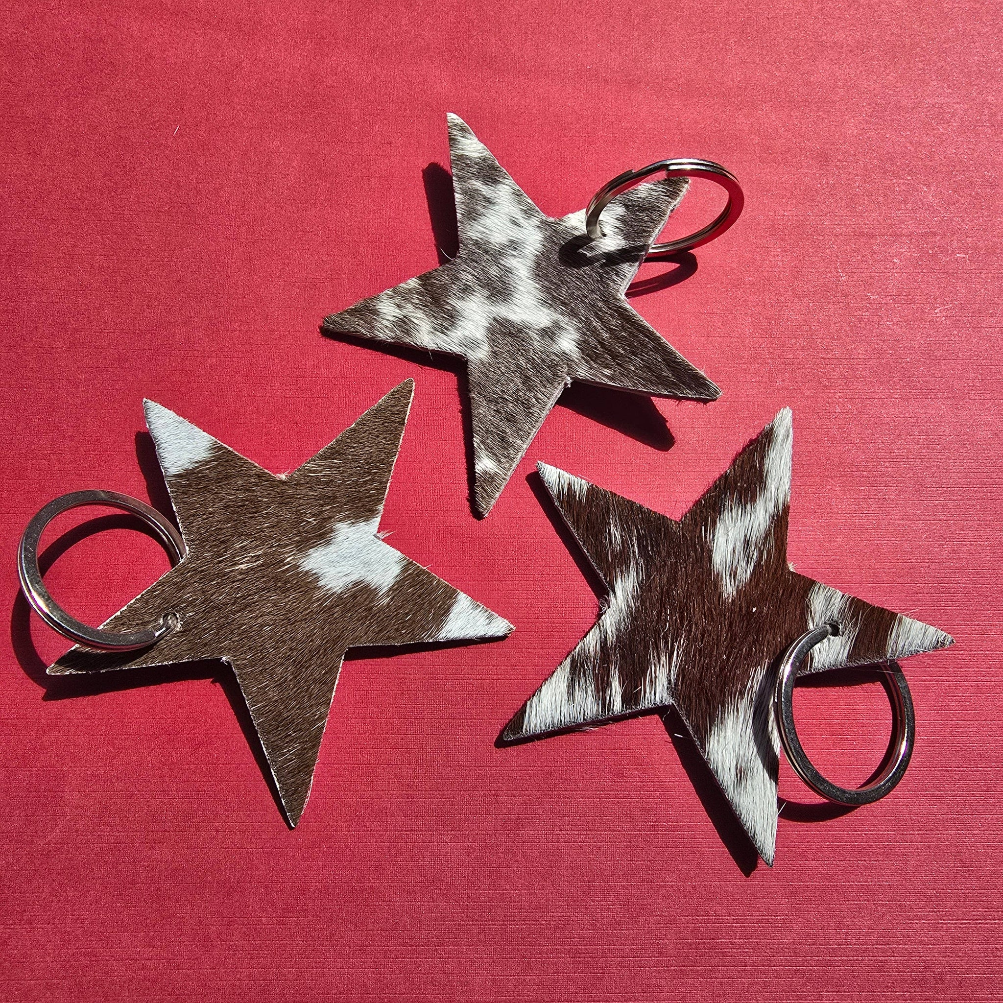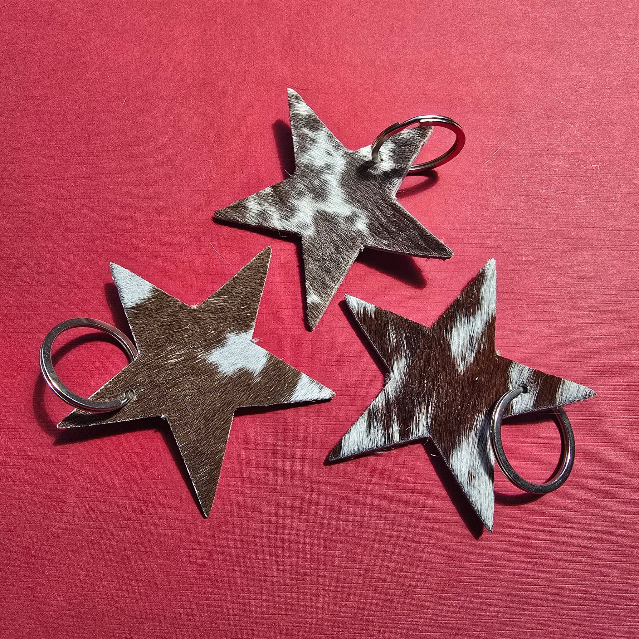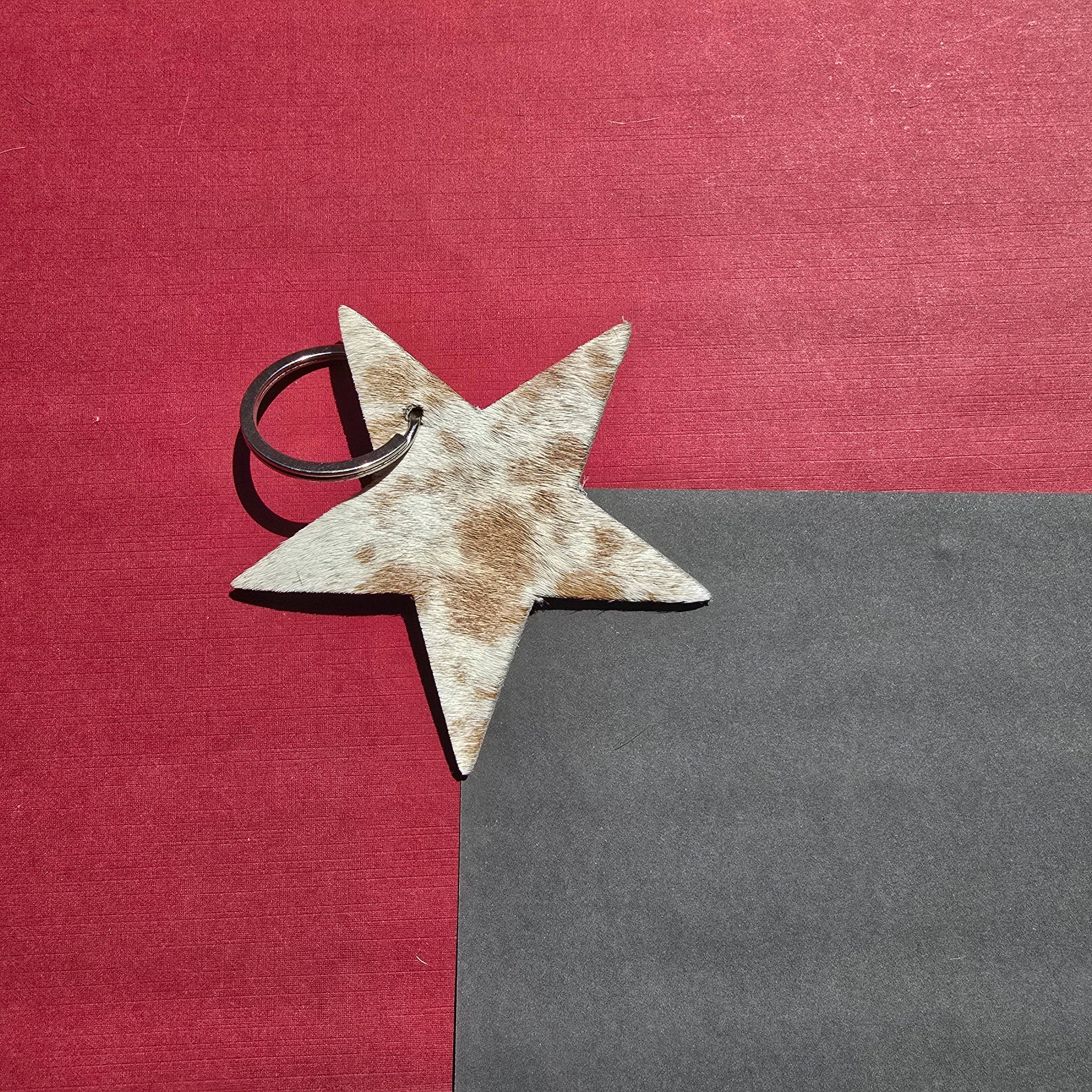 Add a touch of the West to your everyday with this handcrafted cowhide star keychain. Made from genuine hair-on cowhide in rich brown tones, each piece features natural variations that make it uniquely yours. The classic five-point star shape (approx. 3.25" tip-to-tip) blends rugged character with artisanal craftsmanship.
