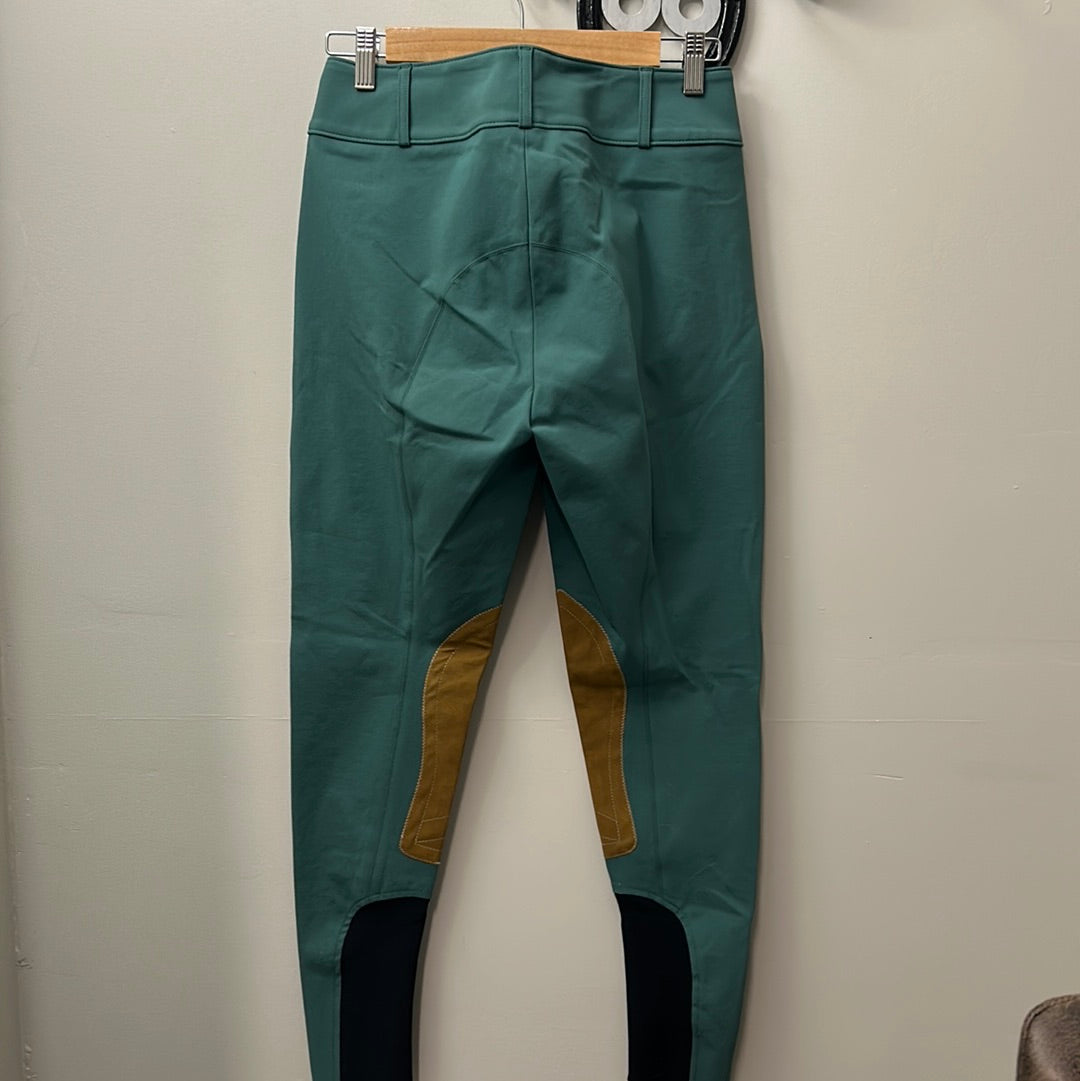 The new fabric allows for a form-fitting figure-flattering look while maintaining its shape and moving with you while you ride. Lightweight, woven 73% cotton/20% polyamide /7% Lycra, with four-way stretch for comfort. Classic European leg seams on the outside of the breech, vintage clarino knee patches, front zip, front slash pockets, and belt loops.