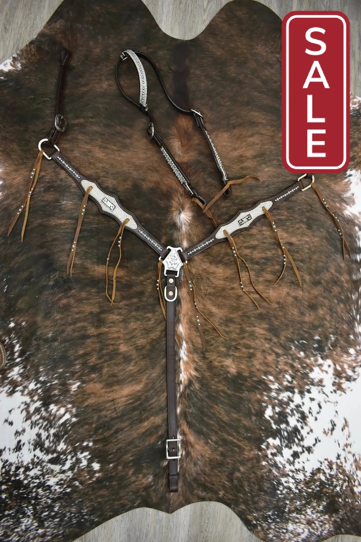 Step into the world of western craftsmanship with RR Turquoise Desert Tack Set. Adorned with stunning turquoise stones and featuring a captivating southwestern design, each piece is handcrafted to perfection. The completed look features a one-ear headstall and a matching breastplate with leather tassels.