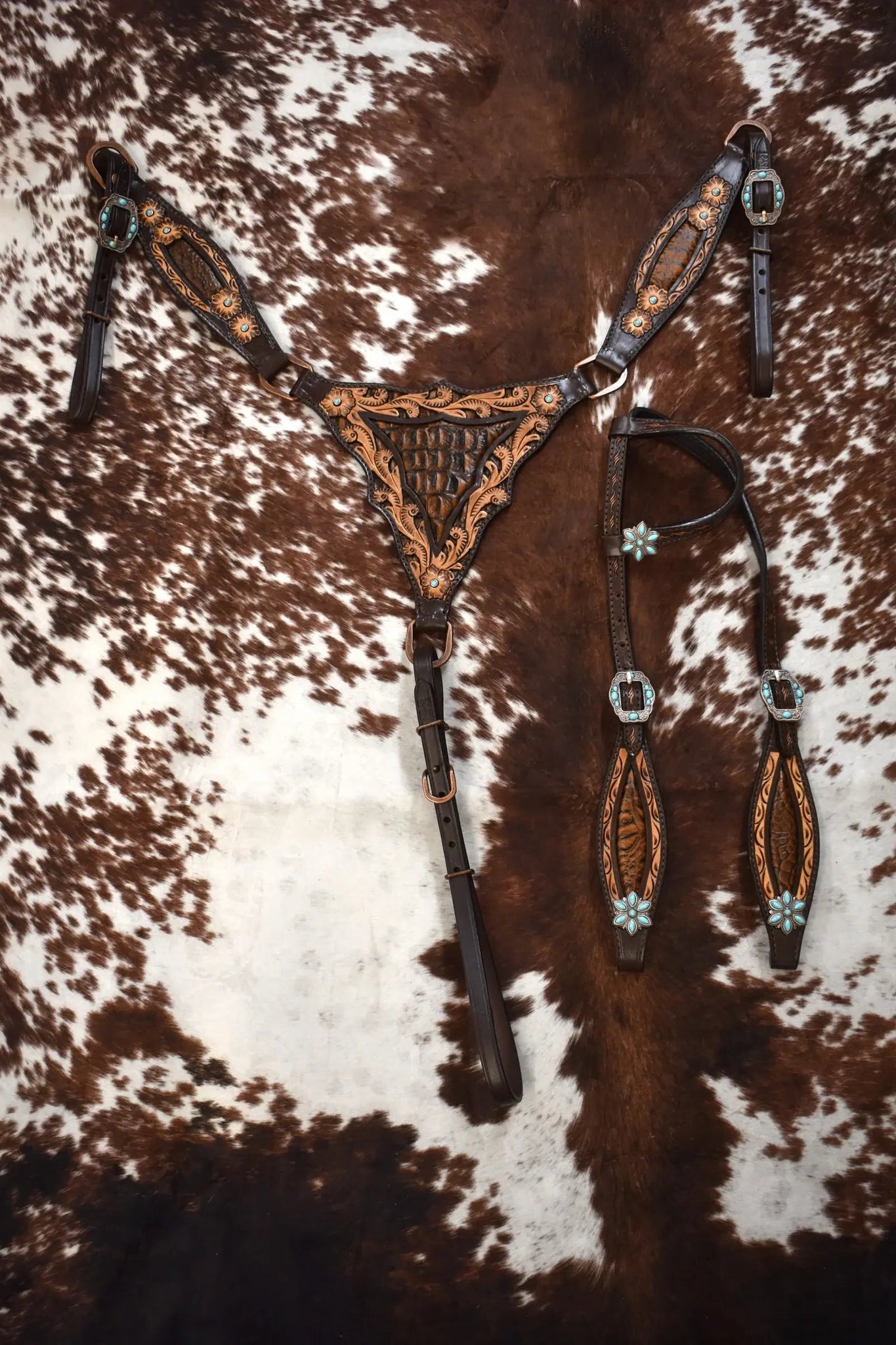 If you want quality leather with that simple bit of flair. This tack set with an alligator accent might be just what you're looking for! The turquoise flower conchos are the perfect touch of color to this already stunning set! This set is sold complete with the one-ear headstall and matching breast collar.