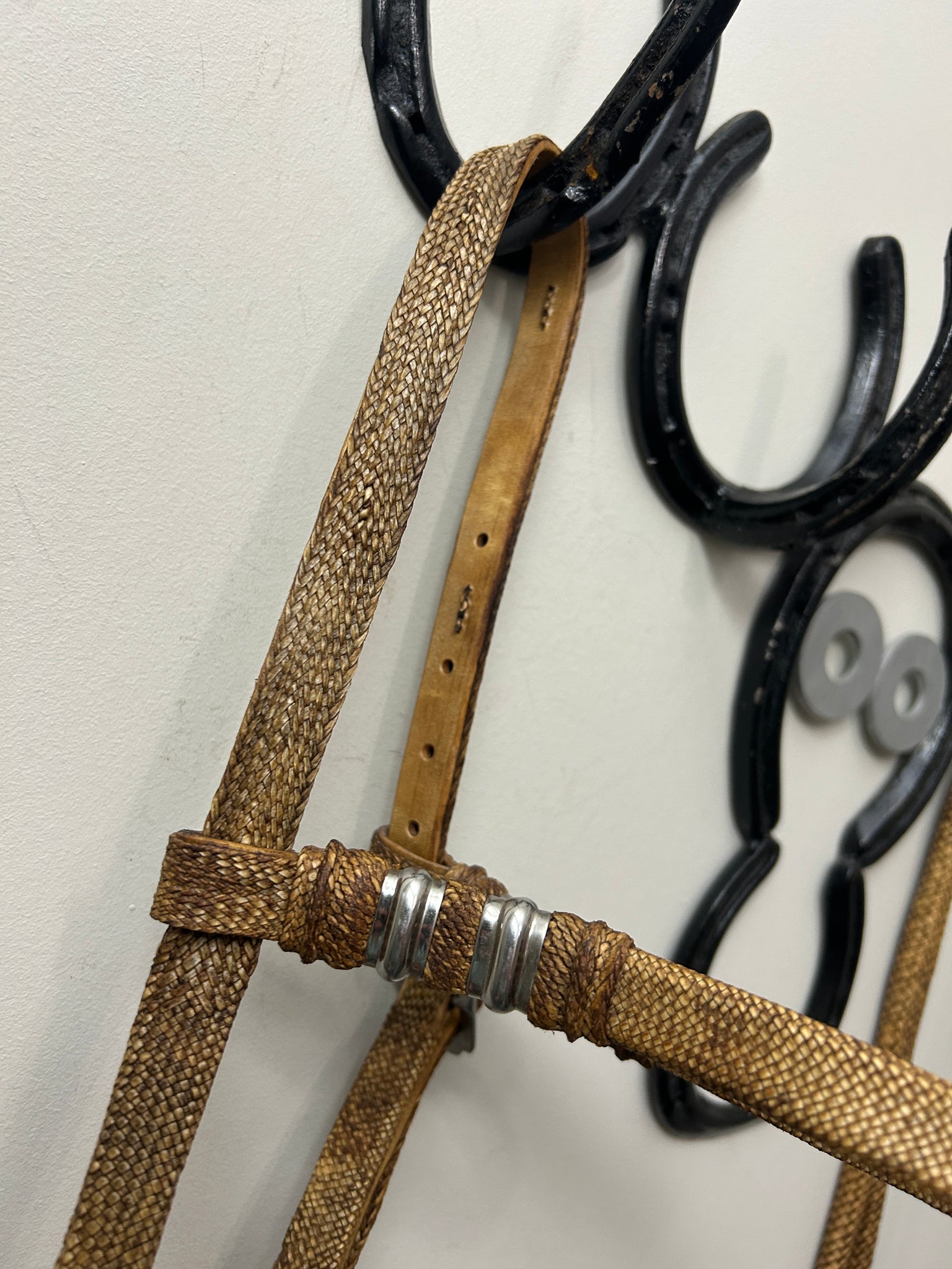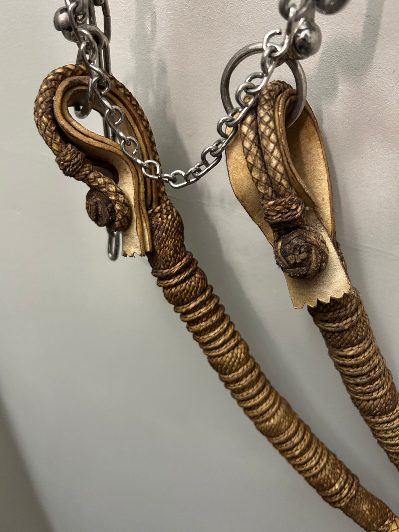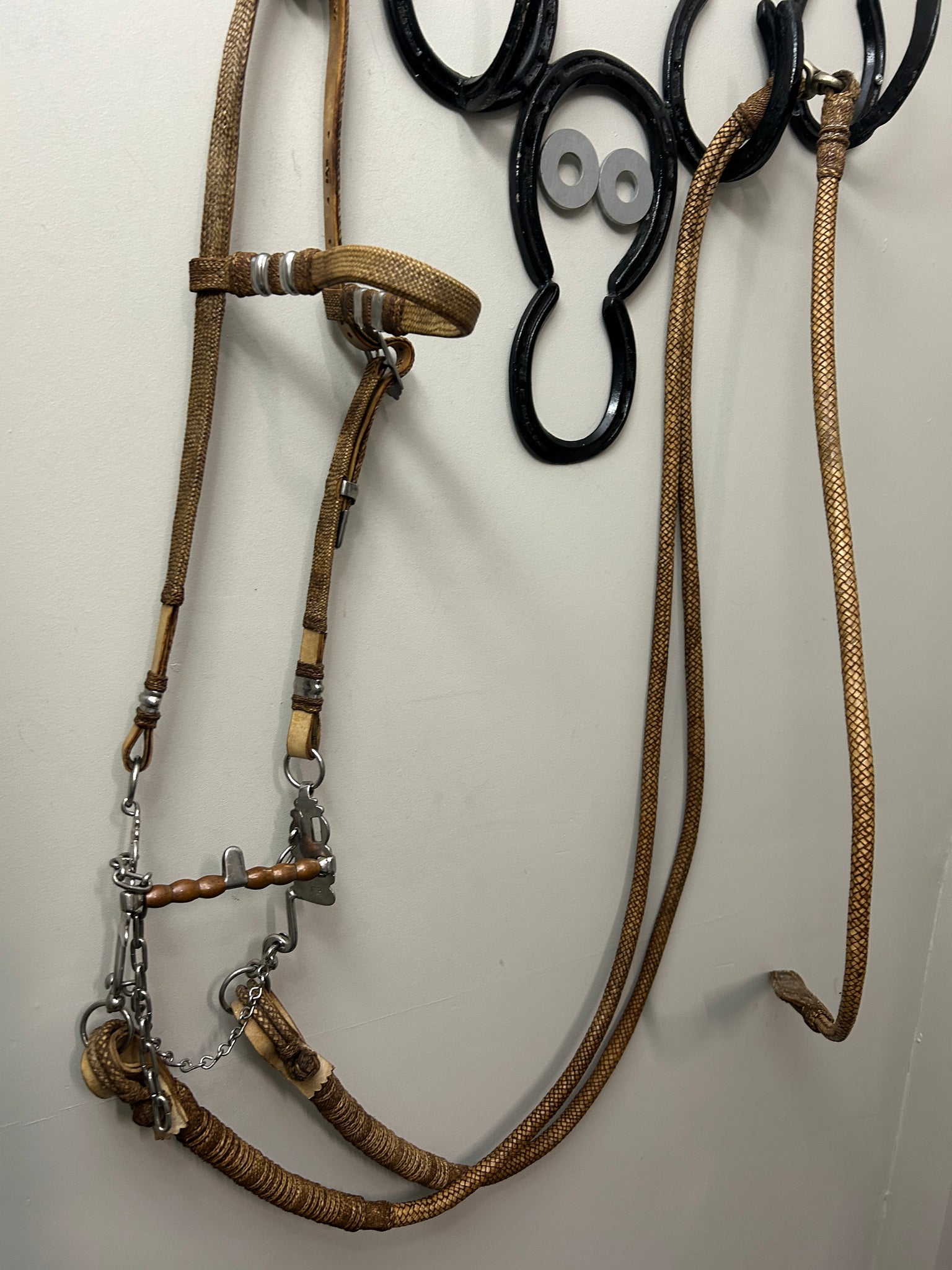 While this bridle carries no maker’s mark, it reflects the authentic design and function of traditional Peruvian Paso tack. The rawhide is a bit stiff from storage and would benefit from some gentle conditioning to restore its suppleness.