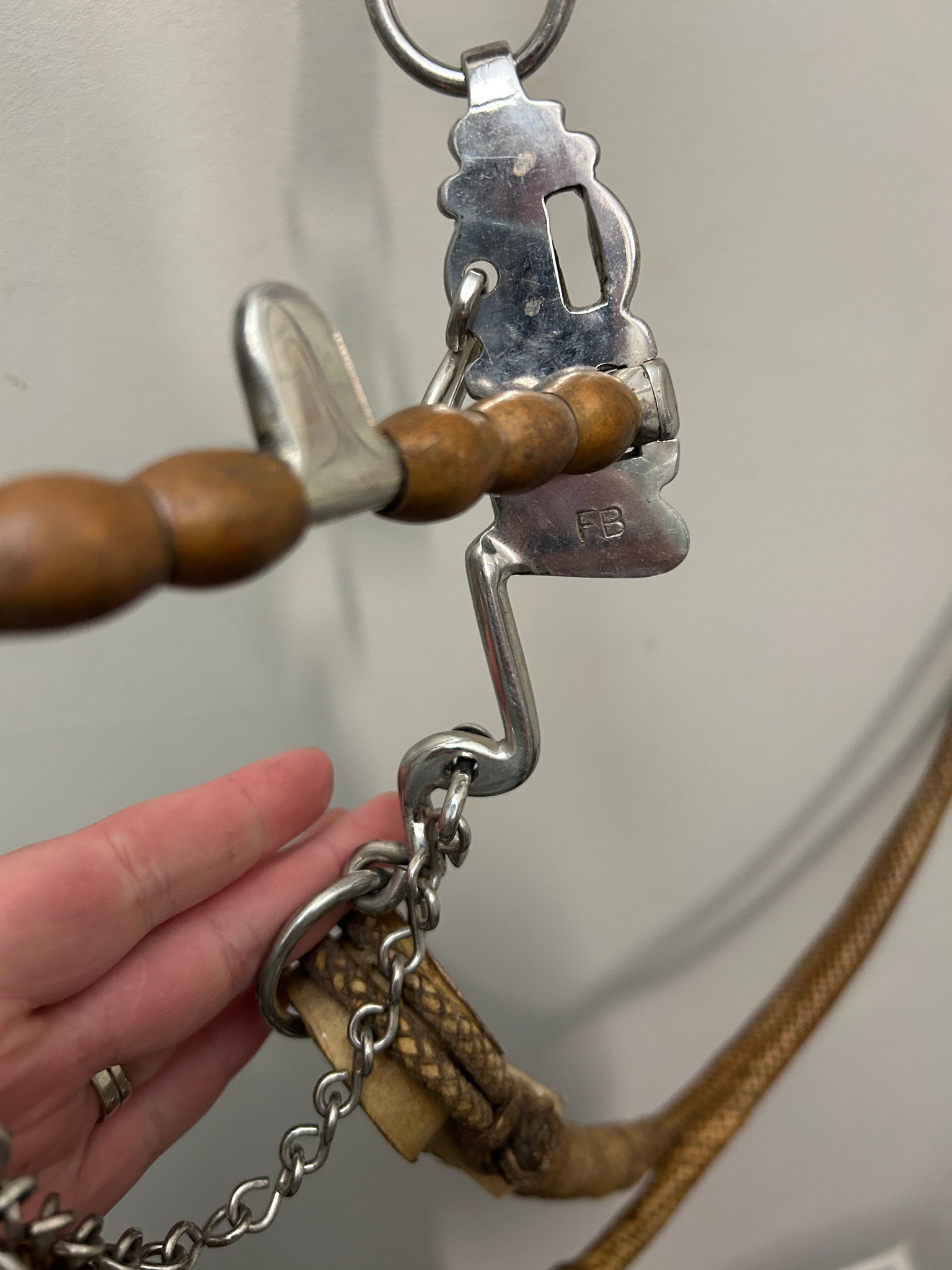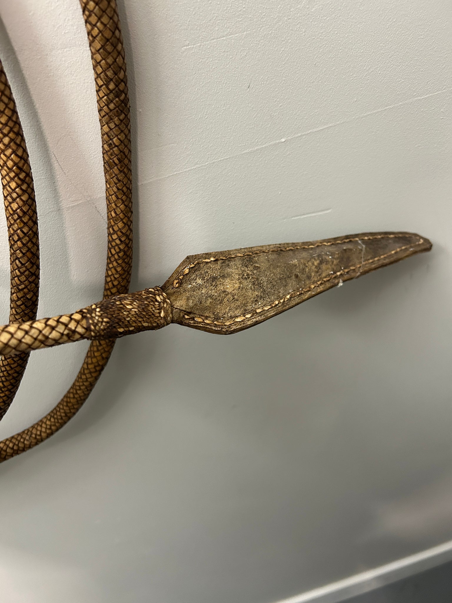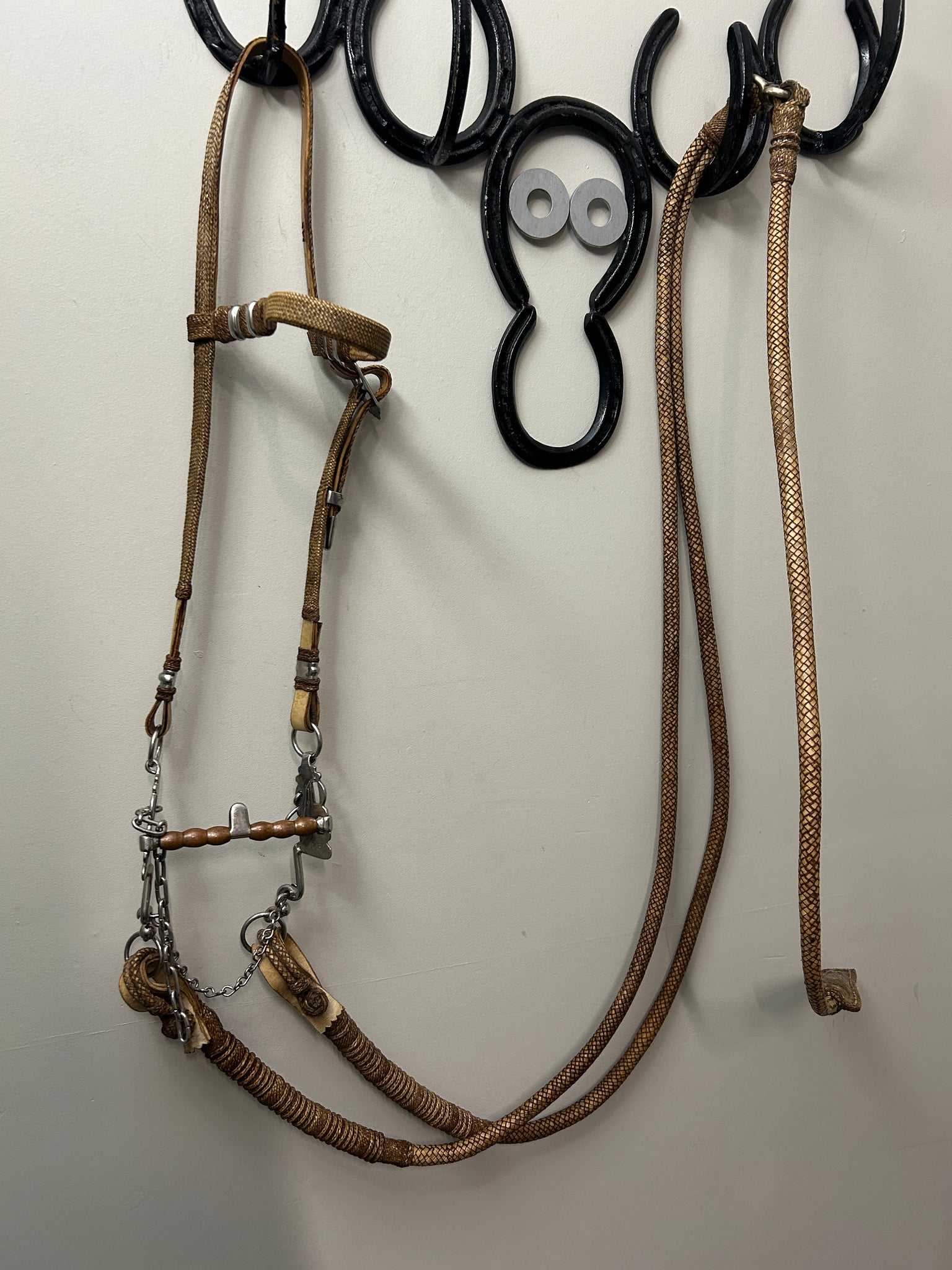 While this bridle carries no maker’s mark, it reflects the authentic design and function of traditional Peruvian Paso tack. The rawhide is a bit stiff from storage and would benefit from some gentle conditioning to restore its suppleness.