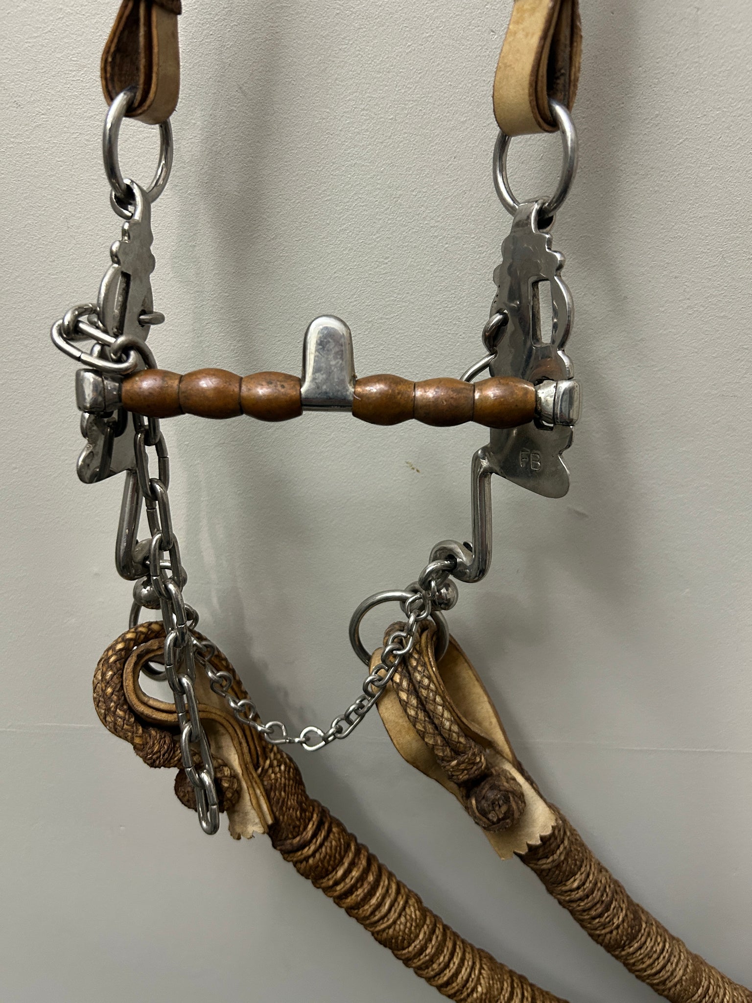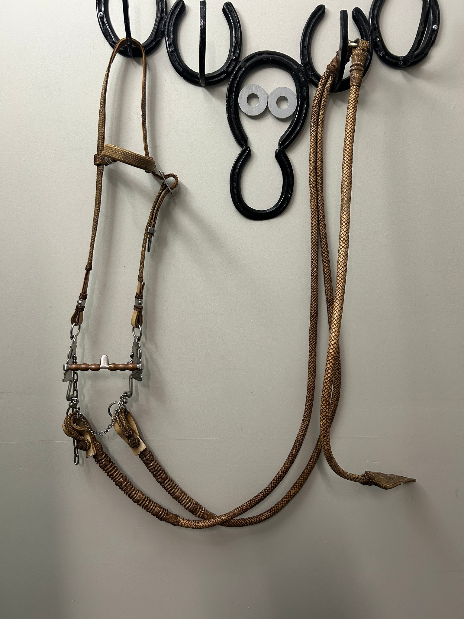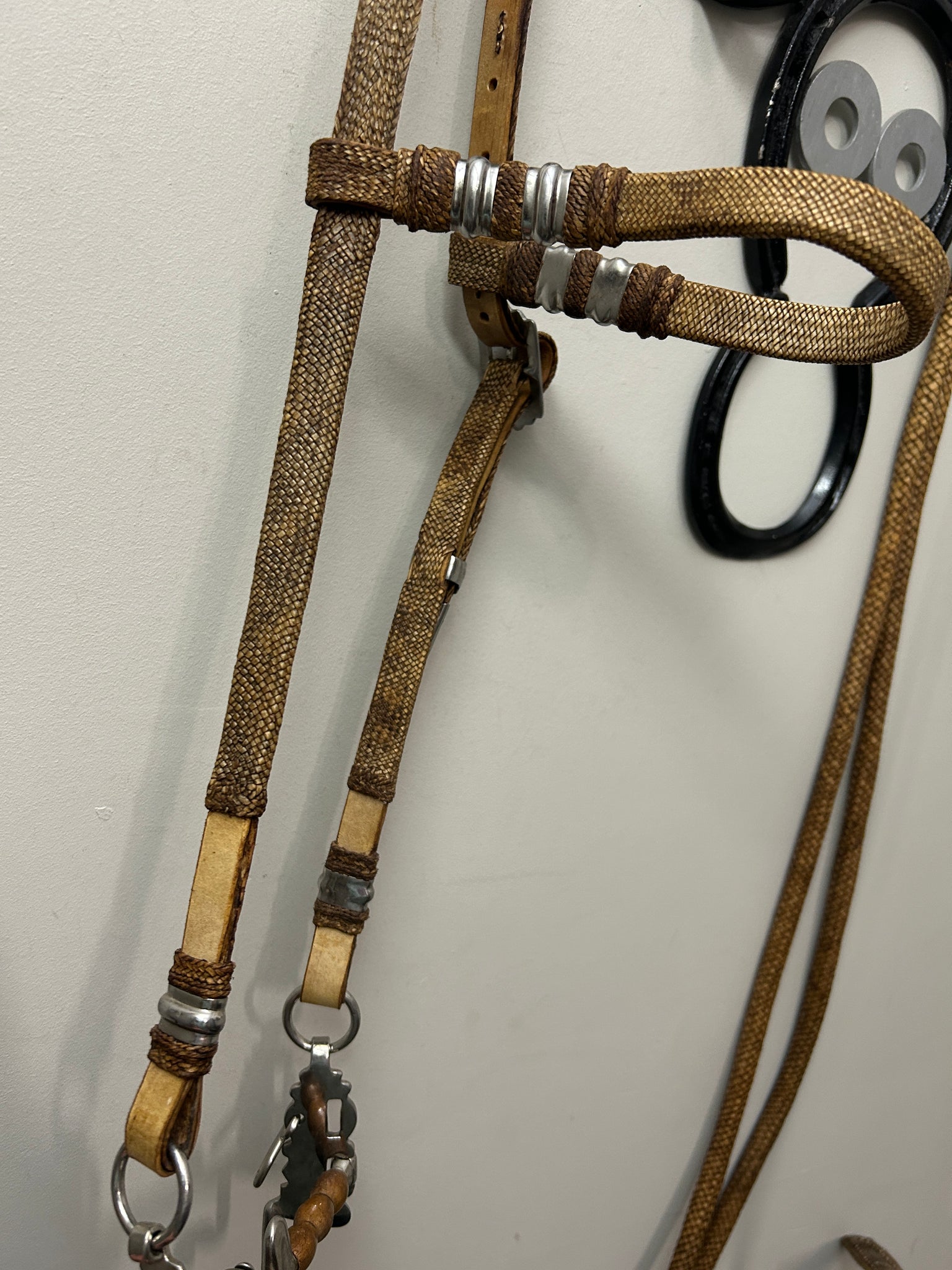 This hand-braided rawhide headstall with matching reins is a beautiful example of traditional South American craftsmanship. Designed in the classic Peruvian Paso style, it features: