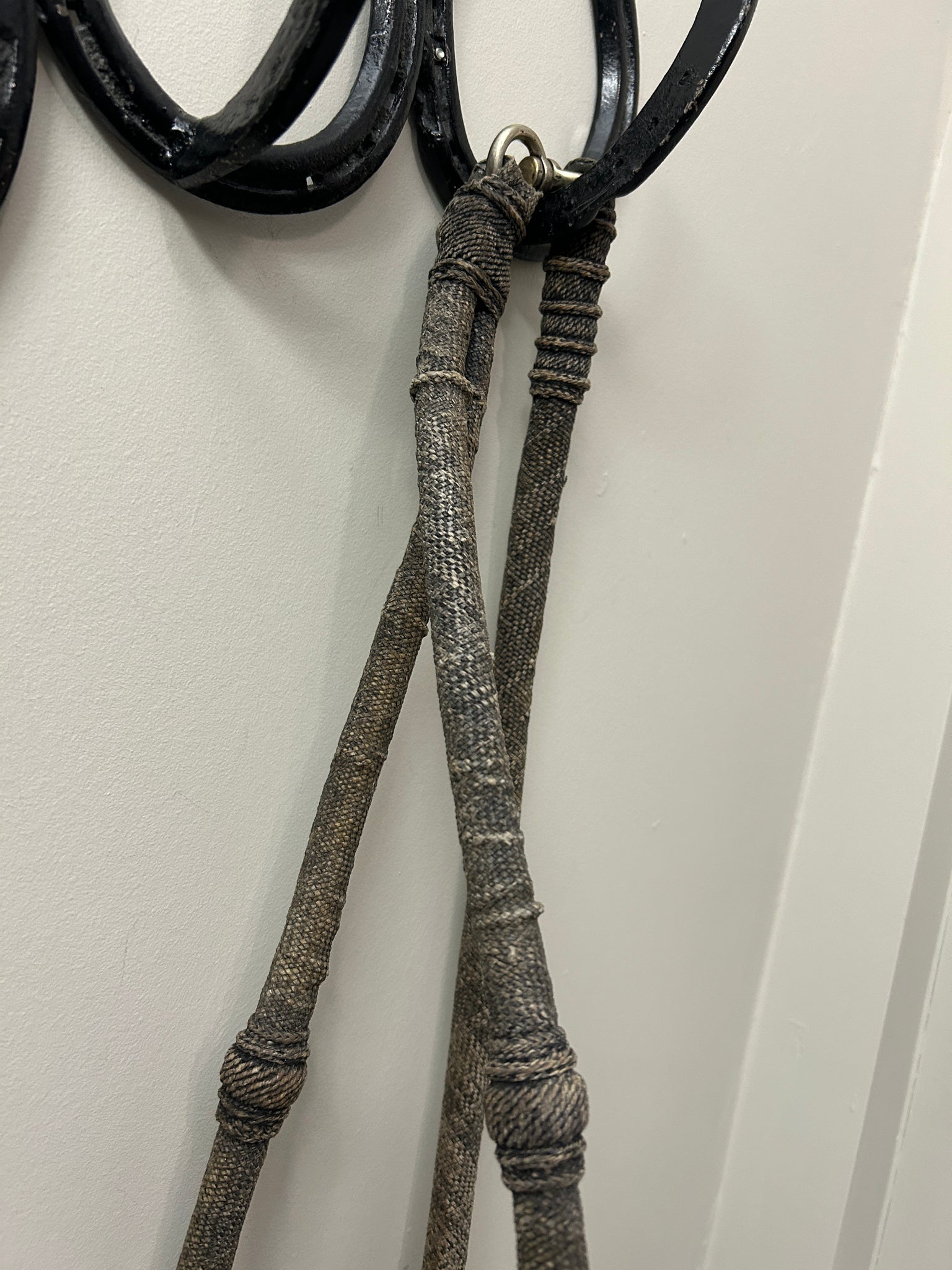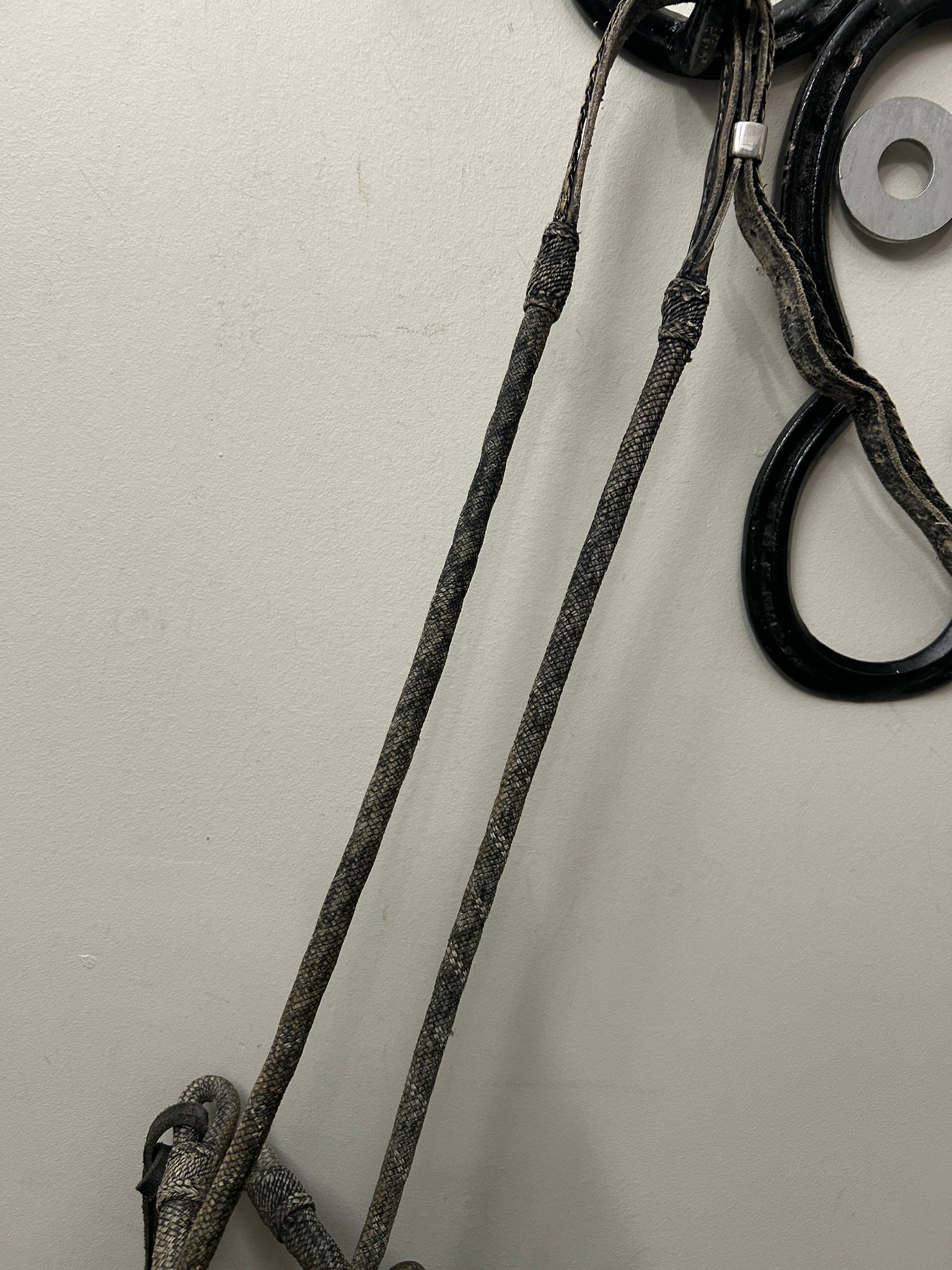 This hand-braided rawhide hanger with matching rommel reins is a beautiful example of traditional South American craftsmanship. Designed in the classic Peruvian Paso style, it features: