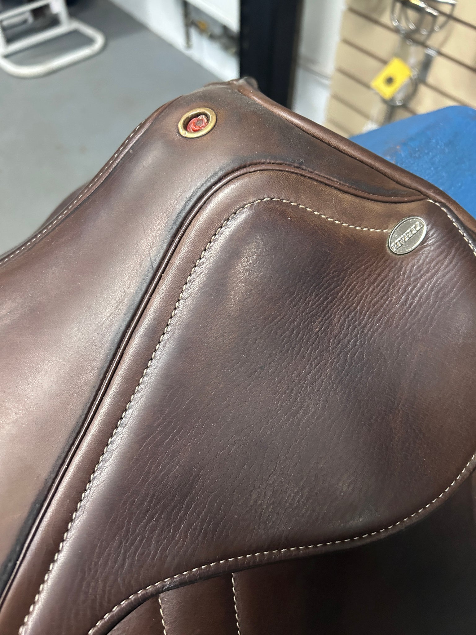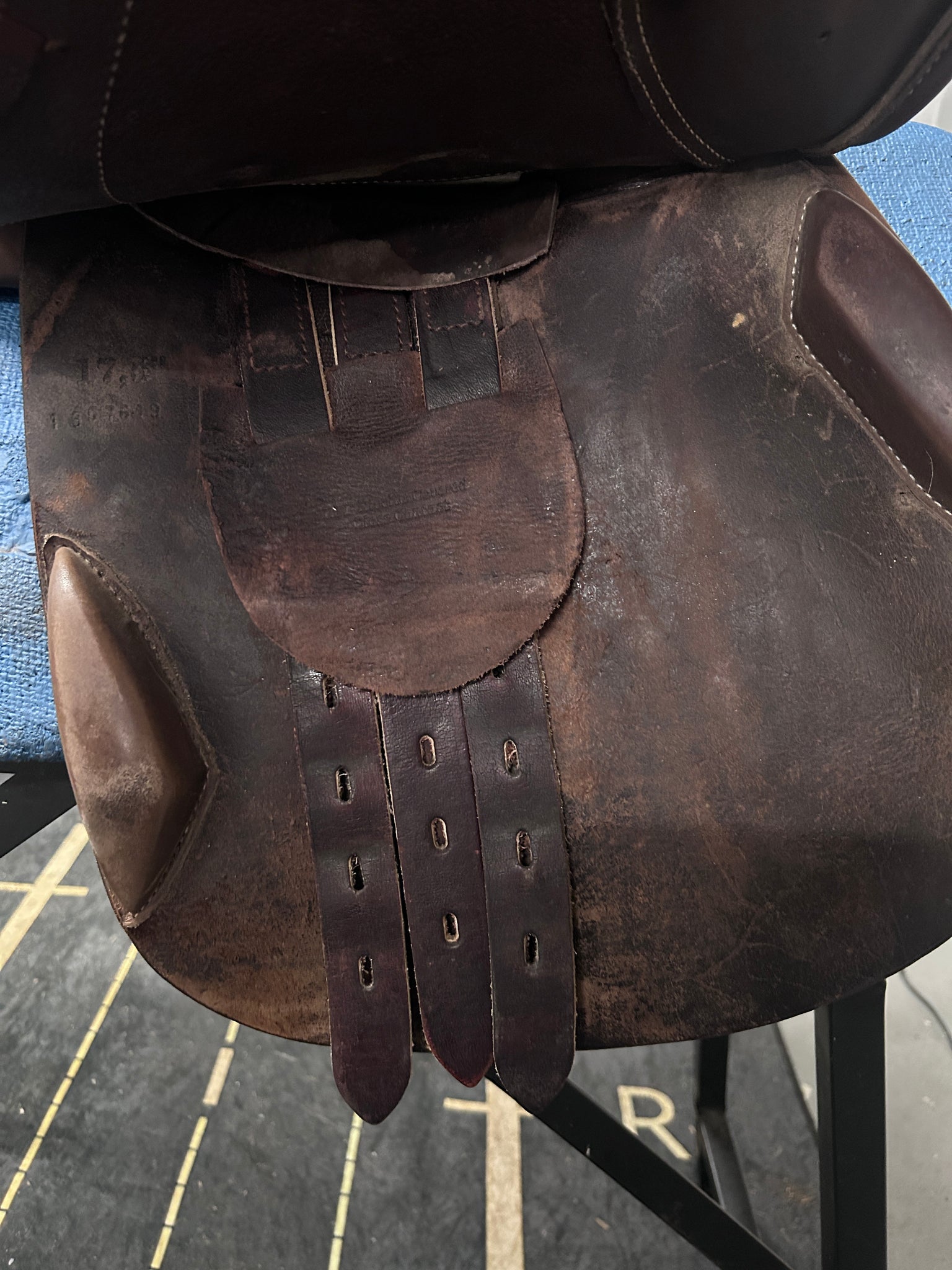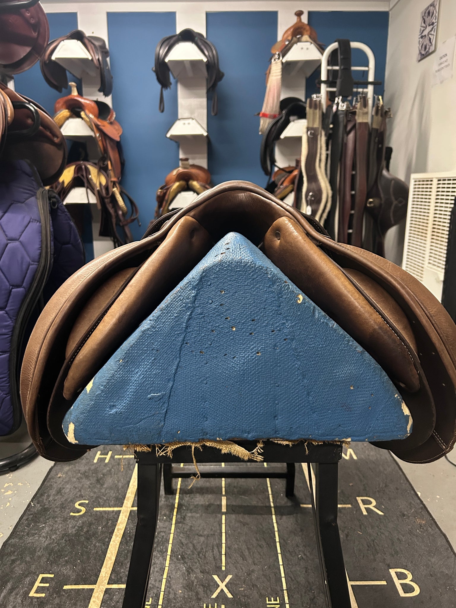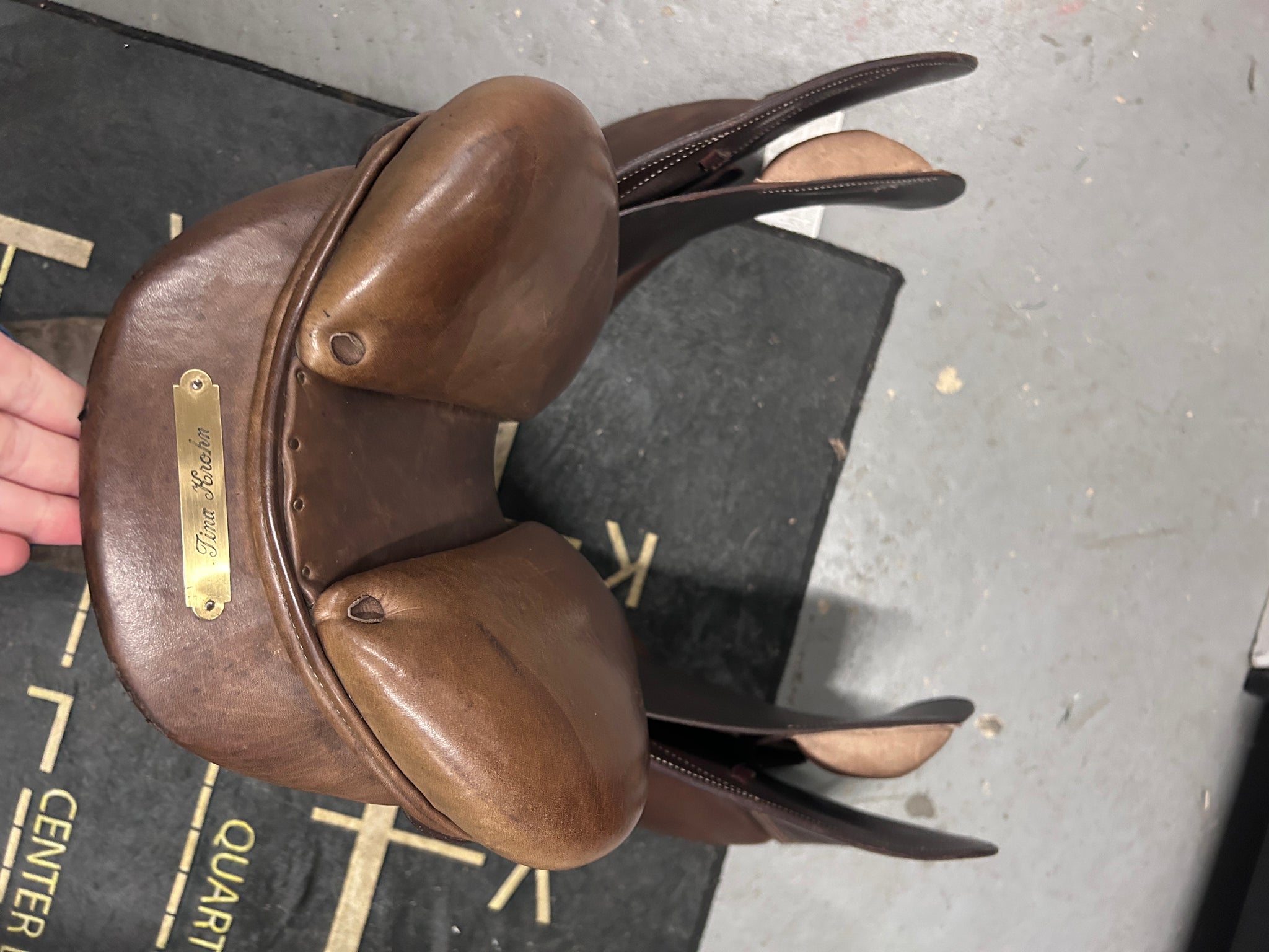 Great all-around English Saddle! This 17.5" HDR Rivella English Saddle has an adjustable gullet to help fit a range of horses, called the Rotate-to-Fit system. Simply expand or tighten with an allen key on the pommel. The seat does measure smaller, closer to a 17". Flaps measure 14.5" down and 14" across. This saddle is in good used condition, with a few minor scratches.