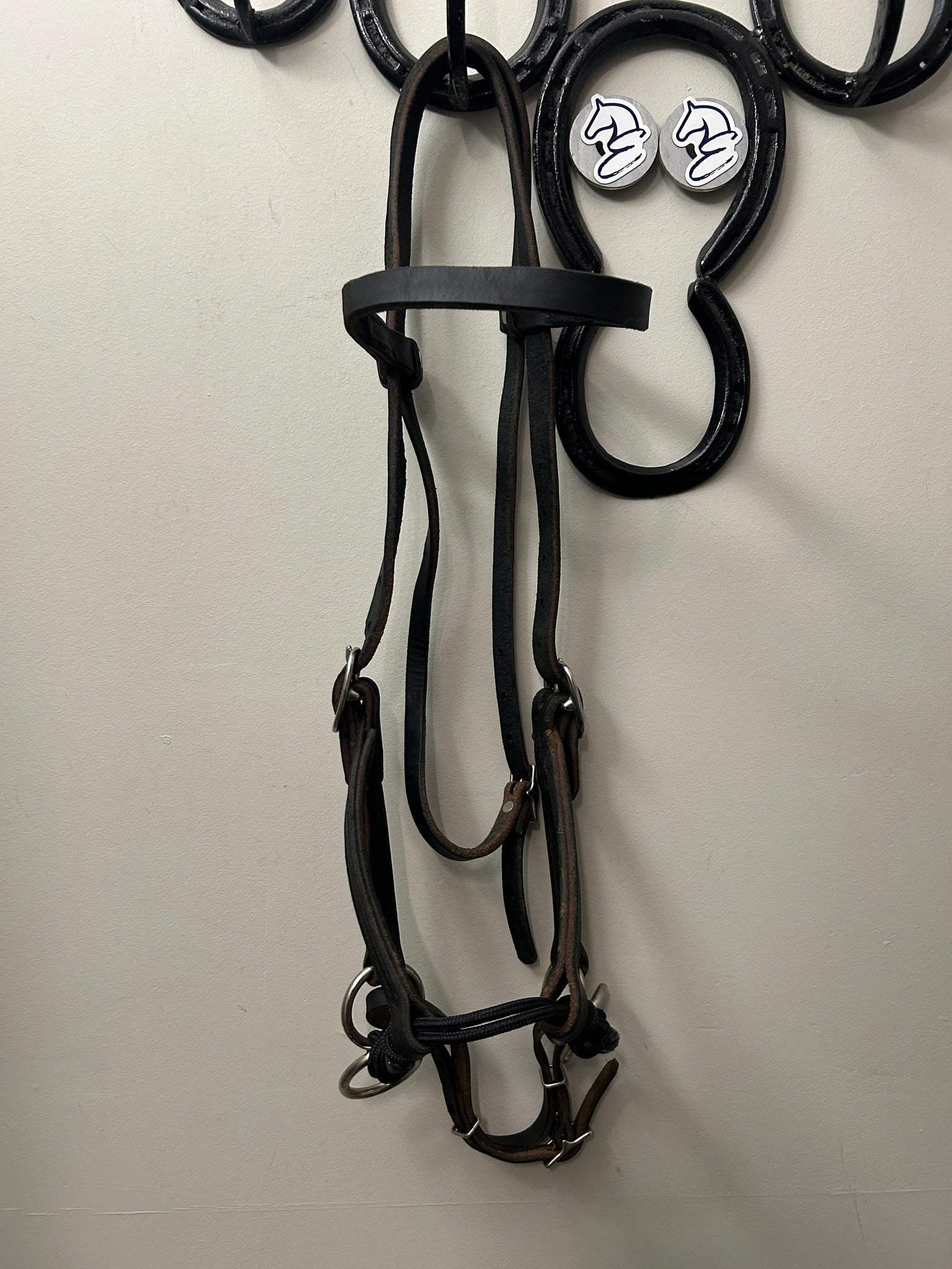 Starting with top quality Hermann Oak® russet harness leather, this bridle is handcrafted using the finest materials and workmanship. We worked closely with Justin on this gentle yet effective design that improves communication between horse and rider by asking horse to respond to pressure instead of force. The nose is constructed from premium tan rope with two strategically-placed knots that encourage horse to give to pressure and seek release. With rawhide loops at crown, non-rust stainless steel cart buckles with black accents at cheeks, and extra strong kangaroo lace ties at bit ends, this bridle looks as great as it performs. Horse size.
