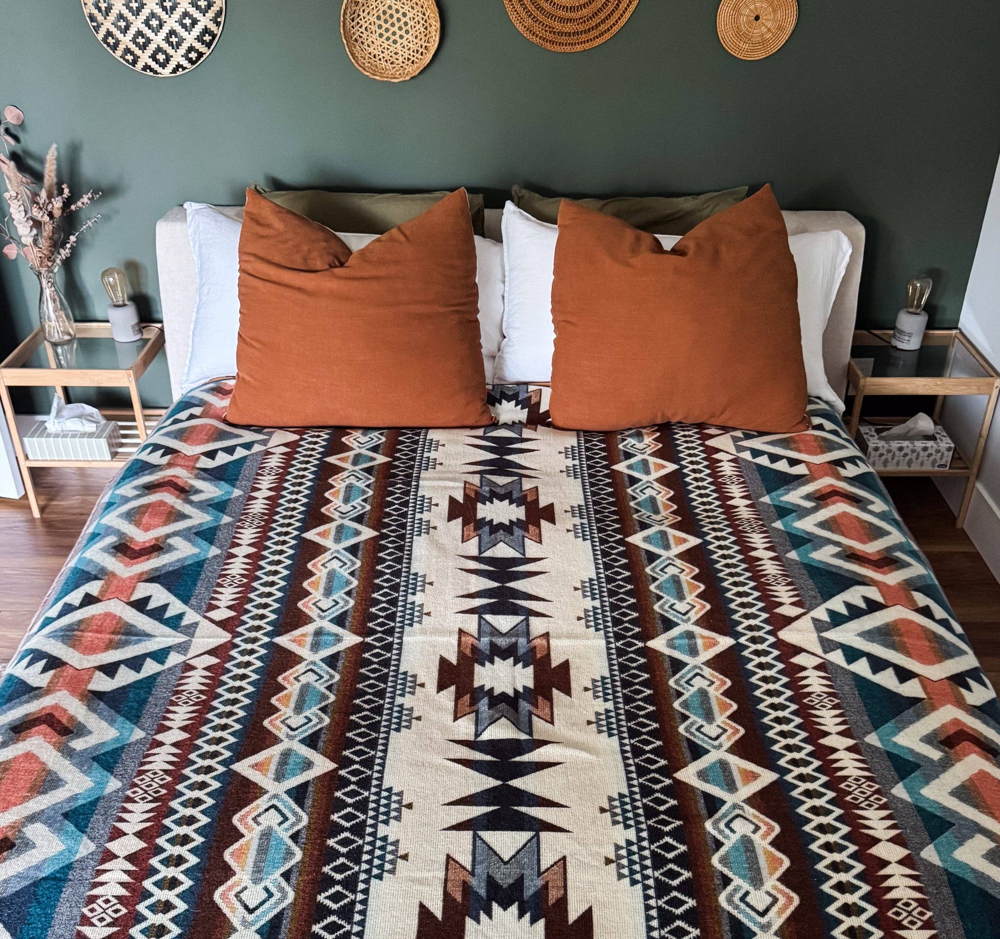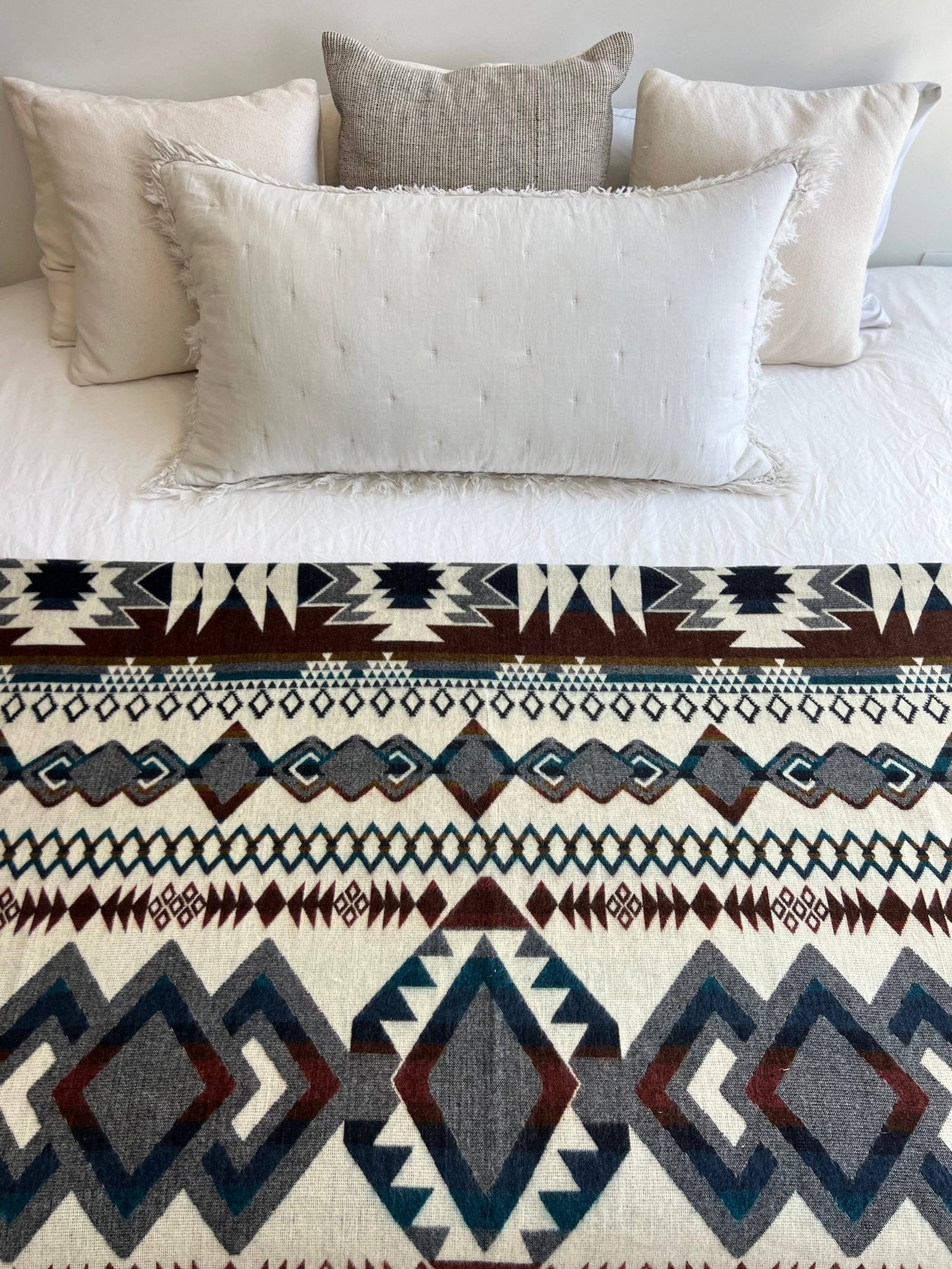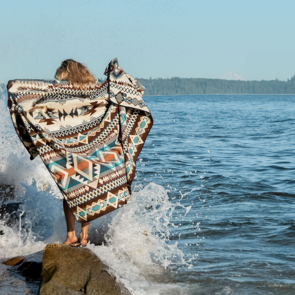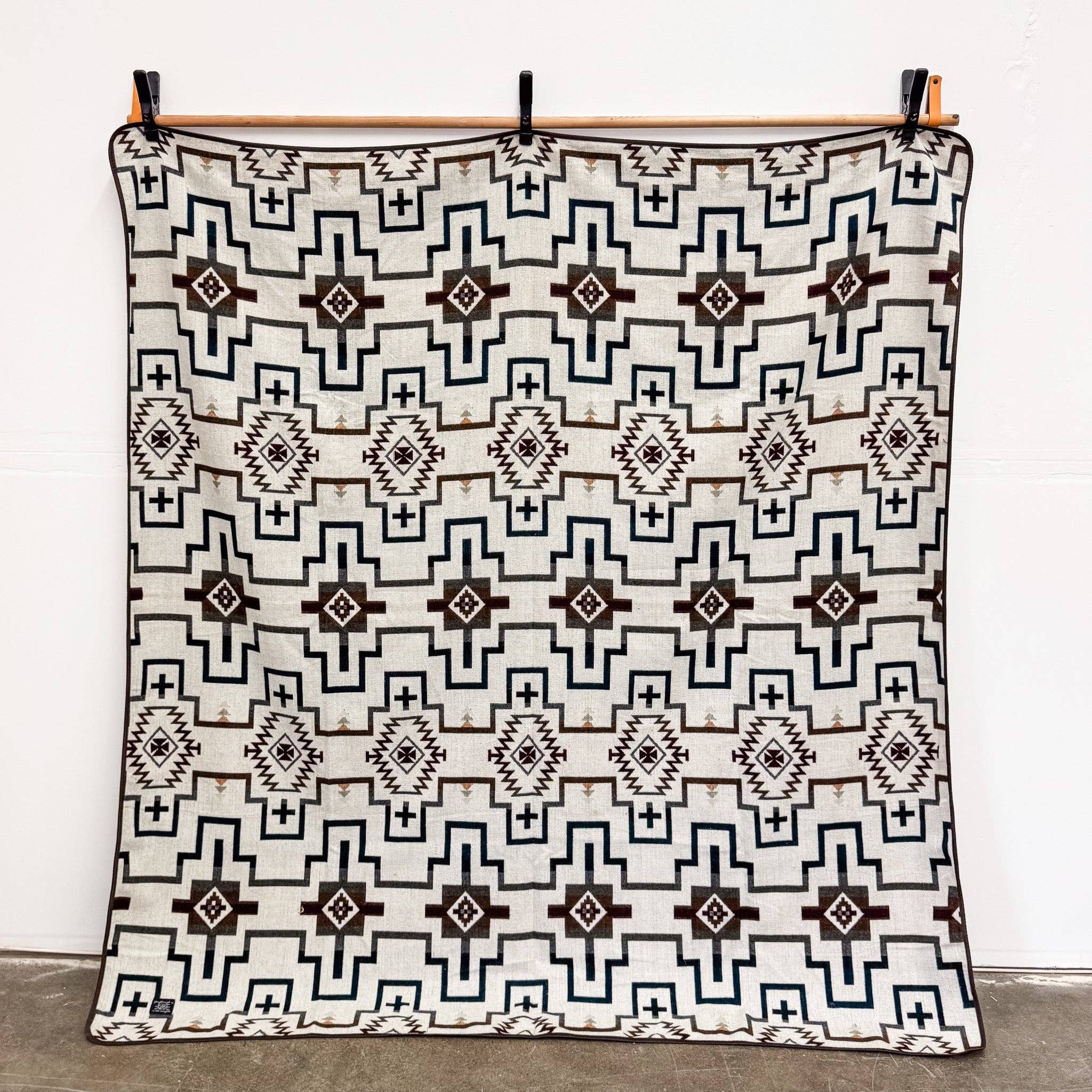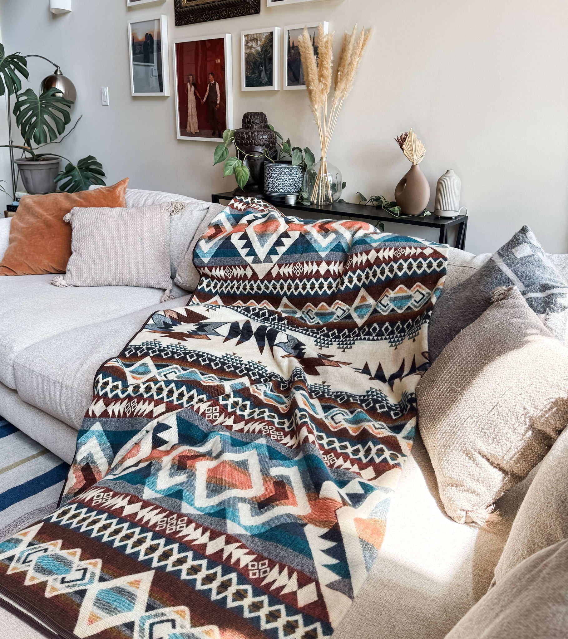 Crafted from a recycled acrylic blend with clean trim edges, this blanket is ultra-soft, lightweight, and designed for all-season comfort. The striking Aztec-inspired design is fully reversible, offering two distinct looks in one, making it as versatile as your lifestyle—an accent for your bedroom, a cozy companion for movie nights, or a trusted travel blanket for spontaneous adventures.