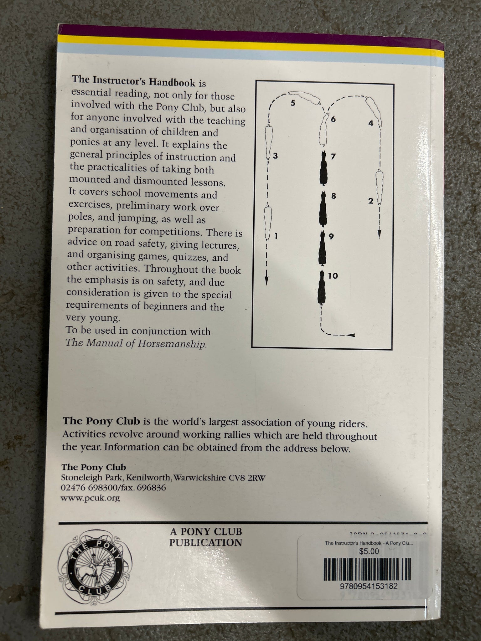 This is the official manual for Pony Club instructors and aimed at anyone teaching children to ride at any level. It explains the general principles of teaching, and the practicalities of organizing both mounted and dismounted lessons. It also covers school movements and exercises, peliminary work over poles, and jumping, as well as basic preparation for competition work. There is advice on road safety, giving lectures, and organizing games, quizzes and other activities.